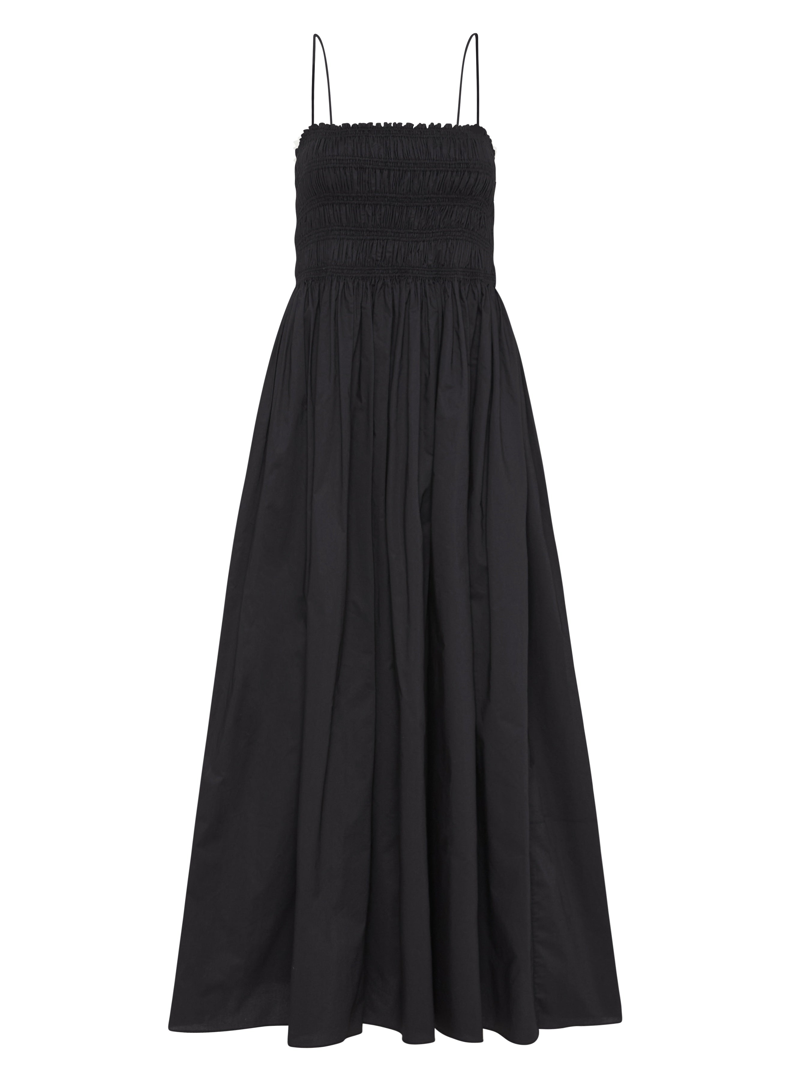 Matteau Shirred Bodice Dress in Black. A classic and easy pull-on dress with delicate shoulder straps and repeated double elastic shirred detailing throughout the bodice. Made from our organic cotton poplin, this mid-length style features a self-lined bodice, and is complete with side pockets.