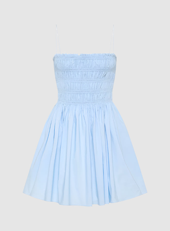Matteau Shirred Bodice Mini Dress in Sky. A mini version of our classic Shirred Bodice Dress. An easy pull-on dress with delicate shoulder straps and repeated double elastic shirred detailing throughout the bodice. Crafted from our organic cotton poplin and completed with side pockets, this dress is perfect for hot summer days.