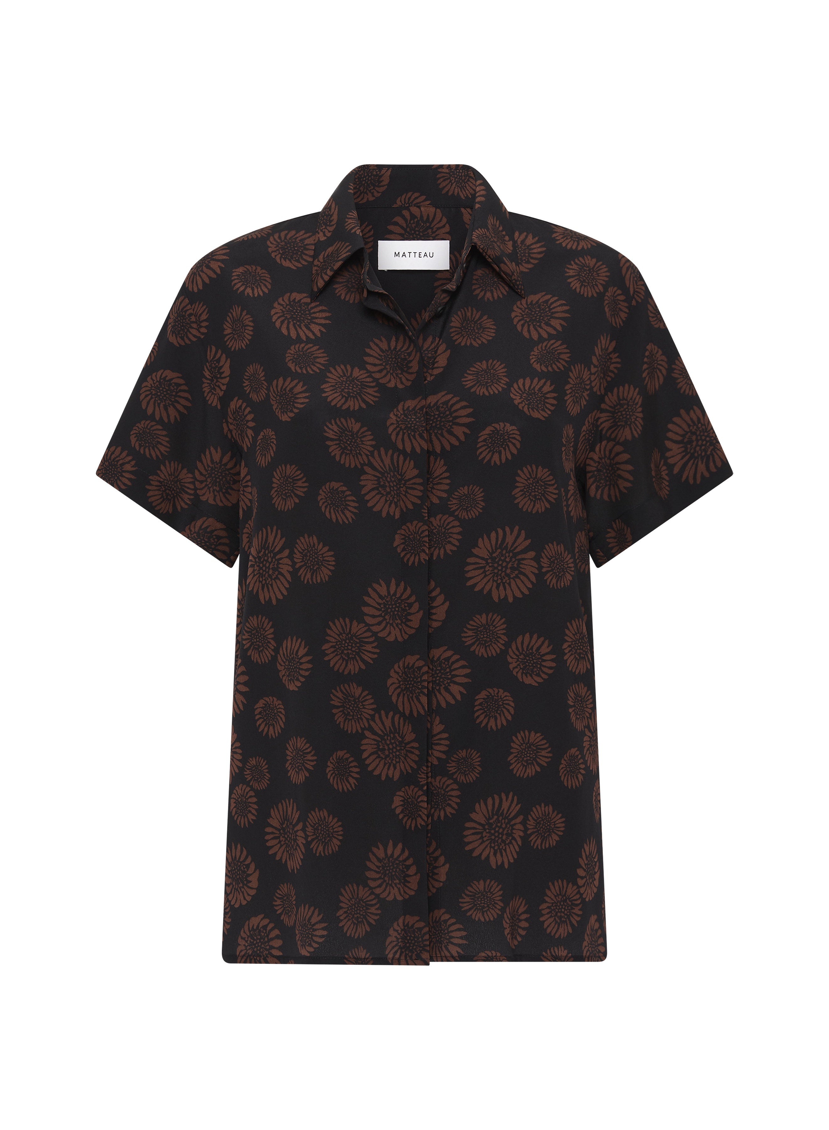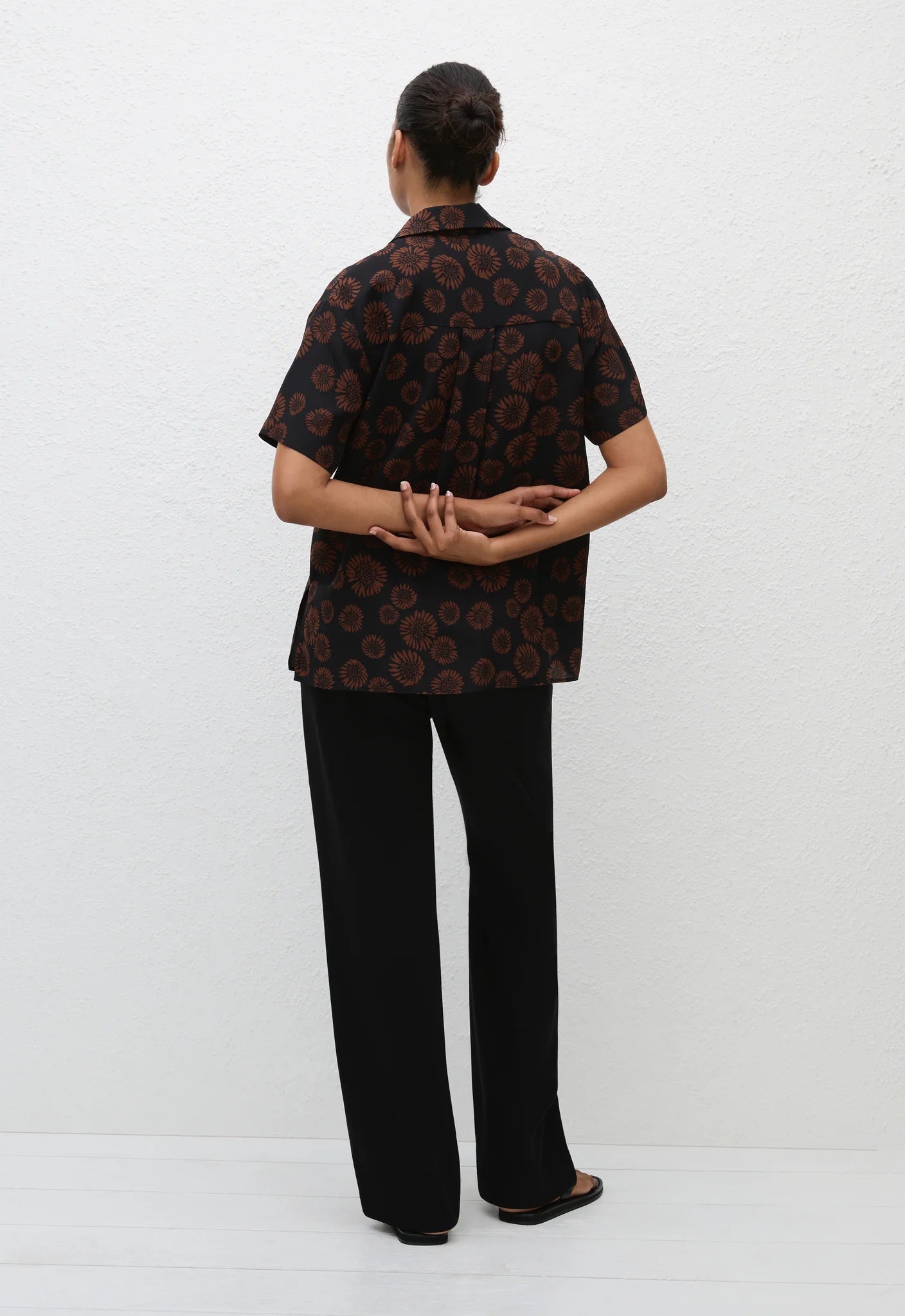Matteau Short Sleeve Shirt in Panama. Easy without compromise, this oversized short sleeve shirt was inspired by a vintage men's style. Made from our silk crepe de chine, it has an exposed button placket and side splits. Style as a set with the matching Drawstring Trouser, or wear tucked into our Relaxed Crepe Pant for an elevated evening look.