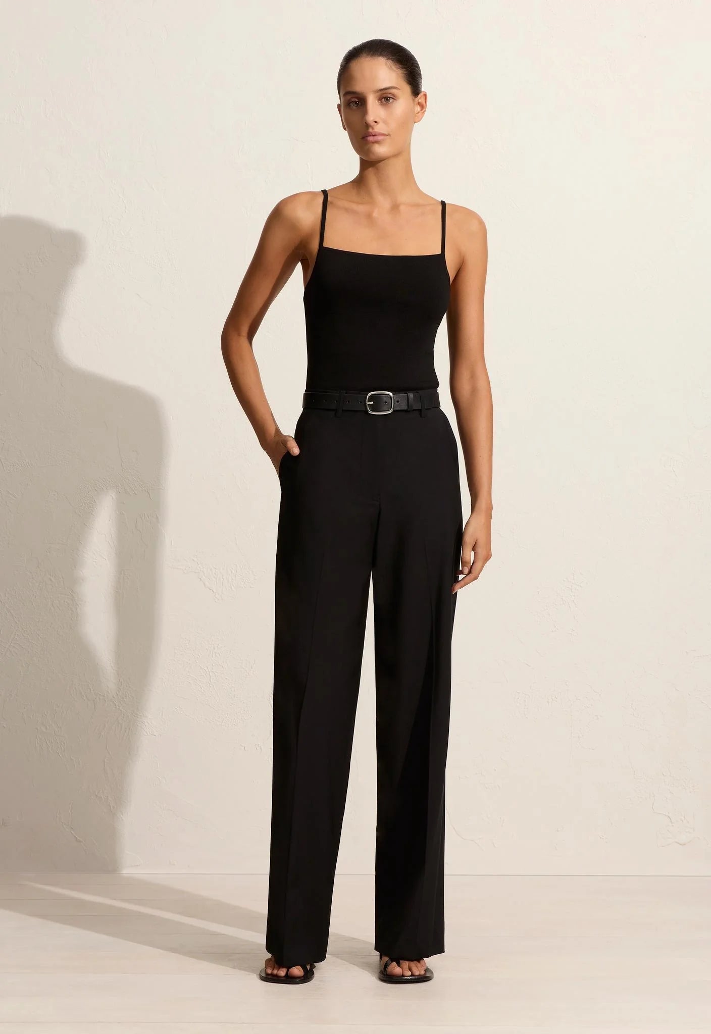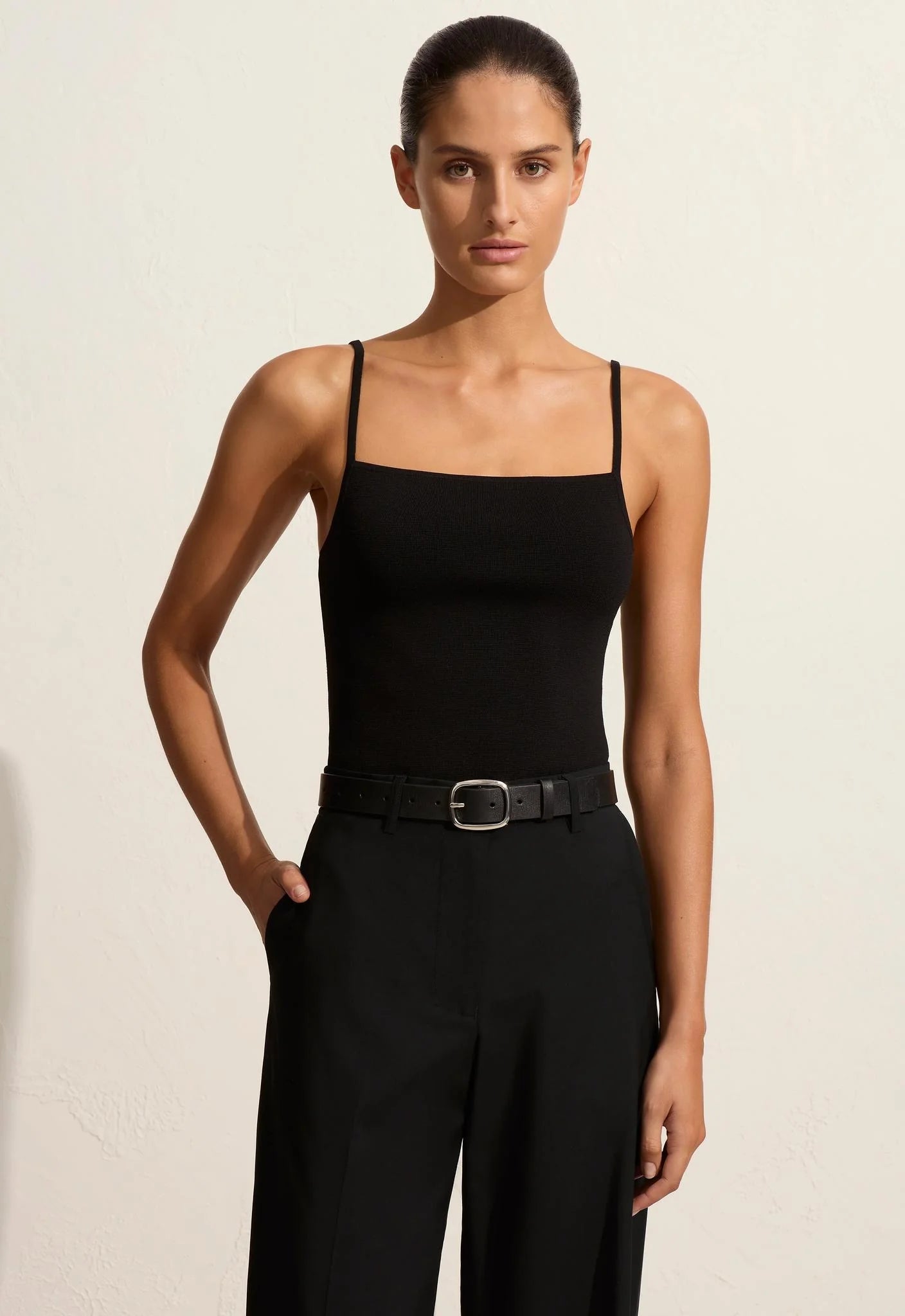 A timeless, semi-fitted knit top with a square neckline, fine straps and tubular detailing across the neckline ensuring a smooth and flattering fit. Made from a bandage knit dry handle viscose blend, this versatile top lends itself to all occasions. Pull together with our Relaxed Tailored Trouser and Silba Sandals.
