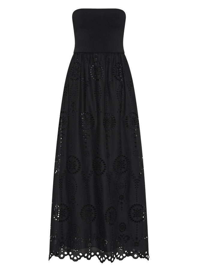 Matteau Strapless Knit and Broderie Dress in Black. Introducing the Strapless Knit and Broderie Dress, the latest iteration of our iconic Knit and Cotton Dress. Perfect for everyday, this midi dress has an easy pull-on silhouette with a figure-flattering strapless bodice made from our dry handle bandage knit. The skirt is crafted from our cotton broderie and features a feminine scalloped hem finish, full lining and in-seam pockets. We're confident this is the only dress you need to pack for your next vacation.