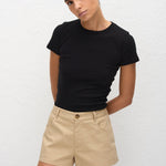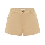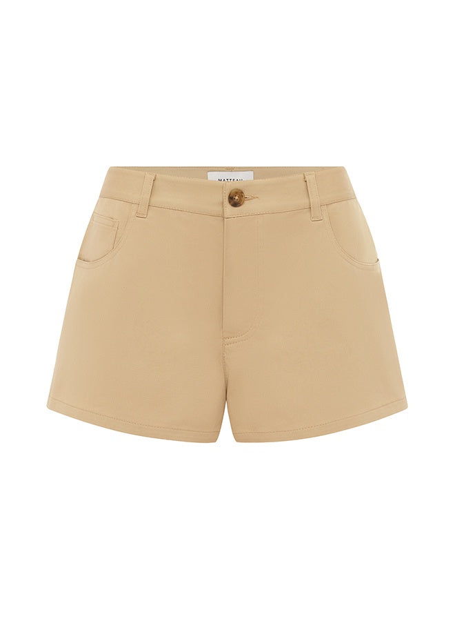 Matteau Twill Short in Sand. Designed with summer days in mind, these shorts are our alternative to the classic denim cut-off. Our Twill Short features a tailored waist band with flat front and a fly-front zip. Style with a Baby Tee and your favourite sandal for an easy daytime look.