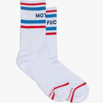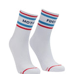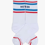 Mother Baby Steps Socks in White MF. Watch your step. Classic tube socks with a bold message from MOTHER. Shown here in white with navy lettering and red details.