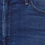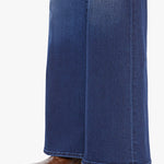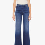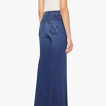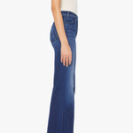 Mother The Hustler Roller Sneak in Homecoming High. 70s-inspired wide leg jeans with a high rise, 33-inch inseam and a clean hem. Made from stretch denim, Homecoming High is a dark blue with subtle whiskering and fading at the knees.