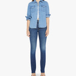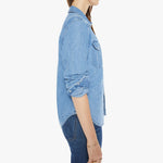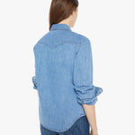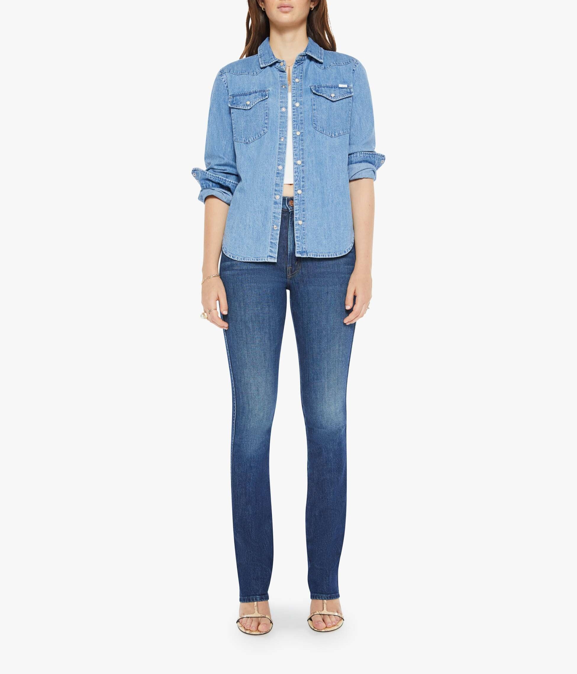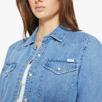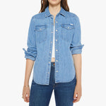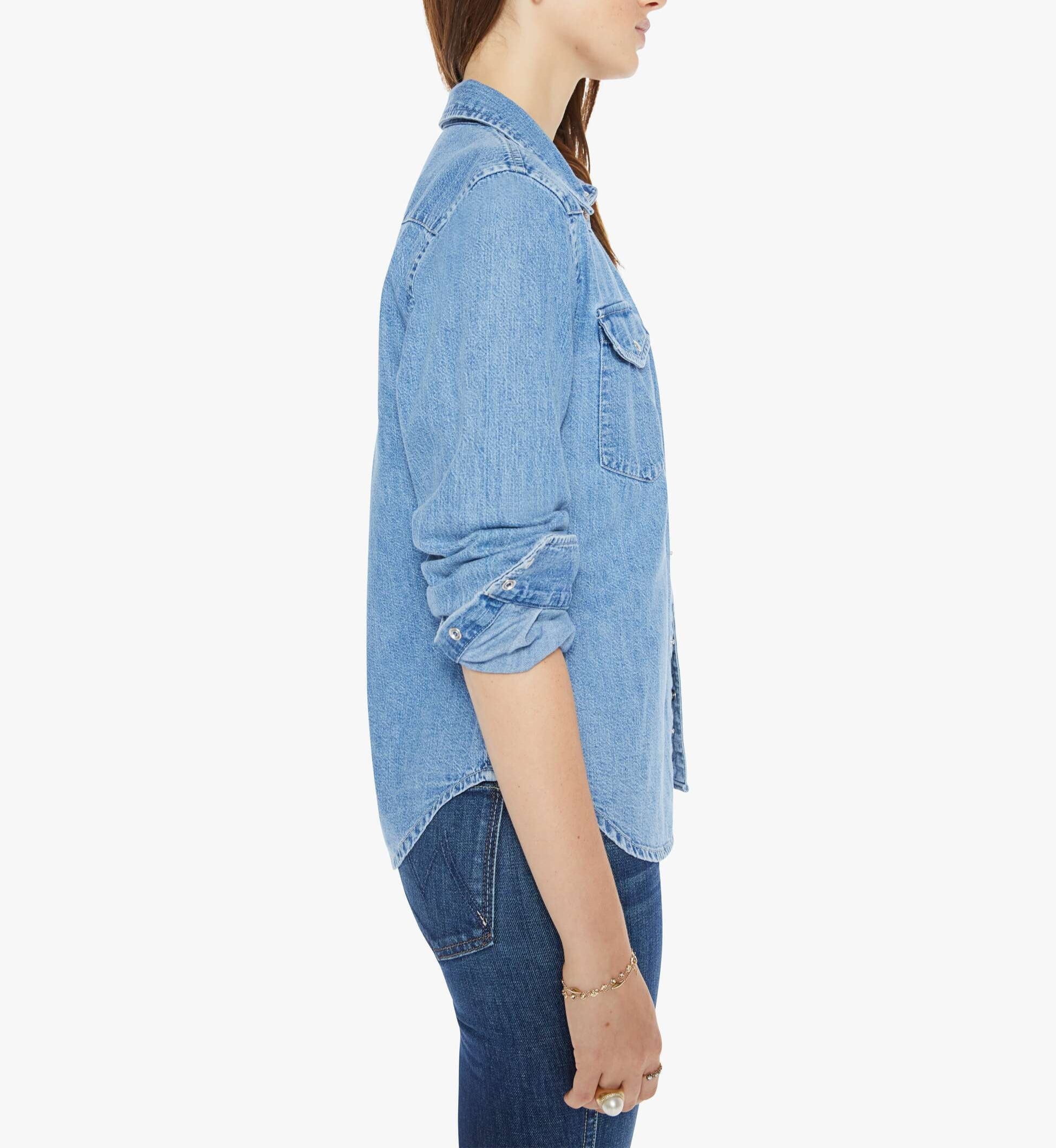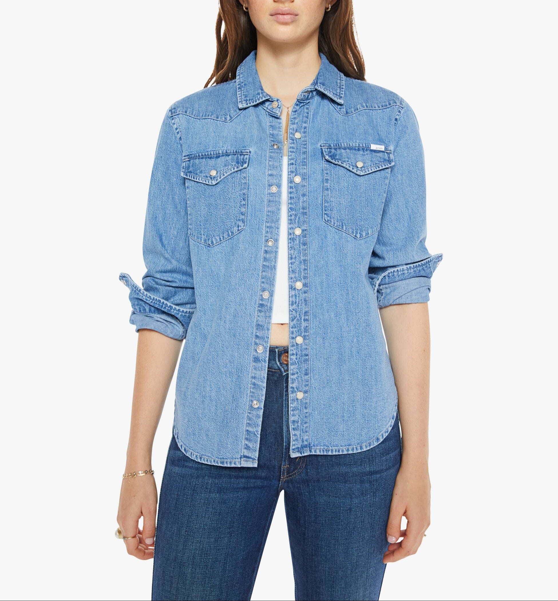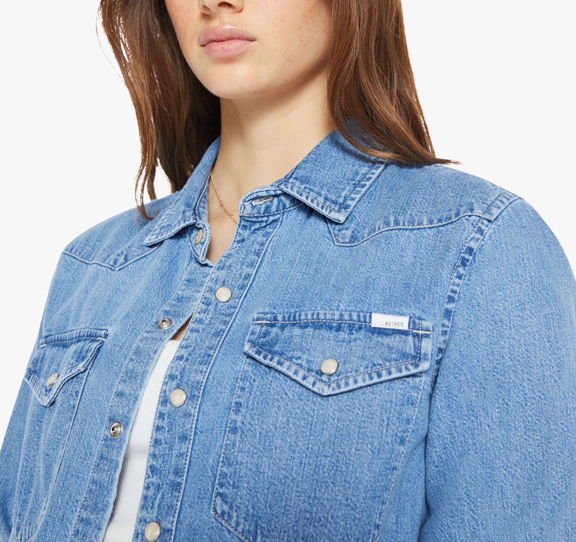 Mother All My Exes in Playing For Keeps. Yours for the taking. A Western-inspired denim button-up with front patch pockets and a curved hem. Made from 100% cotton, Playing For Keeps is a faded vintage-blue wash with faux pearl snaps down the front.