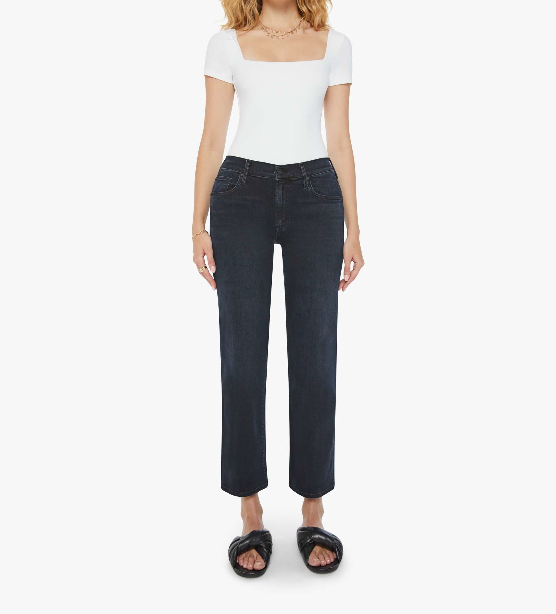 Mother Mid Rise Zip Rambler Ank in Night In Venice. Imagine the pasta-bilities. Mid-rise jeans with a wide straight leg, zip fly and clean ankle-length inseam. Made from denim with a touch of stretch, Night In Venice is a dark denim wash.