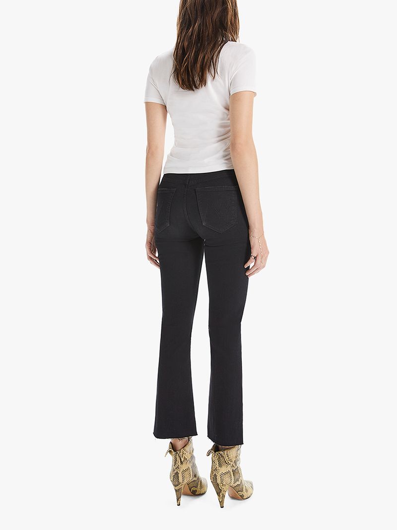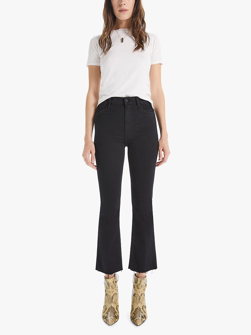 The Hustler Ankle Fray Jean is MOTHER's favorite vintage-inspired high rise fit with cropped boot cut legs. Not Guilty is our classic black denim wash.