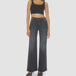 70s-inspired wide leg jeans with a high rise, 30-inch inseam and a clean hem. Designed in a stretch cotton blend, Not Today Satan is a black wash with whiskering, fading and tonal hardware.