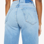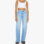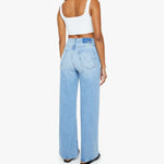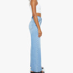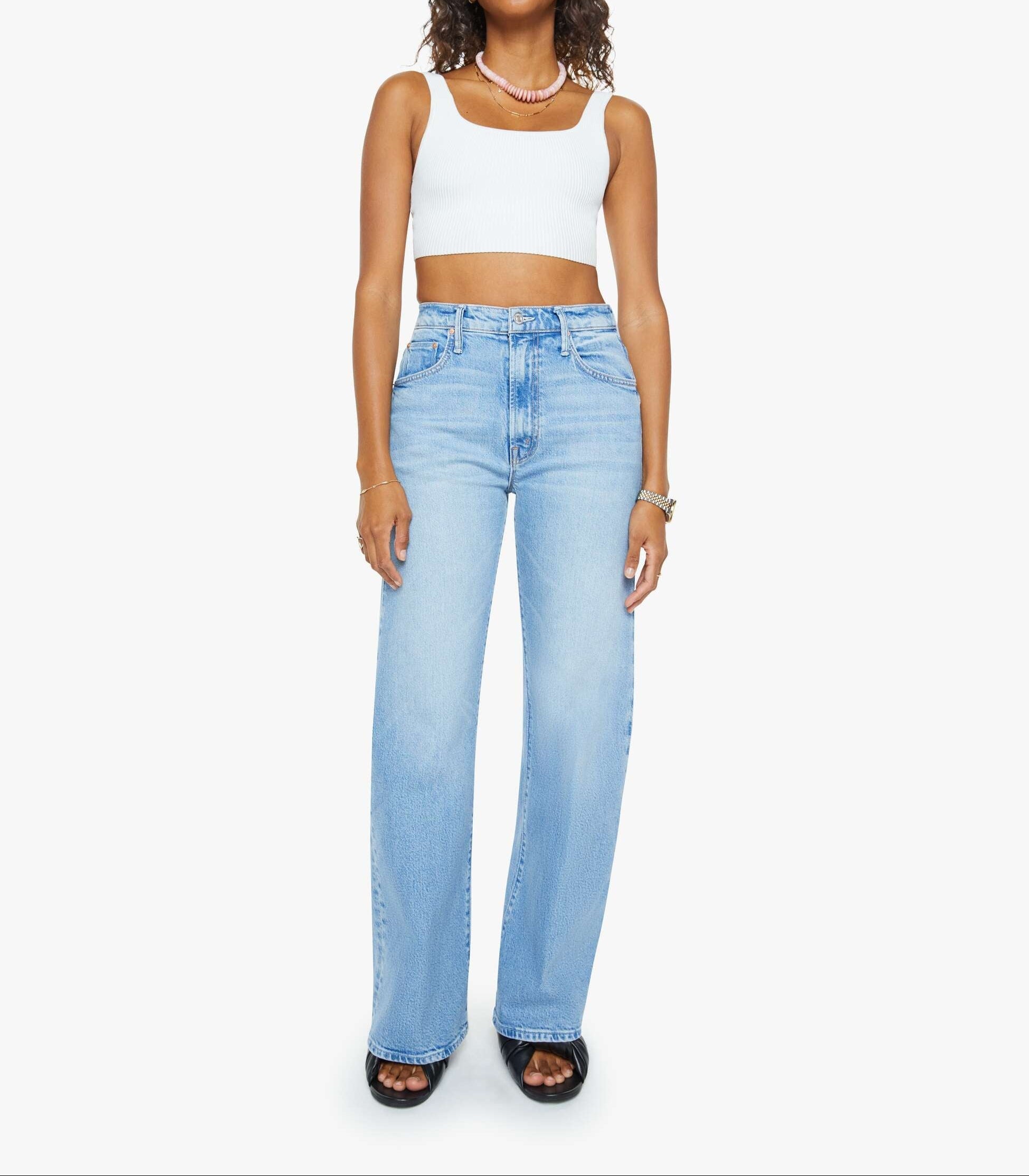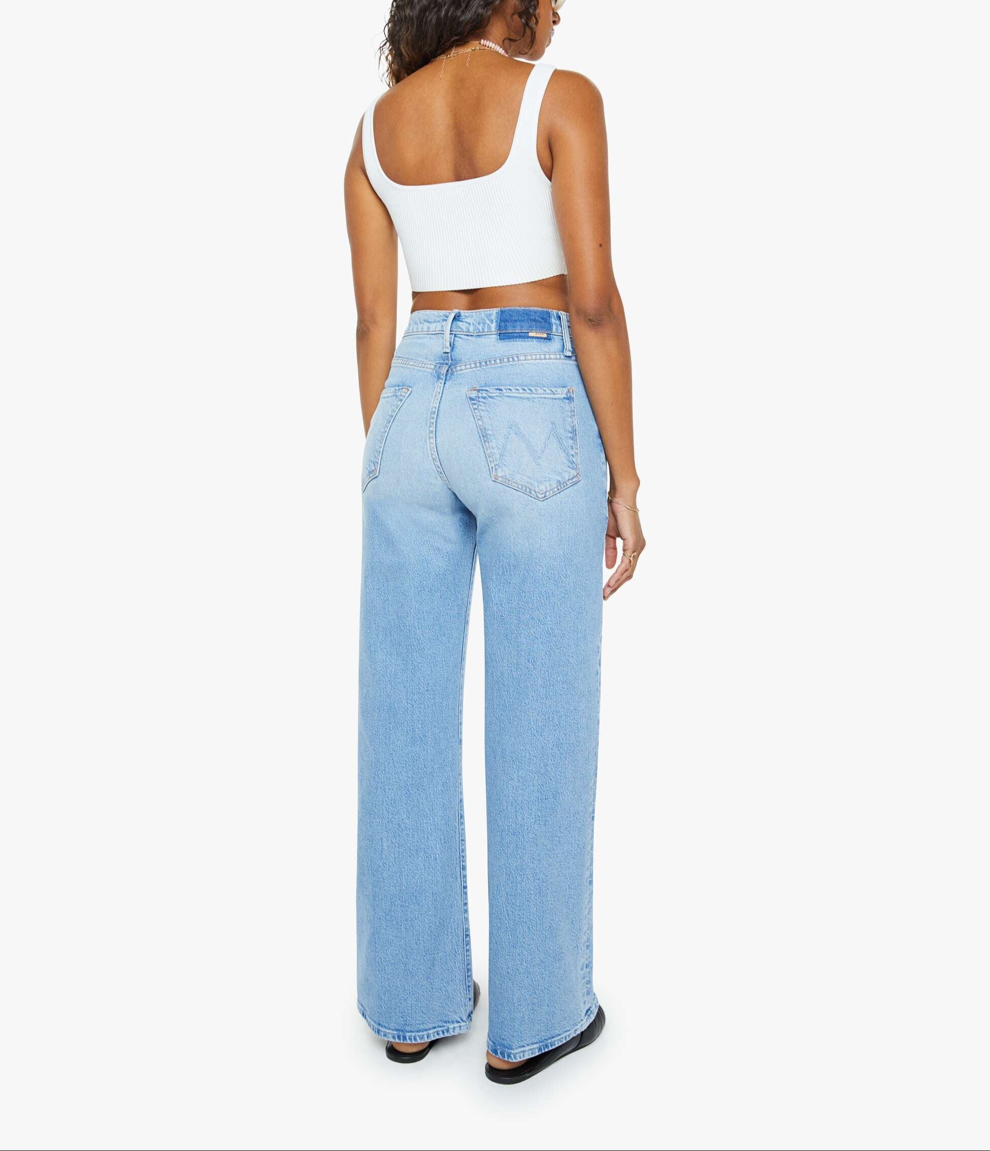 Mother The Lasso Sneak in Sow Surreal. Wide-leg jeans with a super high rise and a 32-inch inseam with a clean hem. Made from semi-rigid SUPERIOR denim, Sow Surreal is a light blue with whiskering and fading throughout for a lived-in look.
