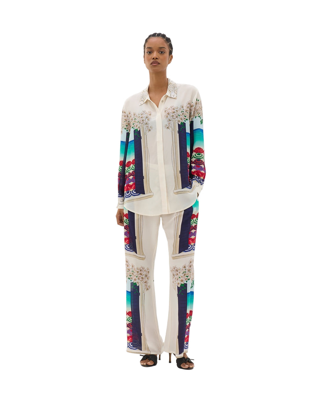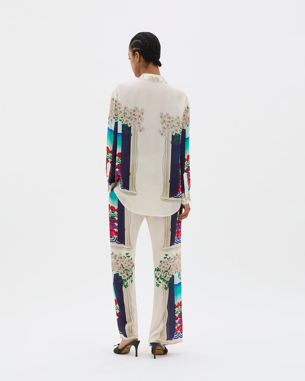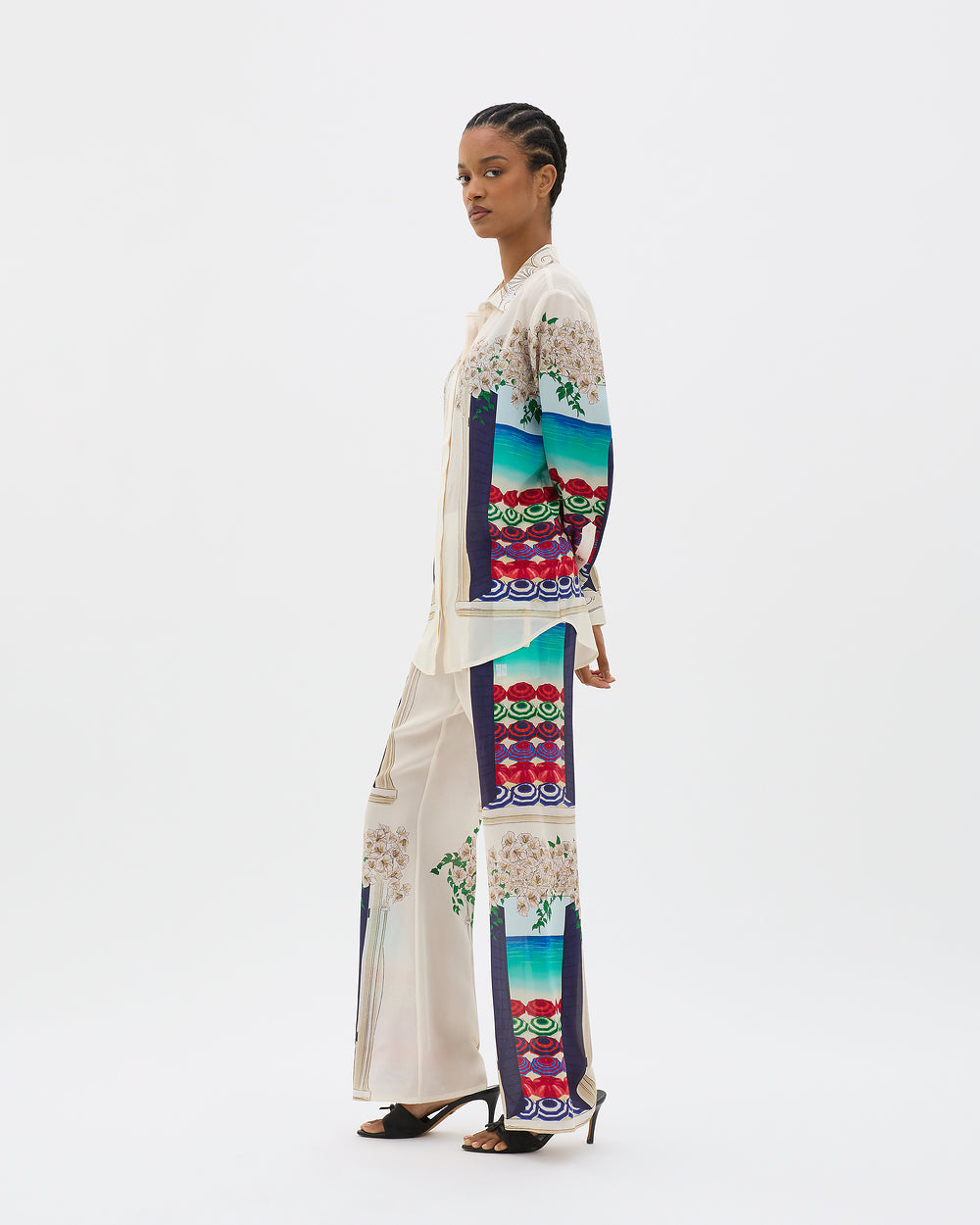 Muma World Riviera Long Sleeve Shirt in Riviera. A new classic, featuring our signature hand-illustrated & hand-placed prints in a Riviera setting. Signature cuffs with connecting motifs to the matching pants, elevate a limited edition print with only few styles made. The lightweight silk satin material adds a luxurious finish, ensuring both comfort and sophistication, perfect for evening wear or upscale styling.