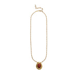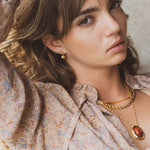 Anni Lu Cherry On Top Necklace in Gold. Red jasper surrounded by a warm golden glow. Cherry On Top is a bold splash of color that says you’re here to have fun, while looking sophisticated.
