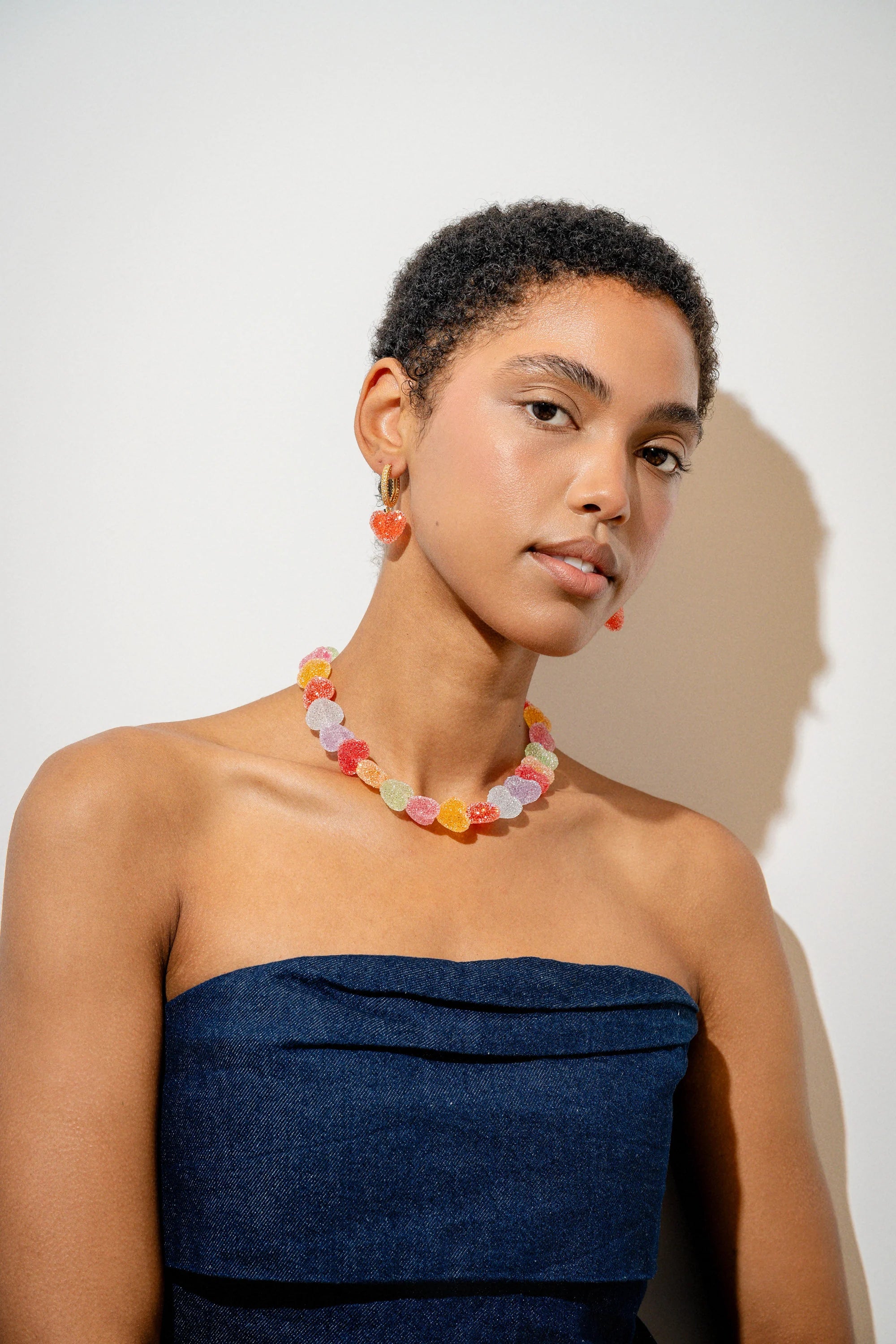 Our Jelly Hearts were lovingly created as a stylish upgrade from your childhood corner shop’s candy jewellery. The sugar-coated hearts were created as a nostalgic reminder of edible jewelry of the 90s and 00s and is a fun way to inject some sweet style into your wardrobe.