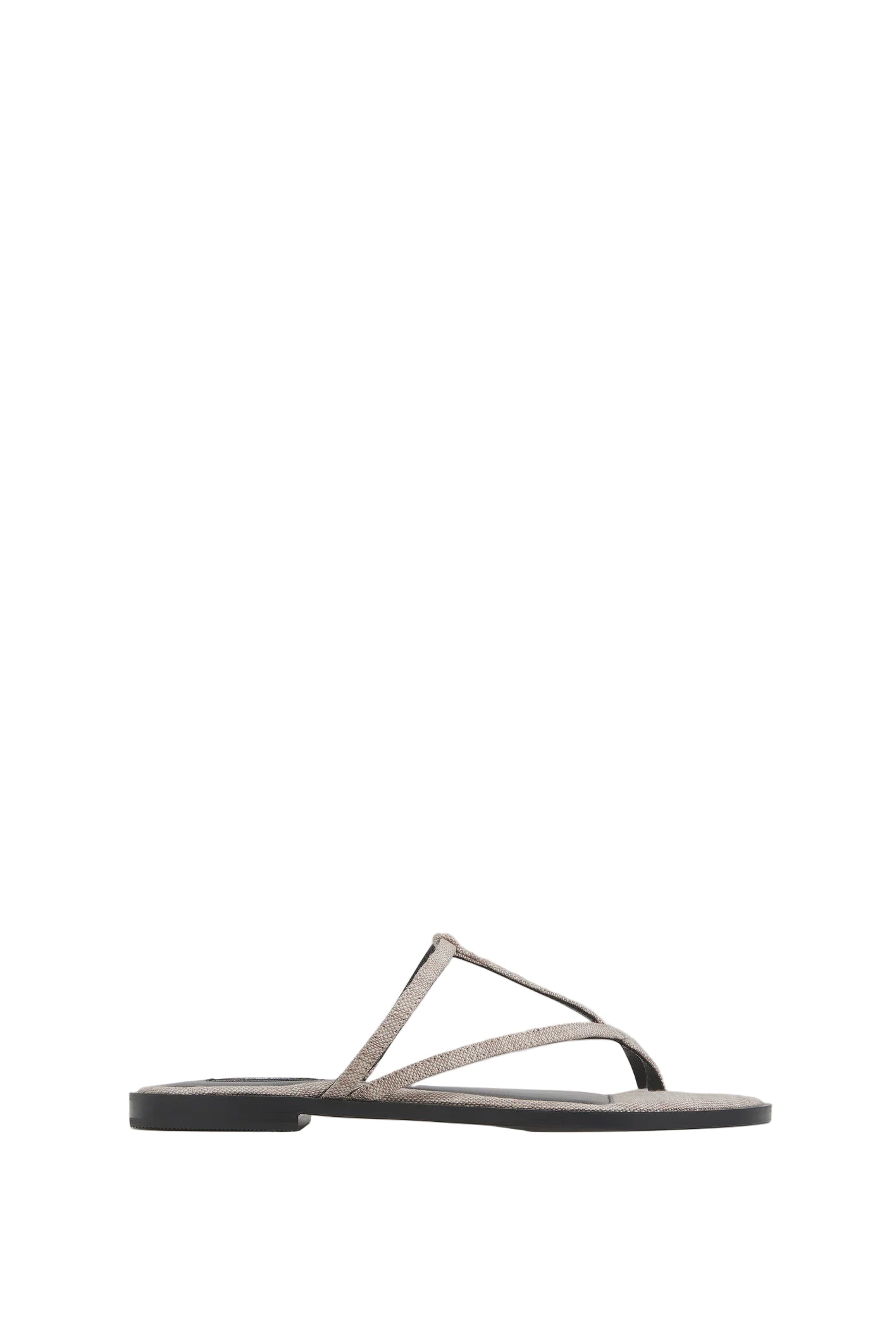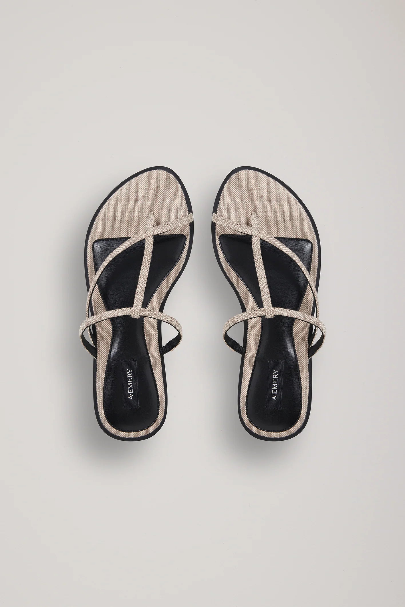 A Emery Cyrus Sandal in Buff. The Cyrus Sandal sits atop an elegant, tapered footbed with slim straps diagonally and horizontally securing the top of the foot.