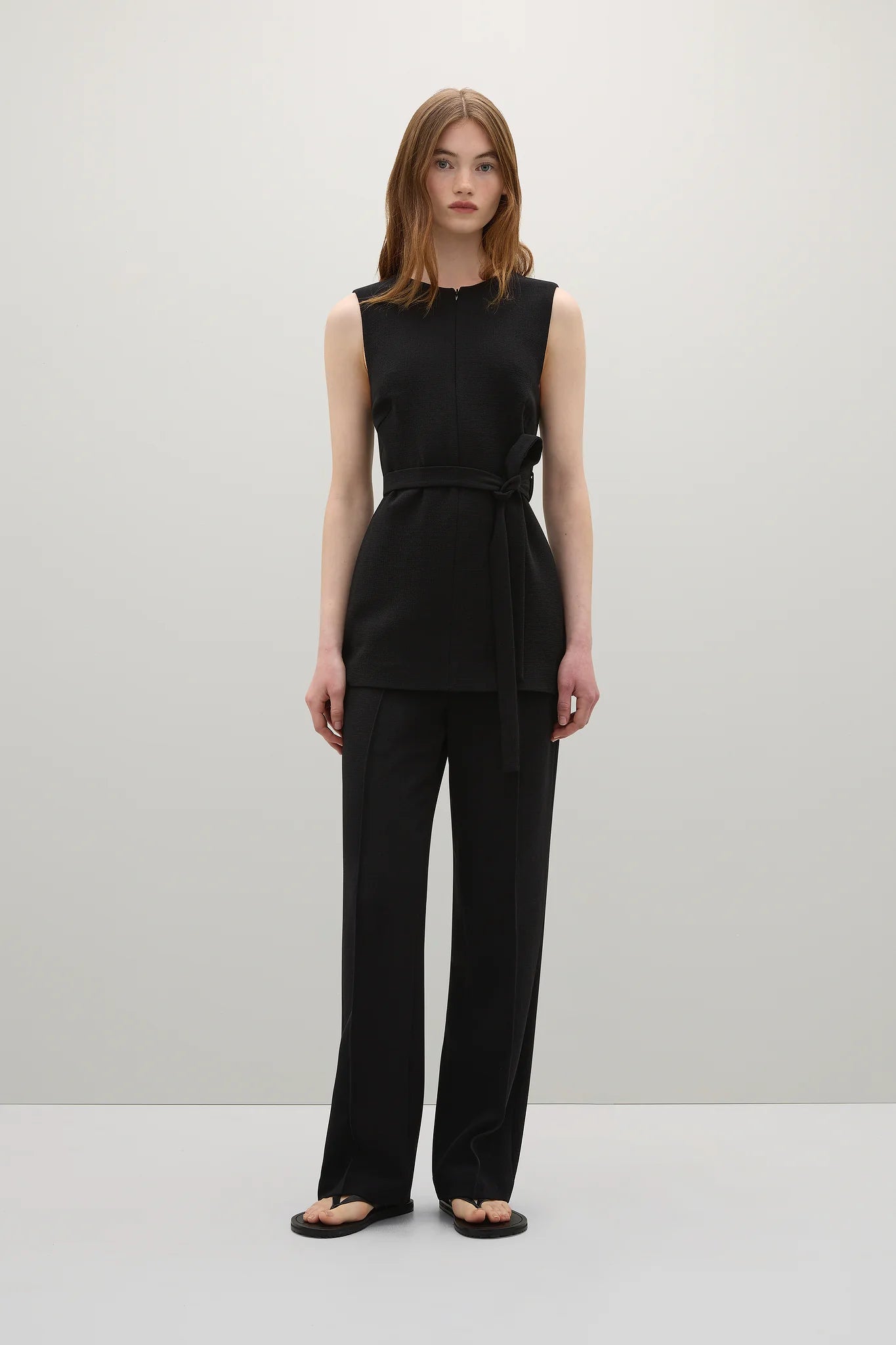 A Emery Emille Tunic in Black. Crafted from a luxurious Turkish wool, the Emille Tunic features an invisible zip at centre front that can be worn as high or low as desired for versatility when styling. Finished off with a belted tie for a defined waistline.