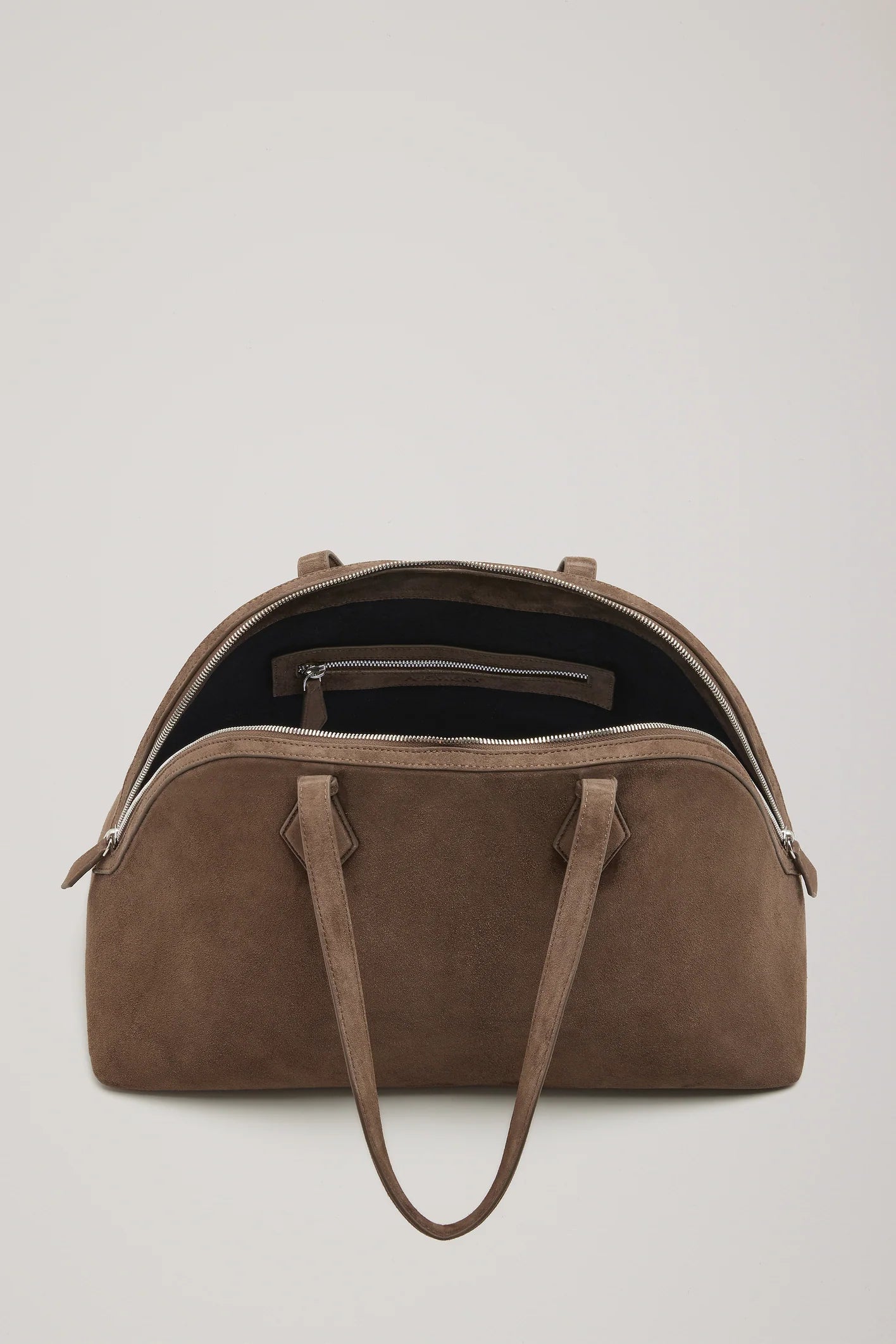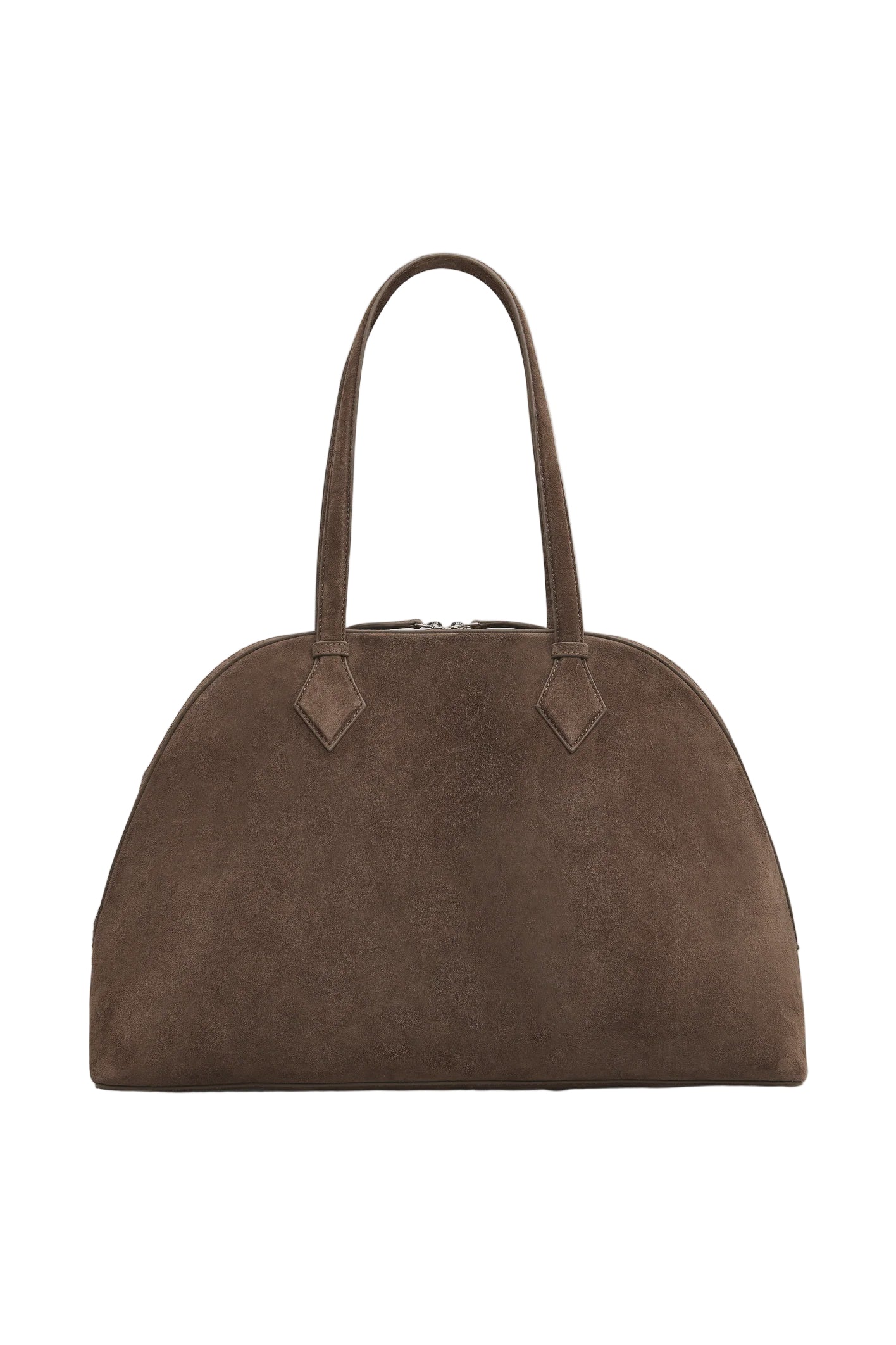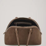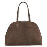 A Emery Harnick Bag in Cedar Suede. The Harnick Bag is crafted from premium suede, defined by a sculptural tapered silhouette. Designed with functionality in mind, it features a two-way double zip closure, structured handles and four protective feet at the base. The interior is lined in a premium cotton twill and finished with a single internal zip pocket offering secure space for essentials.