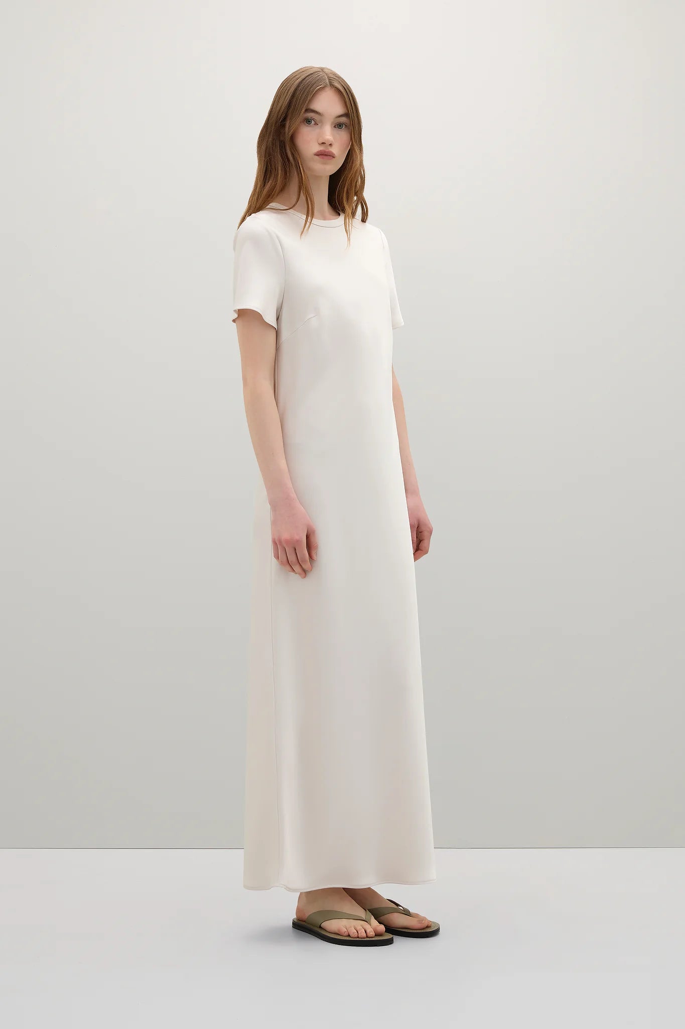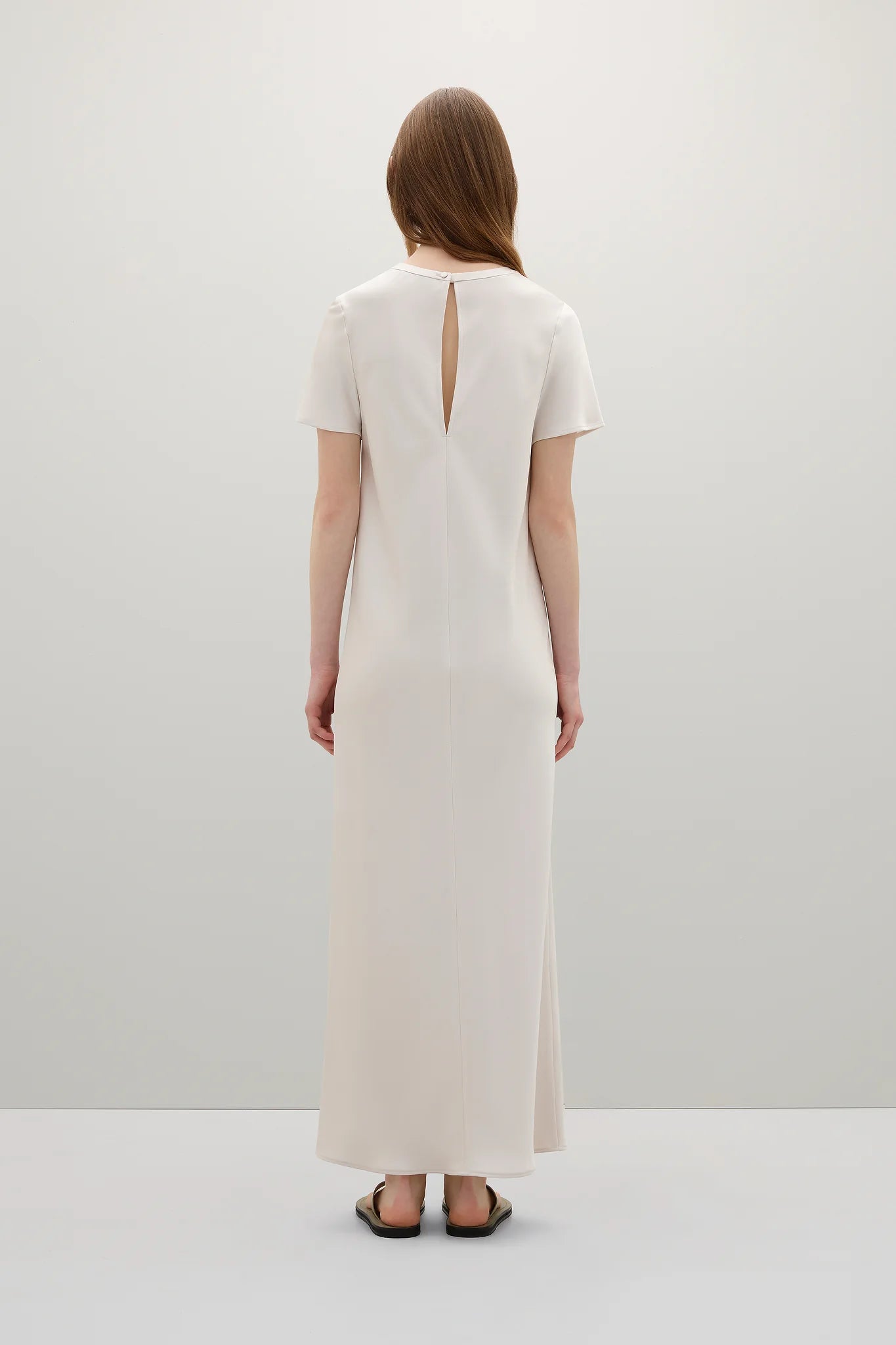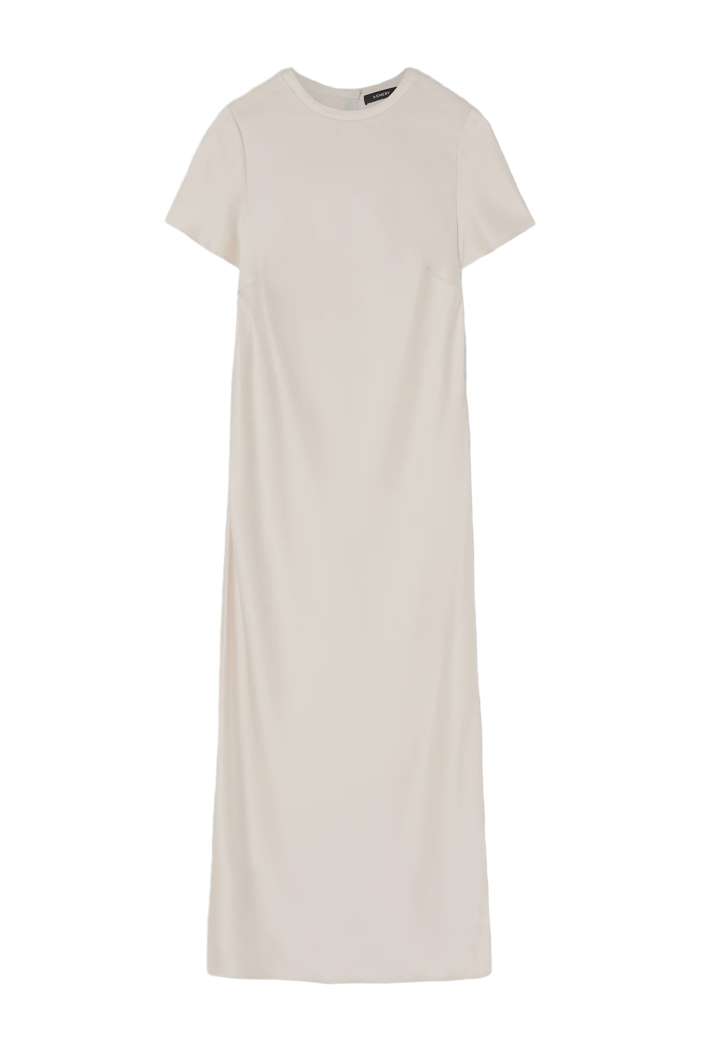 A Emery Moore Dress in Oyster. Crafted from premium Japanese triacetate, the Moore Dress is an elevated T-shirt style maxi dress with a short sleeve, button closure at the back of the neck, and cut on the bias for a universally flattering fit.