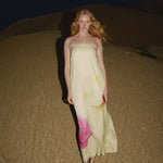 Aston Studio Lucie Dress in Elfin Phalae. The Lucie Dress Elfin Phalae is a strapless maxi that is effortlessly feminine. With a smooth satin finish and subtle hand crafted phale print, the Lucie is a timeless design that combines comfort with chic sophistication.