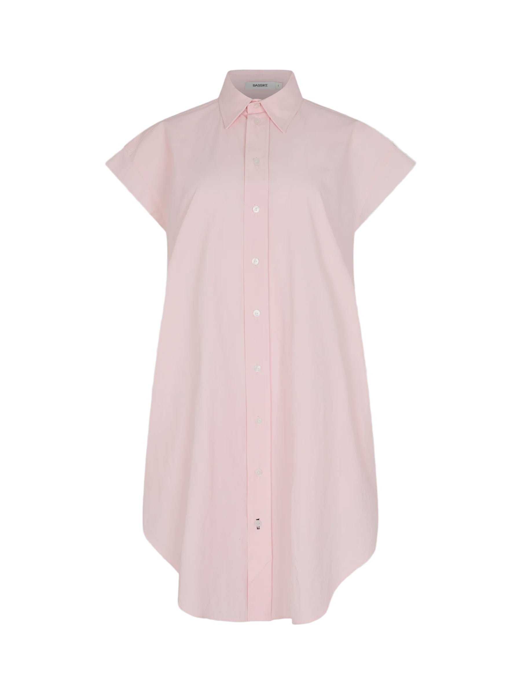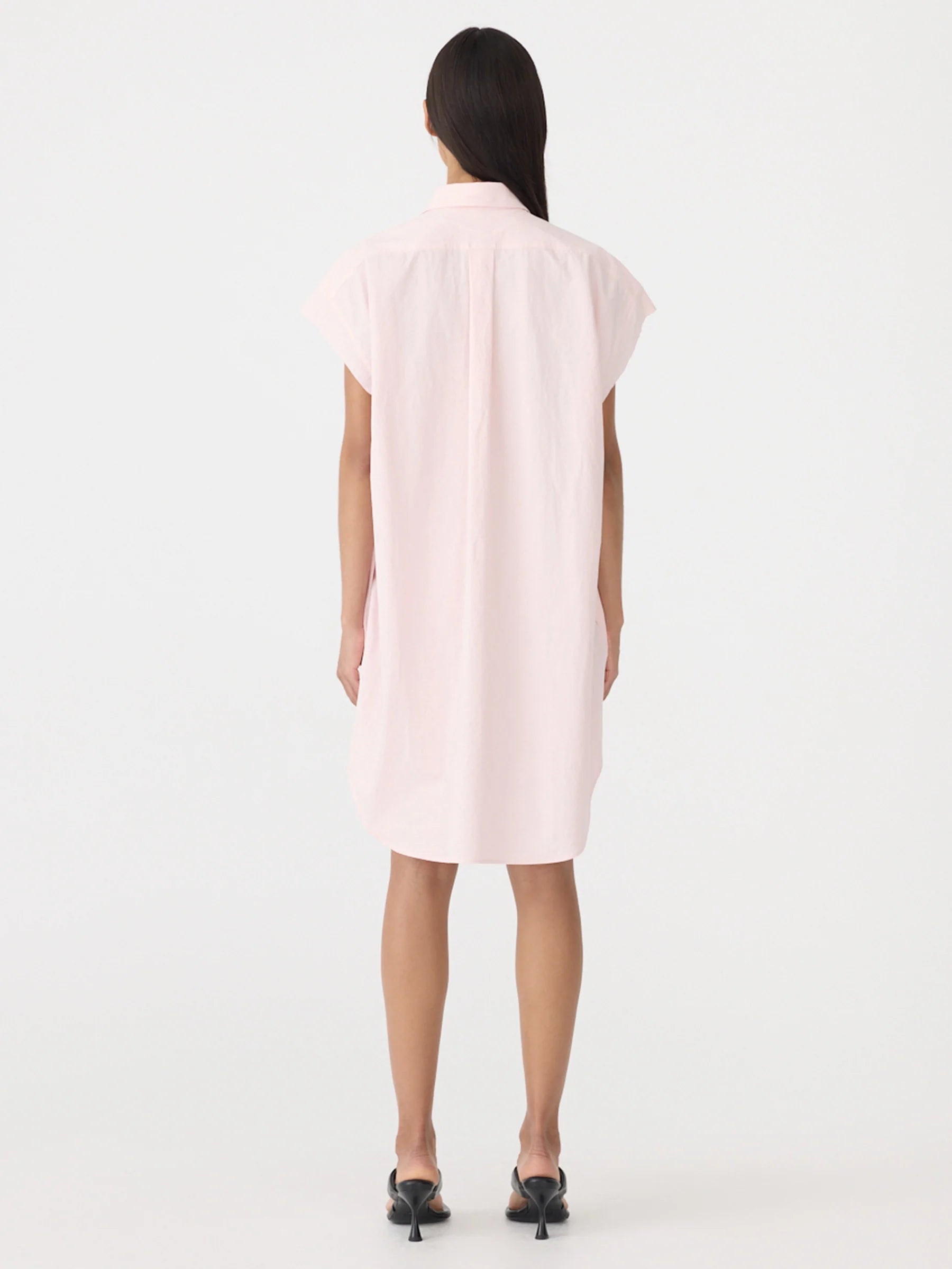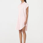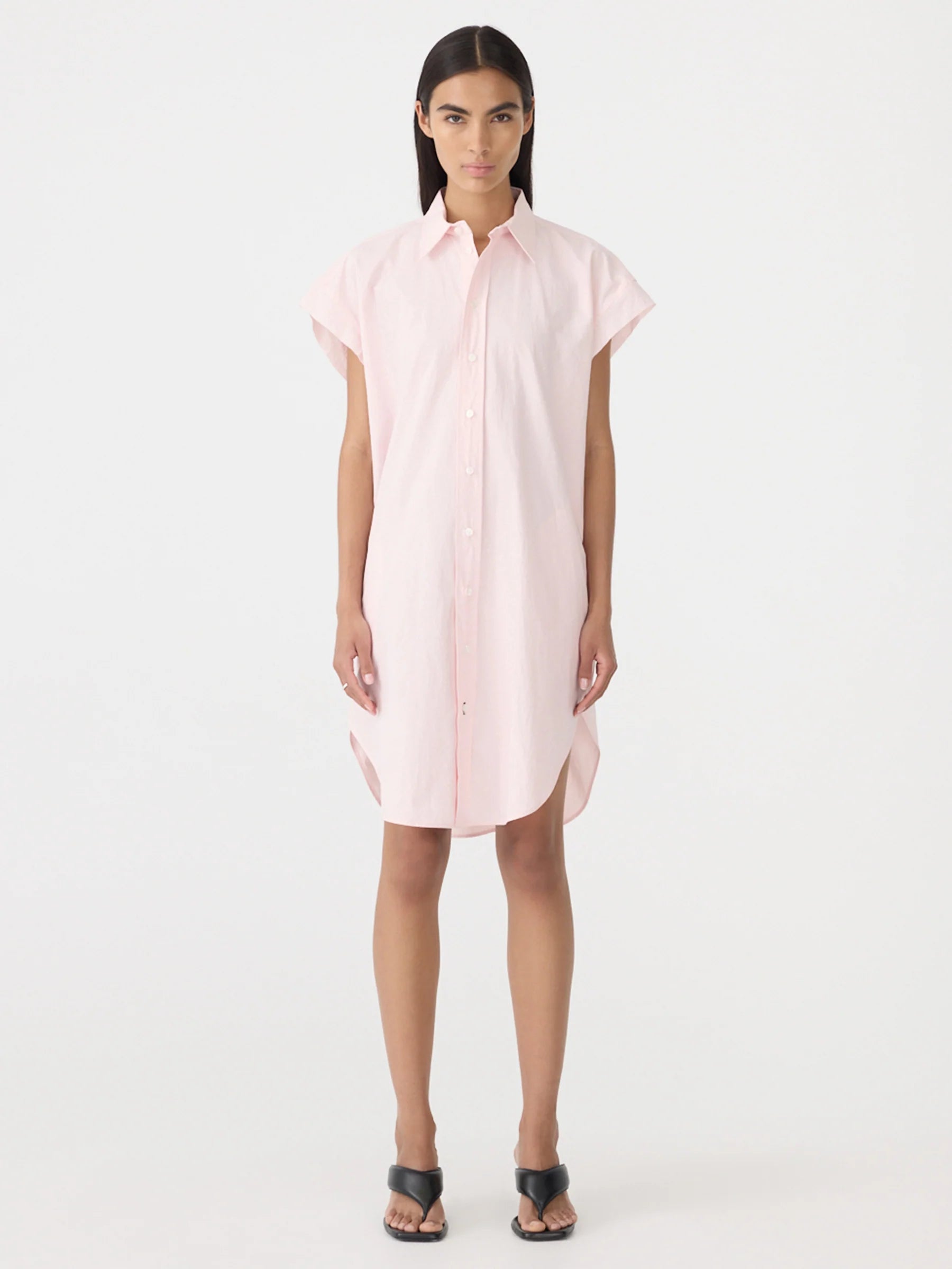 Bassike Crushed Cotton Shirt Dress in Soft Pink. The Crushed Cotton Sleeveless Dress is a lightweight compact cotton, with an oversized sleeveless shirt dress designed for a relaxed, airy silhouette. The naturally crushed fabric adds texture and subtle movement, making it effortless to wear.