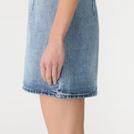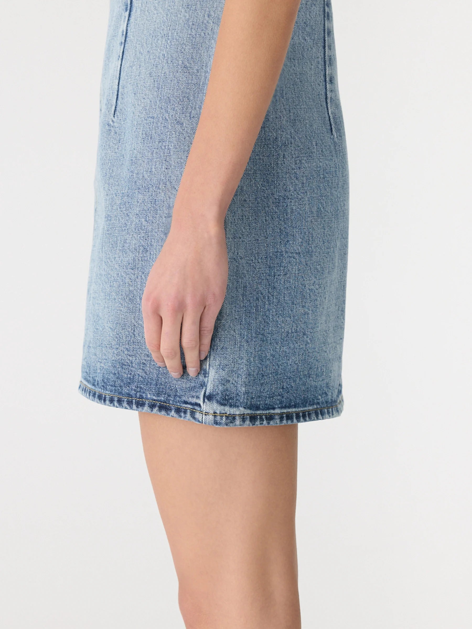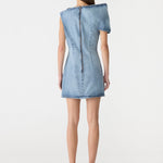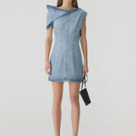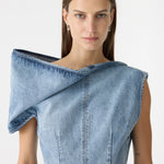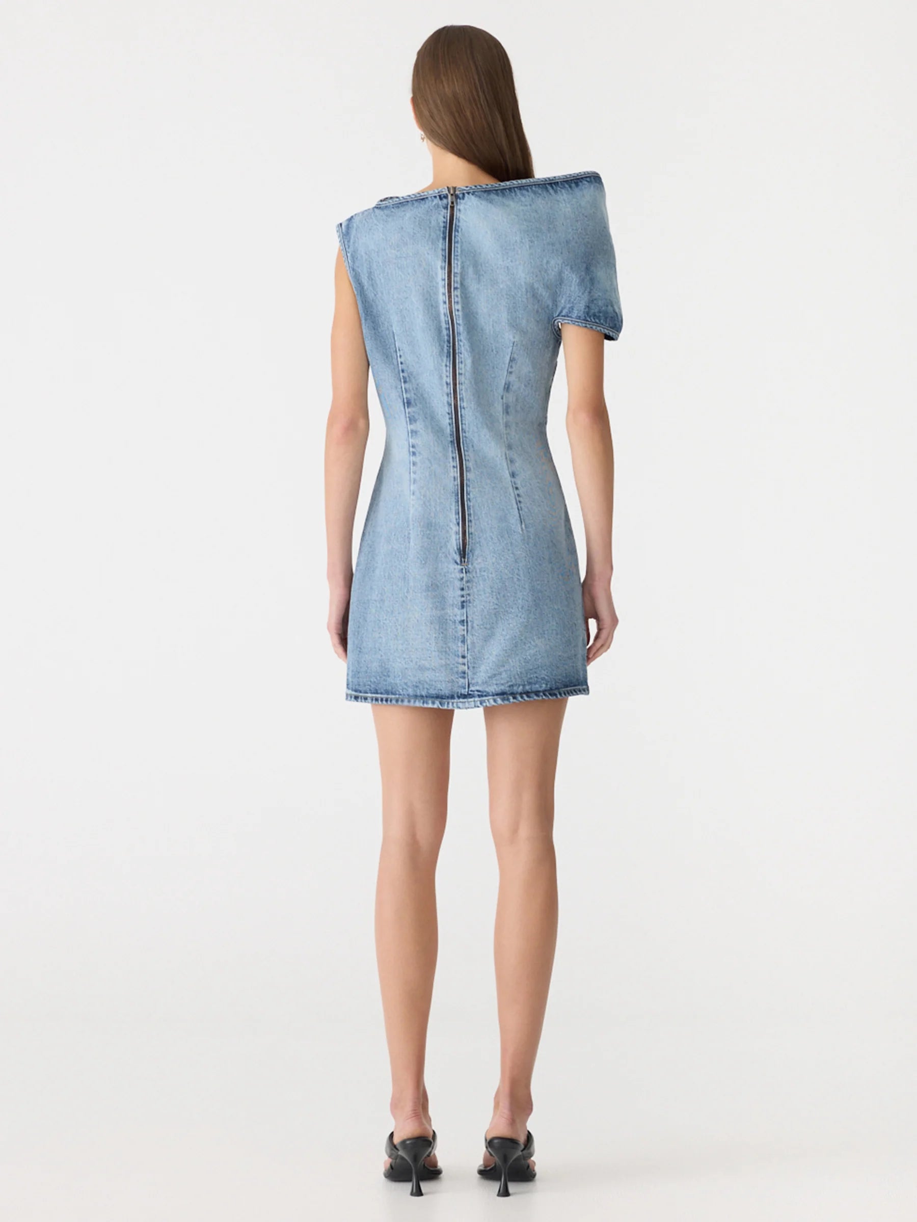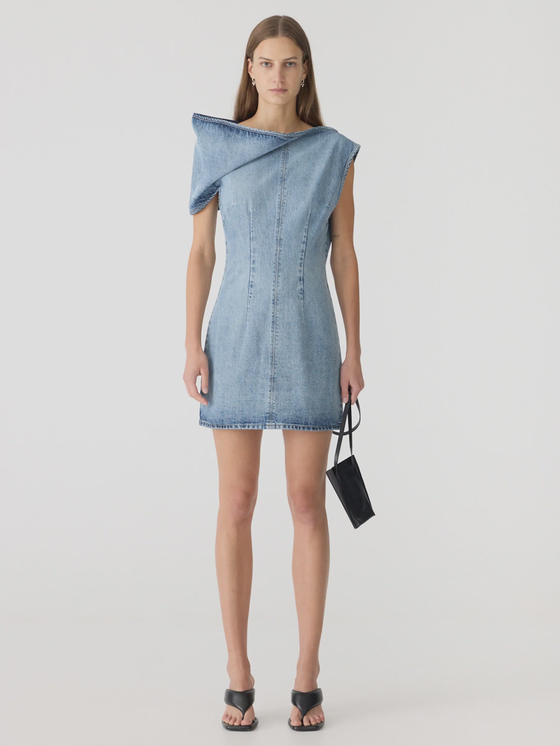 Bassike Off The Shoulder Dress in Super Light Wash. Crafted from a heavyweight Japanese twill woven in organic cotton, the Off Shoulder Denim Dress is designed for a slim fit. This refined silhouette features an asymmetric neckline with vertical dart detailing through the front and back. Finished with a centre back zip closure for a clean finish.