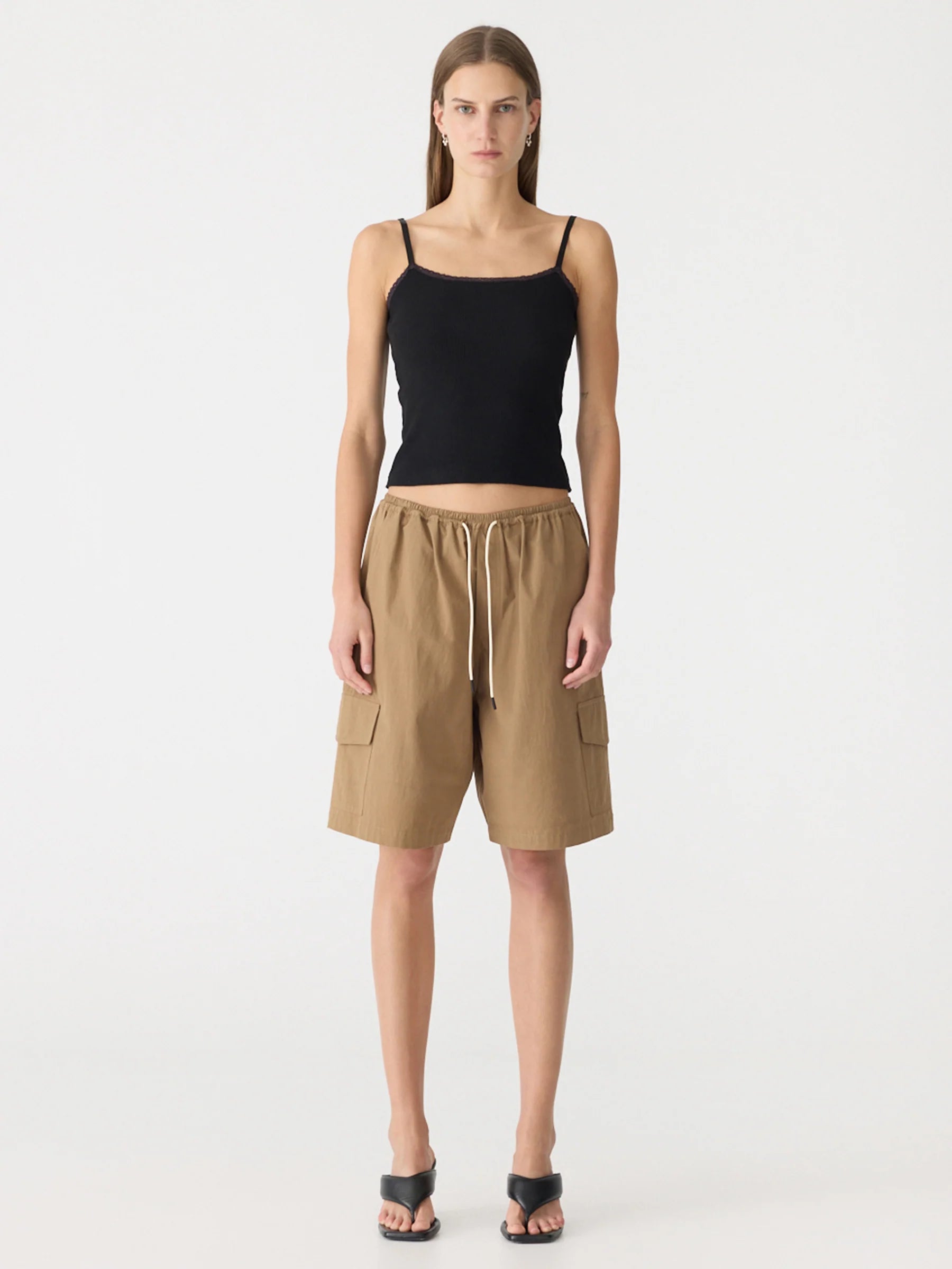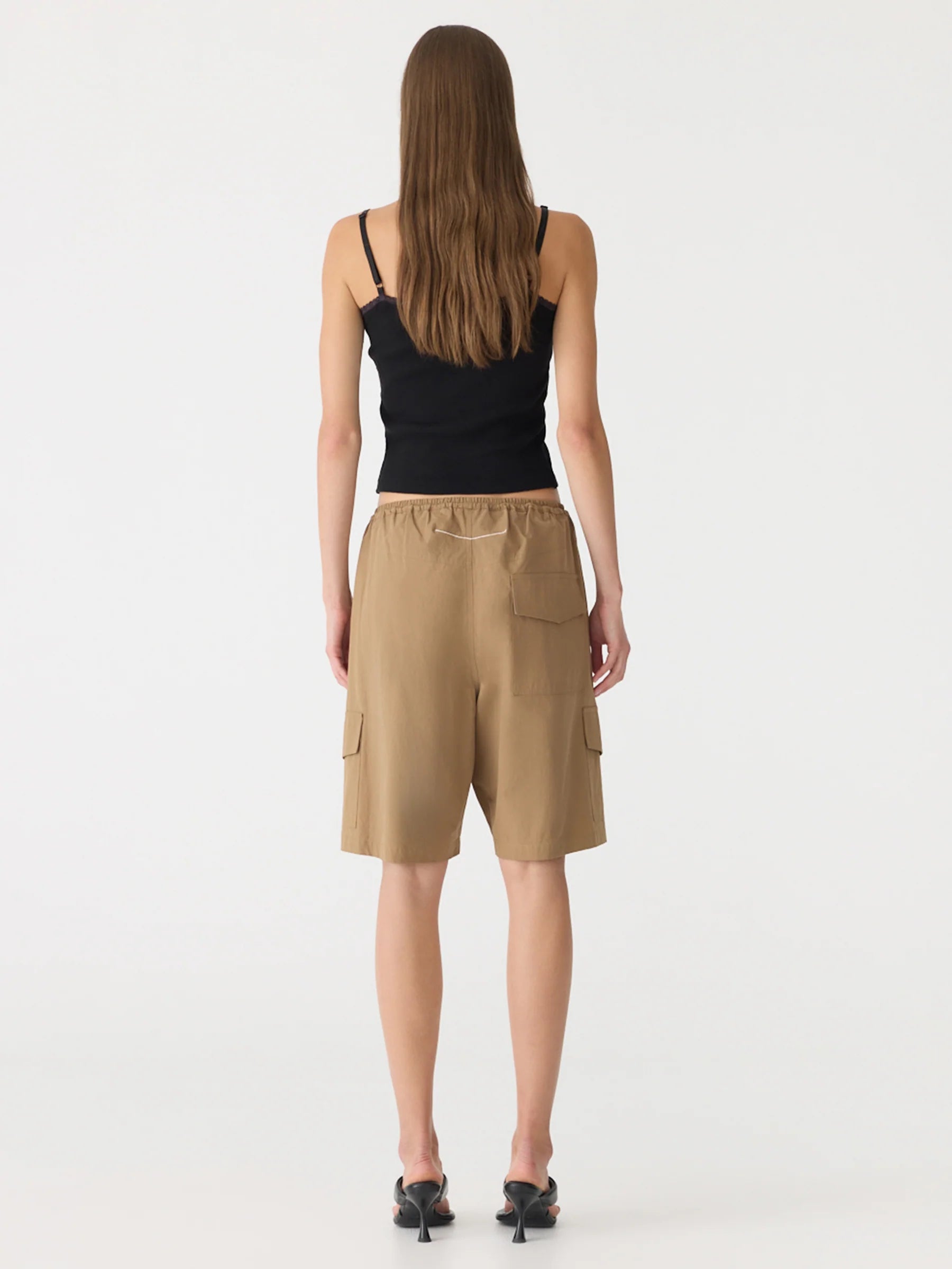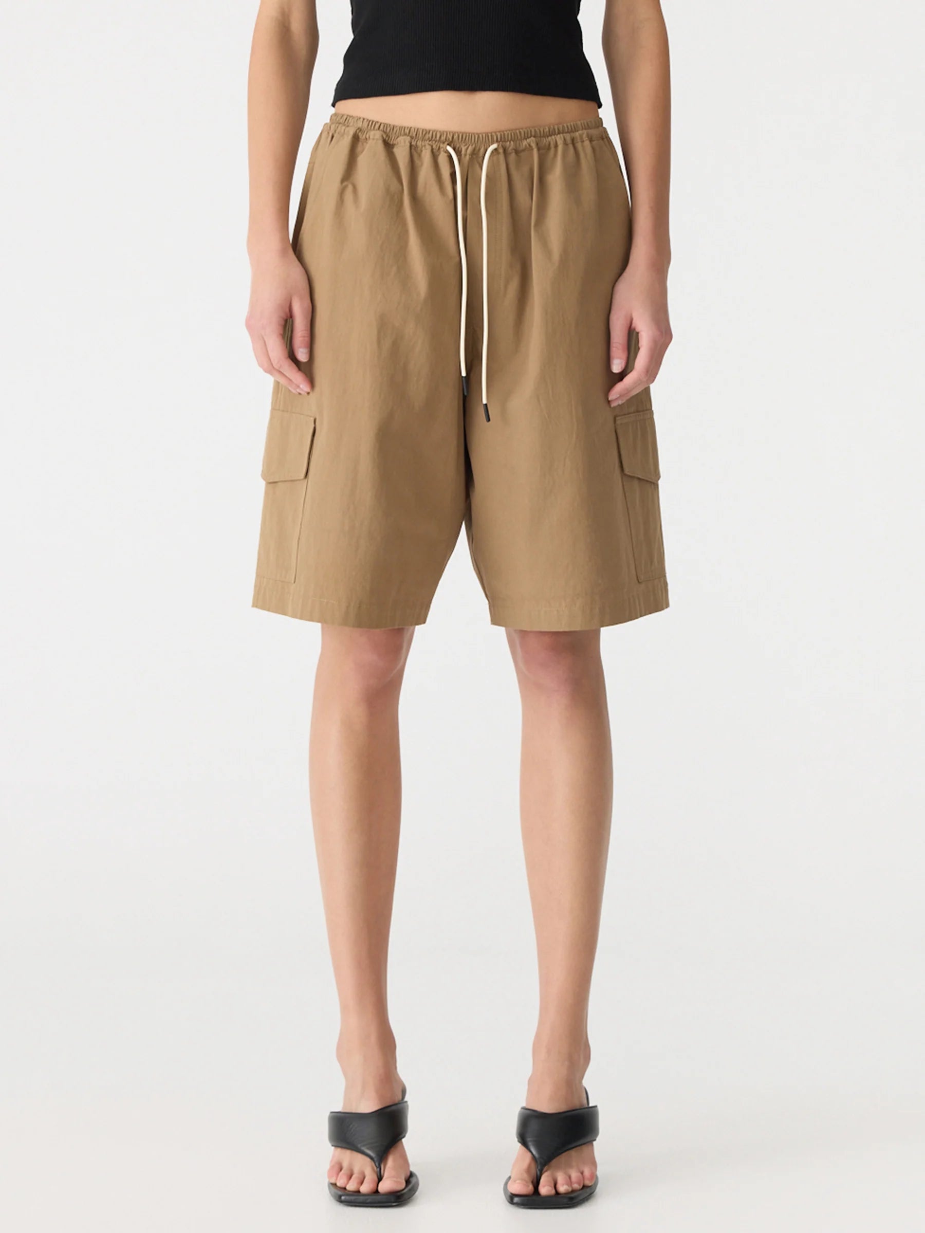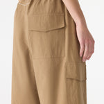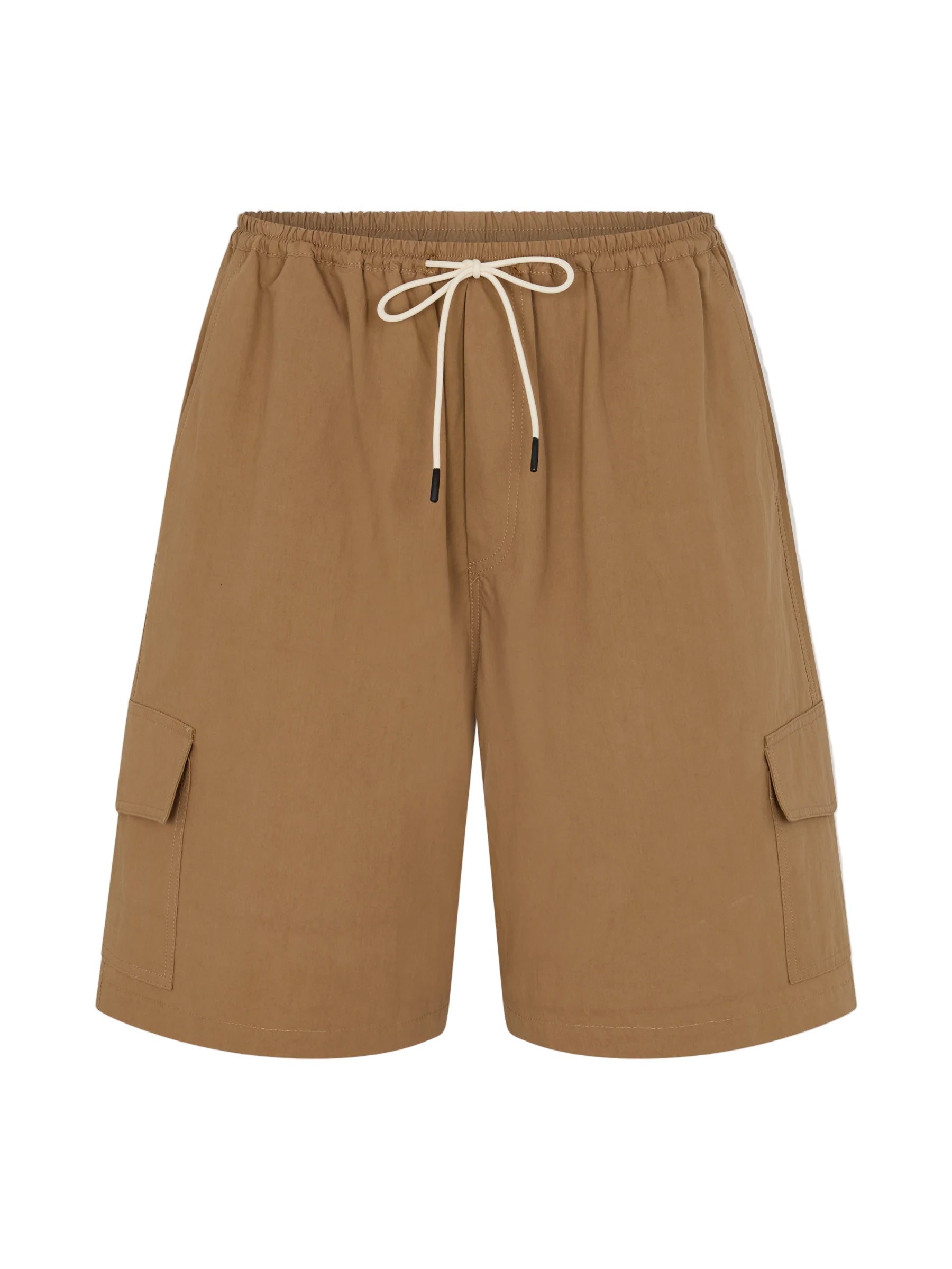 Bassike Crushed Cotton Cargo Short in Dark Tan. Voluminous pull-on short crafted from crushed cotton for a soft, textured finish. Designed with a fine elasticated waistband and premade drawcord, featuring cargo flap pockets on each side leg and a flap patch pocket at the back. Finished with a back yoke and Bassike branded stitching.