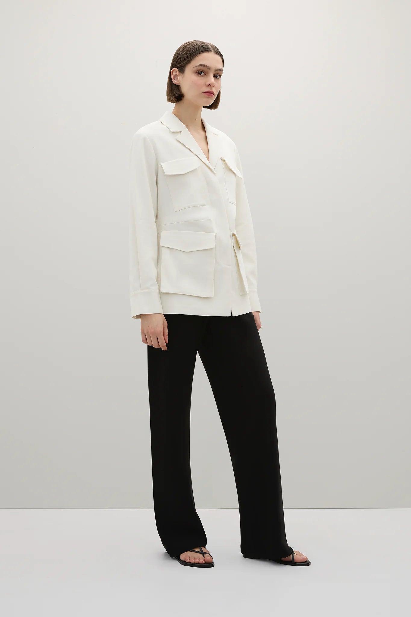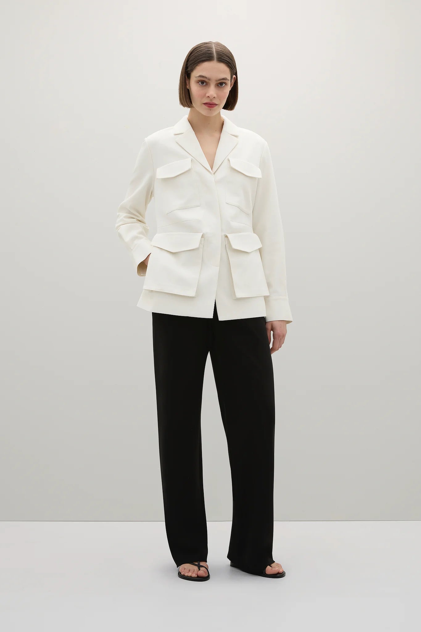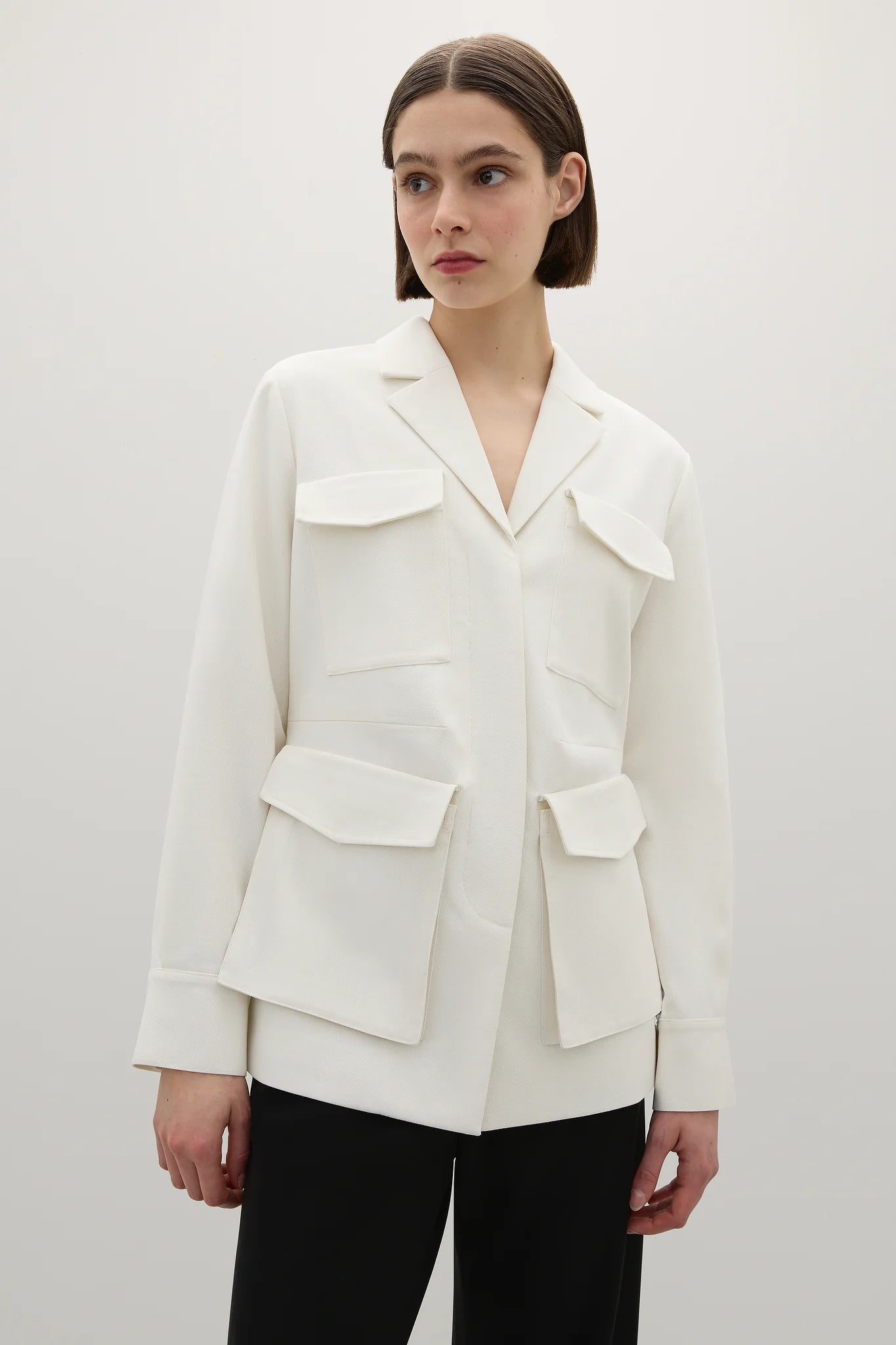 A Emery Frank Jacket in Parchment. Crafted from a premium cotton twill, the Frank Jacket is a utilitarian style jacket featuring six pockets, four front facing and one in each side seam. Features also include a classic notch lapel, a hidden button placket and single button closure cuffs.