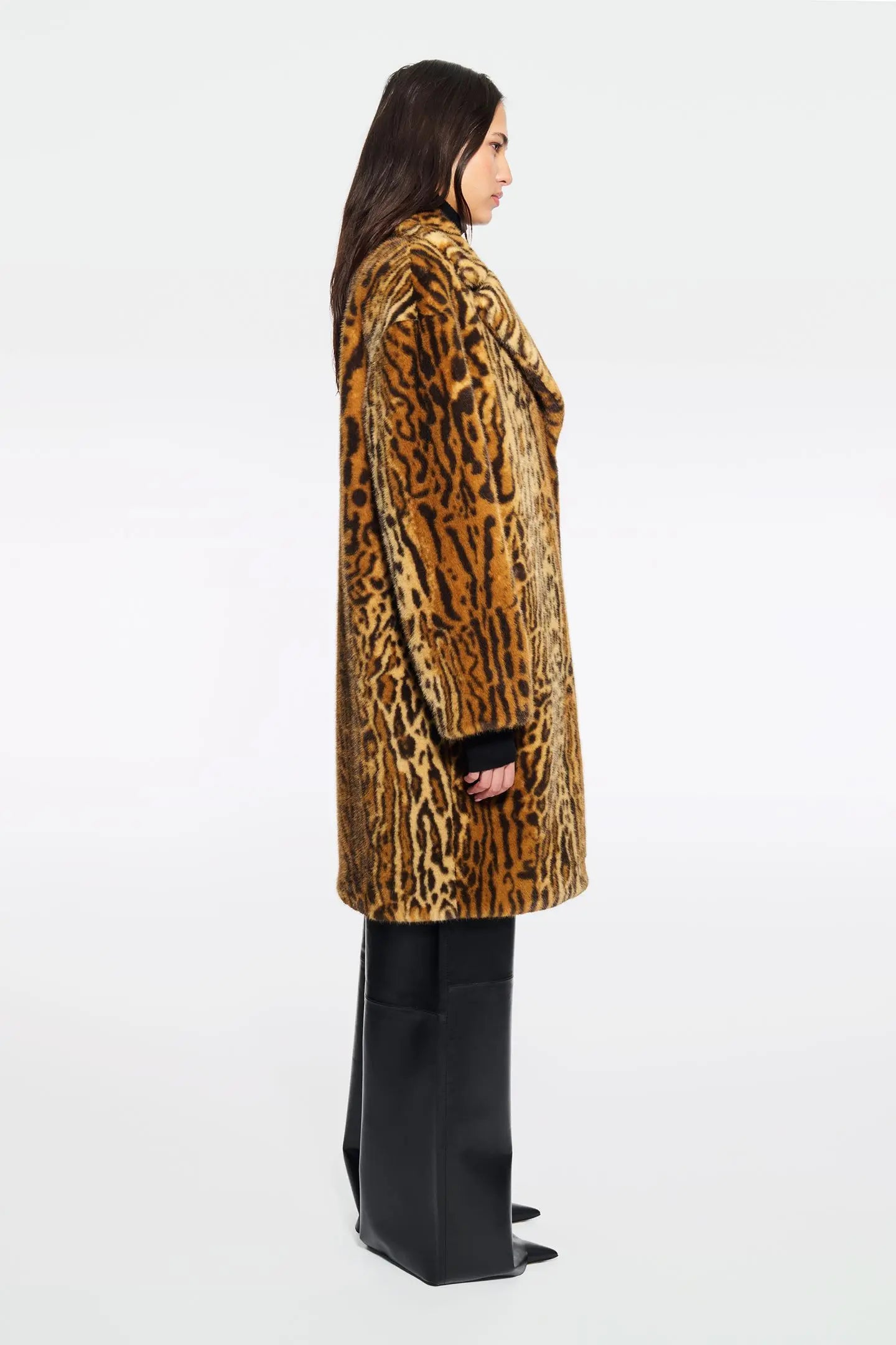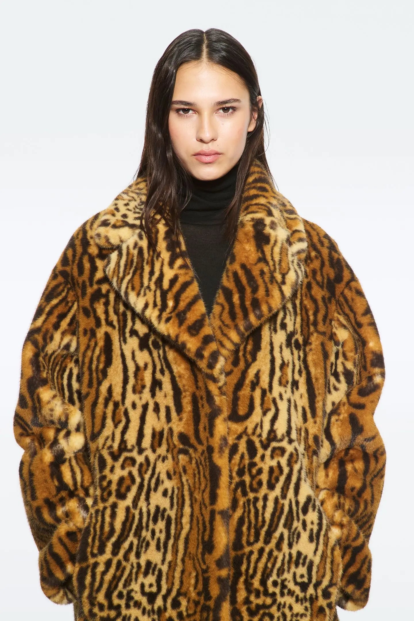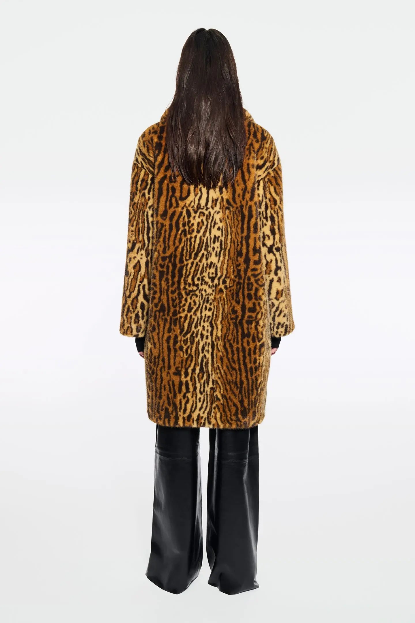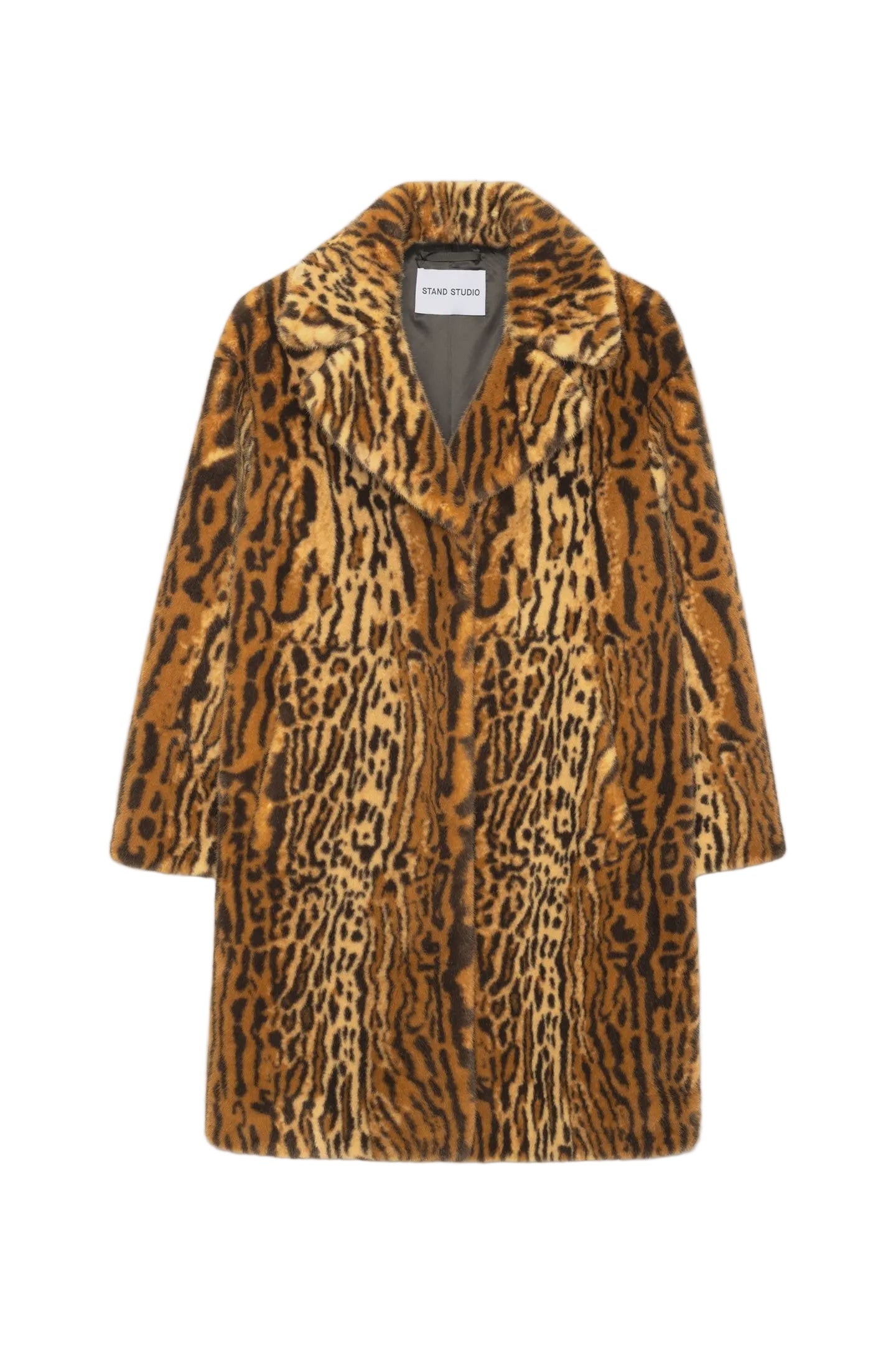 Stand Studio Camille Cocoon Coat in Leo. Camille Cocoon Coat is the outer layer that works for any occasion. It's crafted from sumptuously soft faux fur, cut to a cocoon silhouette and enhanced by dropped shoulders. Please note that this style runs big. If you’re between sizes, we recommend choosing the smaller size.