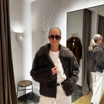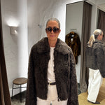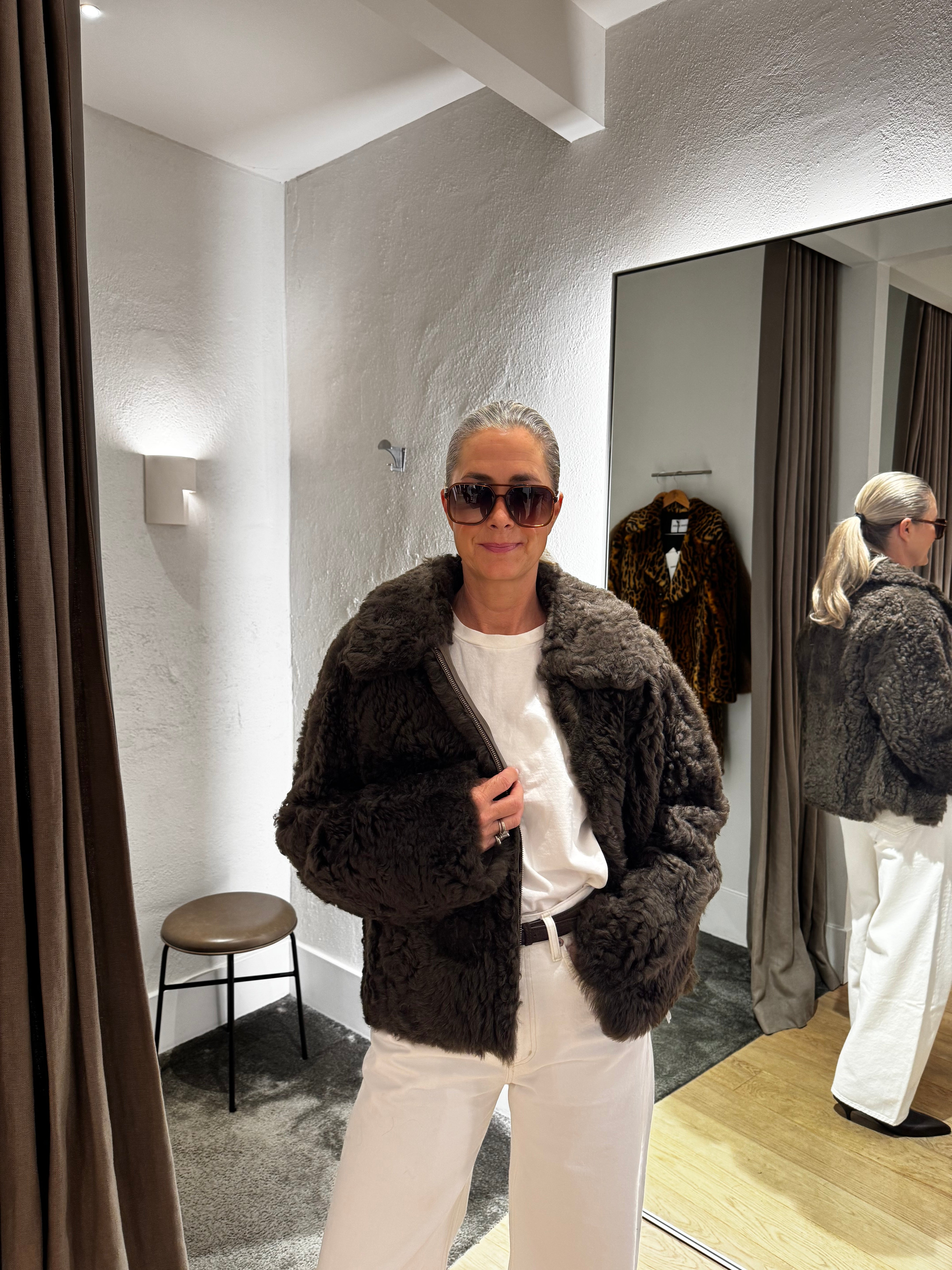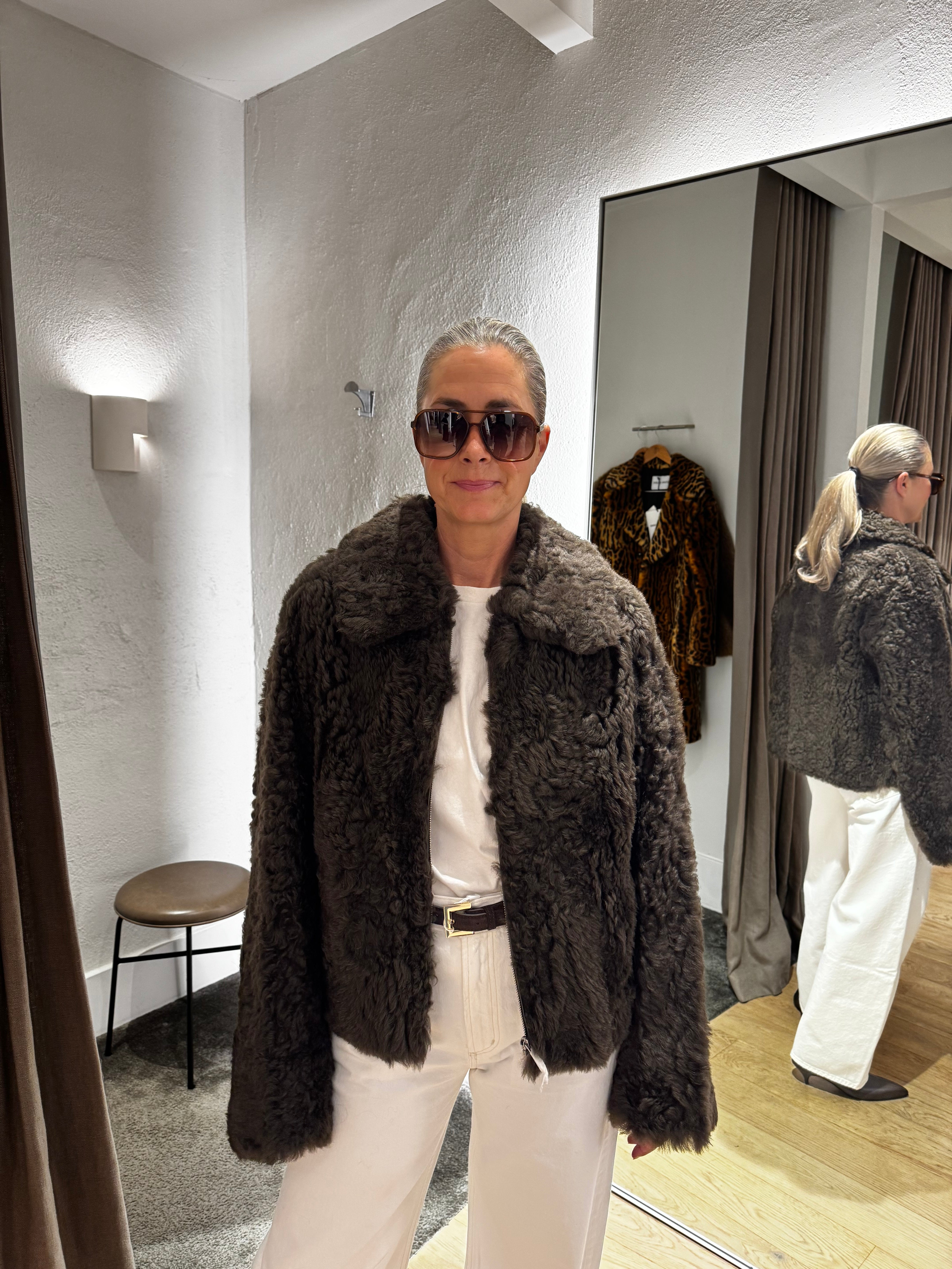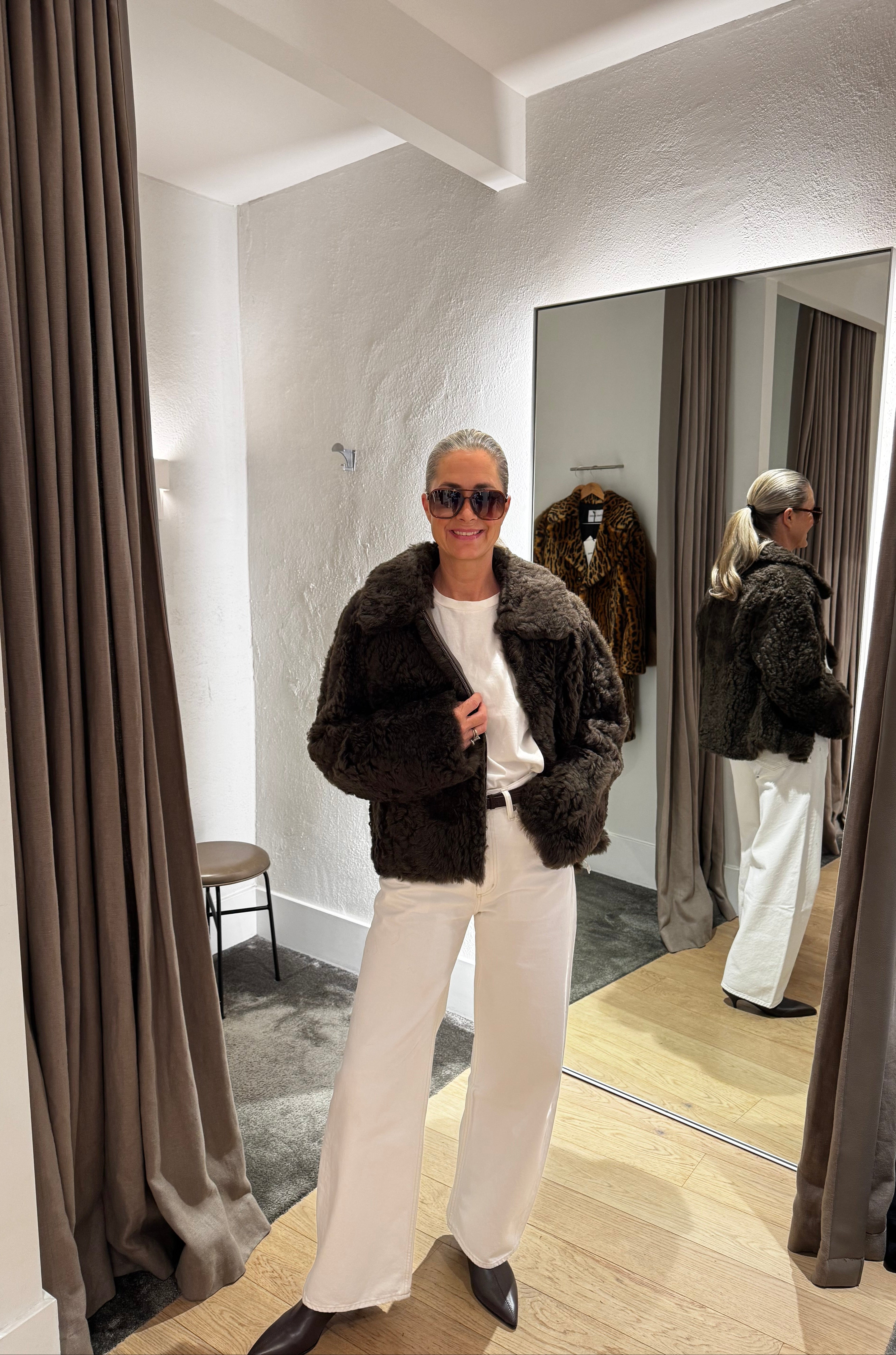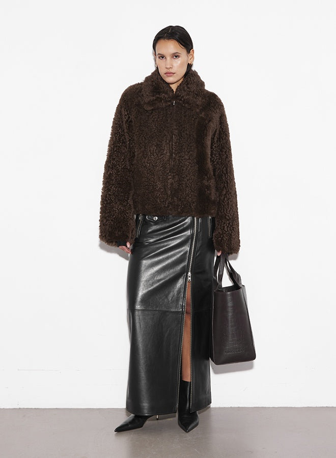 Stand Studio Kenzia Jacket in Dark Brown. The Dark Brown Kenzia Jacket combines plush shearling on the outside with smooth leather lining inside, creating a perfect balance of warmth and refinement. Ideal for crisp days or evening outings, style it with tailored trousers or denim and boots for a modern, elevated look.