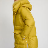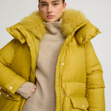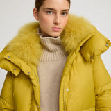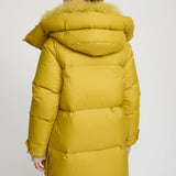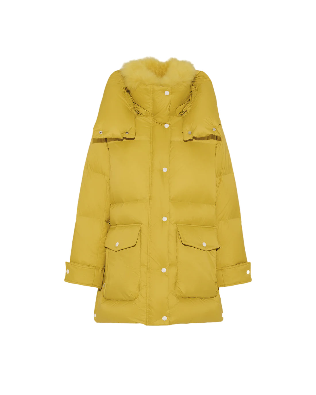 Yves Salomon Down Coat 83cm in Sunflower. The soft, airy texture of Tibetan lambswool provides its outstanding softness for the collar of a high-quality down jacket, which guarantees thermal protection to -10°C. The padding effect on the technical fabric adds an elegant, sporty feel to this jacket which will take you from city streets to ski slopes. Collar and hood are removable. Two large pockets welcome hands and phone. A zip flap and hidden ribbing at the sleeves provide further protection against the elements.