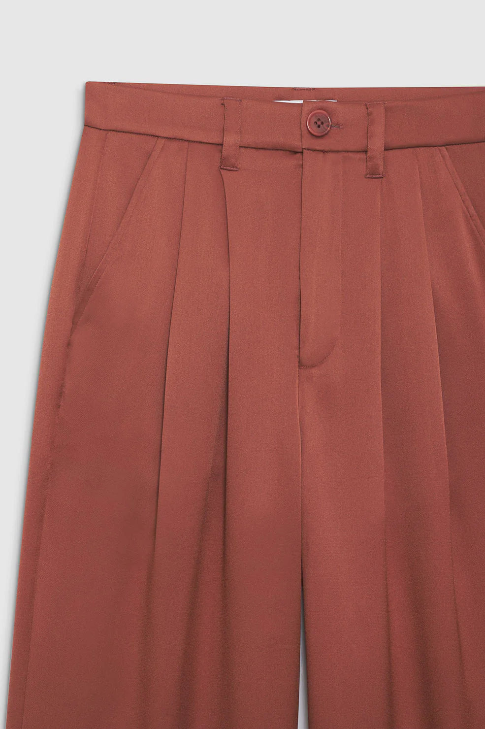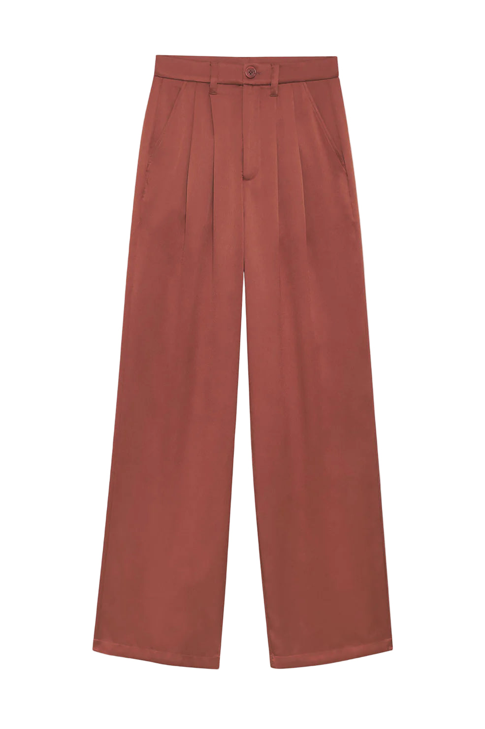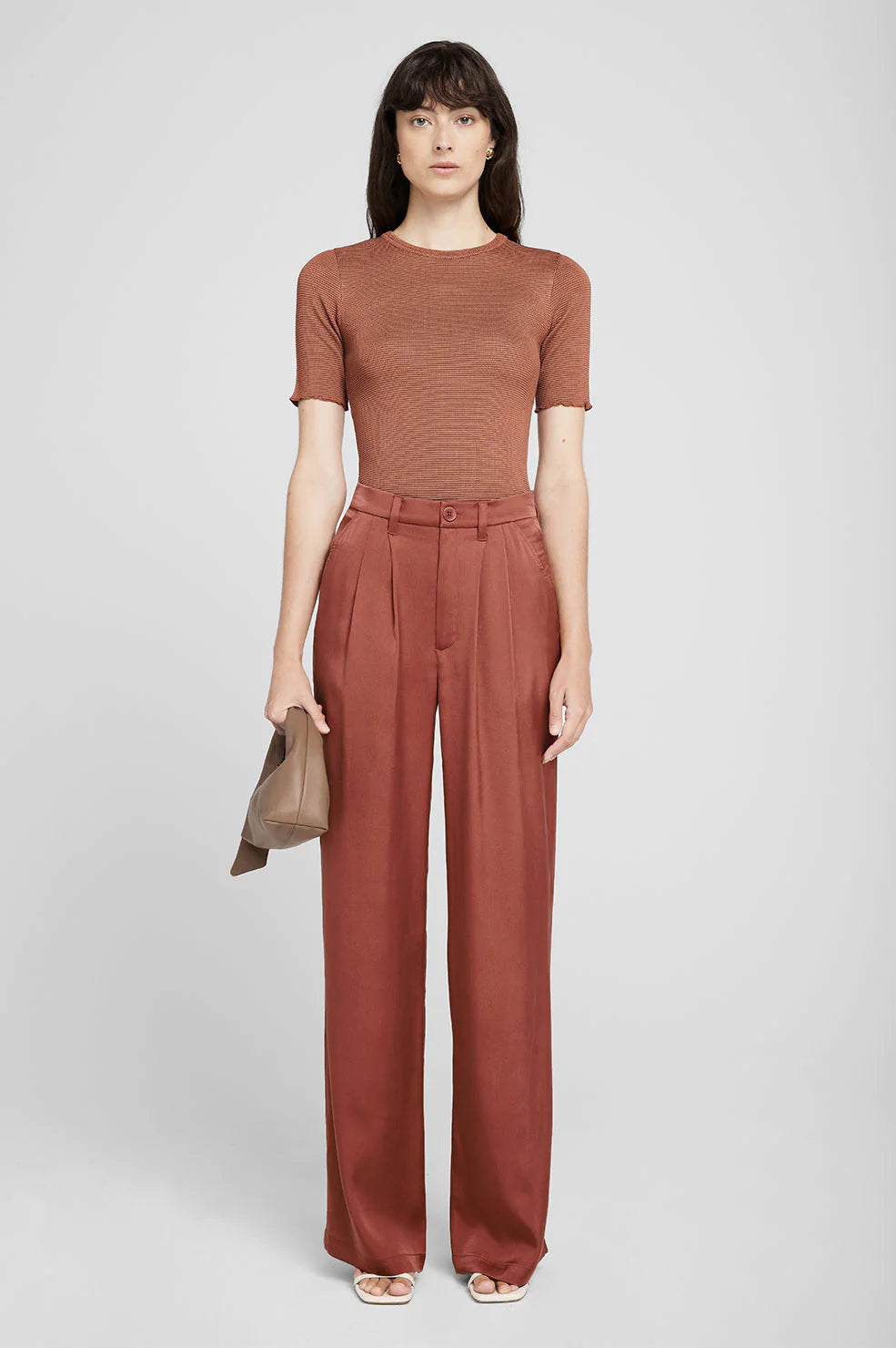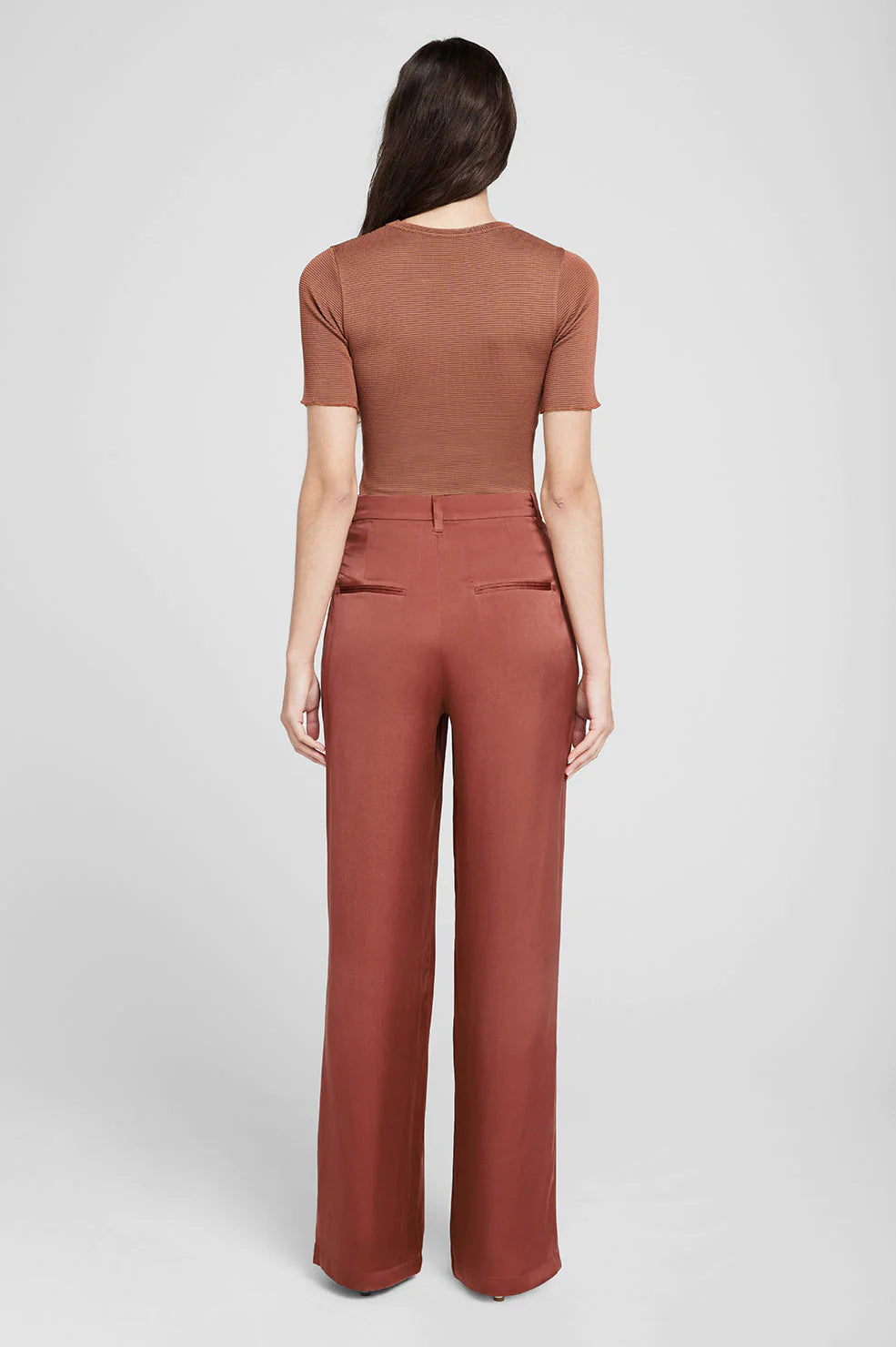 The best-selling Carrie Pant updated in terracotta 25 mm double-faced silk charmeuse. This wide-leg, full-length trouser features double-pleated front detailing, five functional belt loops, two back welt pockets, slanted front pockets, and a single button zip-front closure.