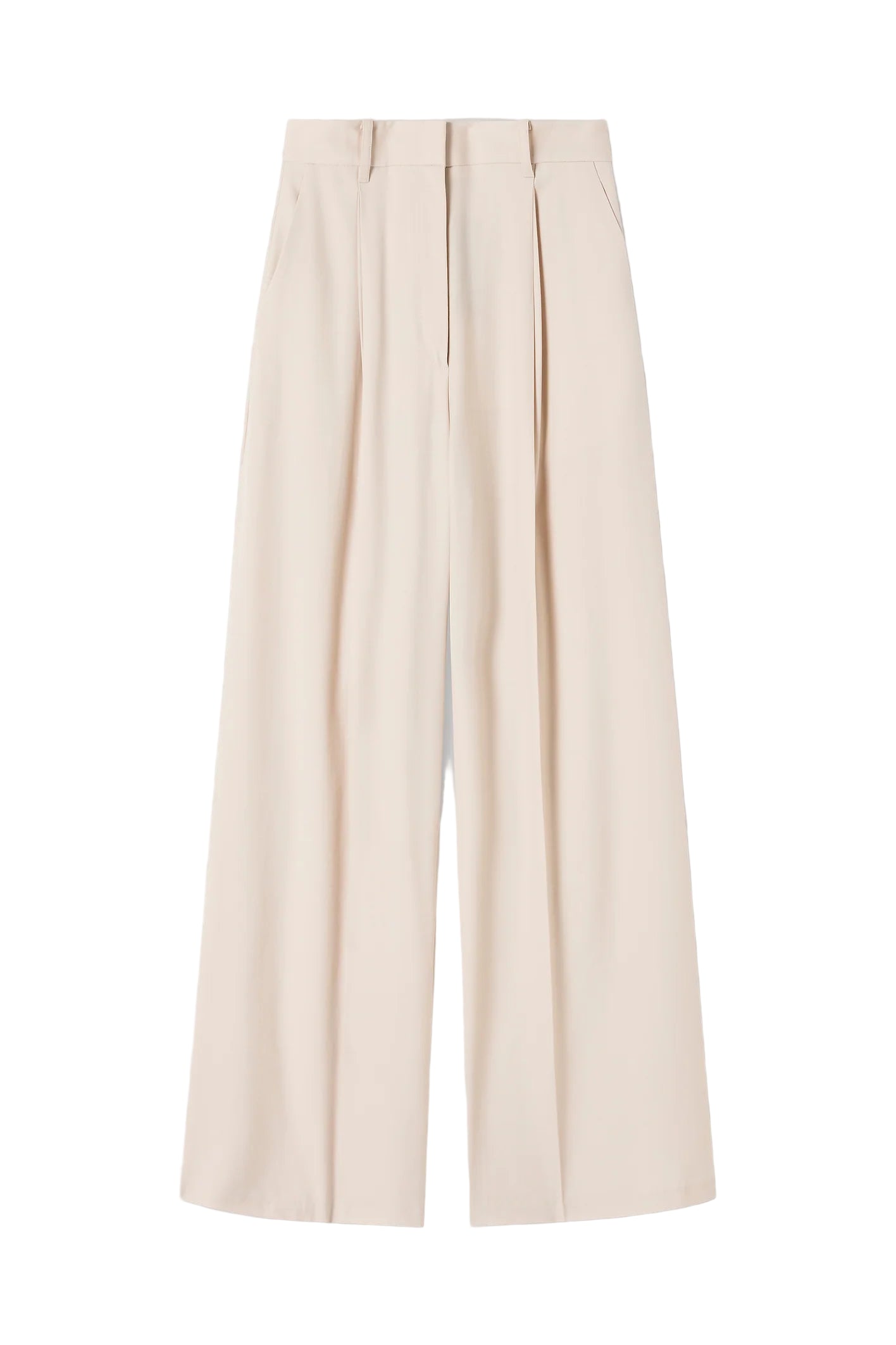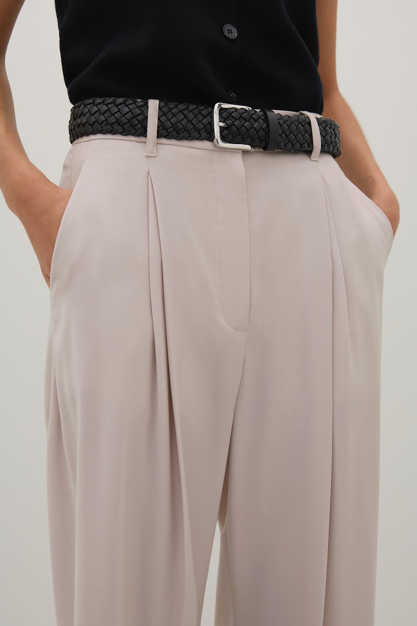 A wide leg silhouette crafted from a lightweight tropical wool, with double pleats falling from the waistband. The side seams are moved towards the back, elegantly cutting off the jet pocket.