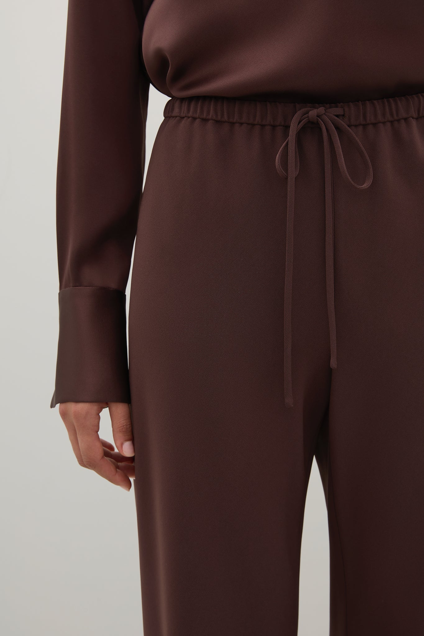 A Emery Estee Bias Pant ln Matte in Bordeaux. Crafted from a matte Japanese triacetate, the Estee Bias Pant is cut on the bias to drape effortlessly on the body with a drawstring waist offering comfort and ease of wear.