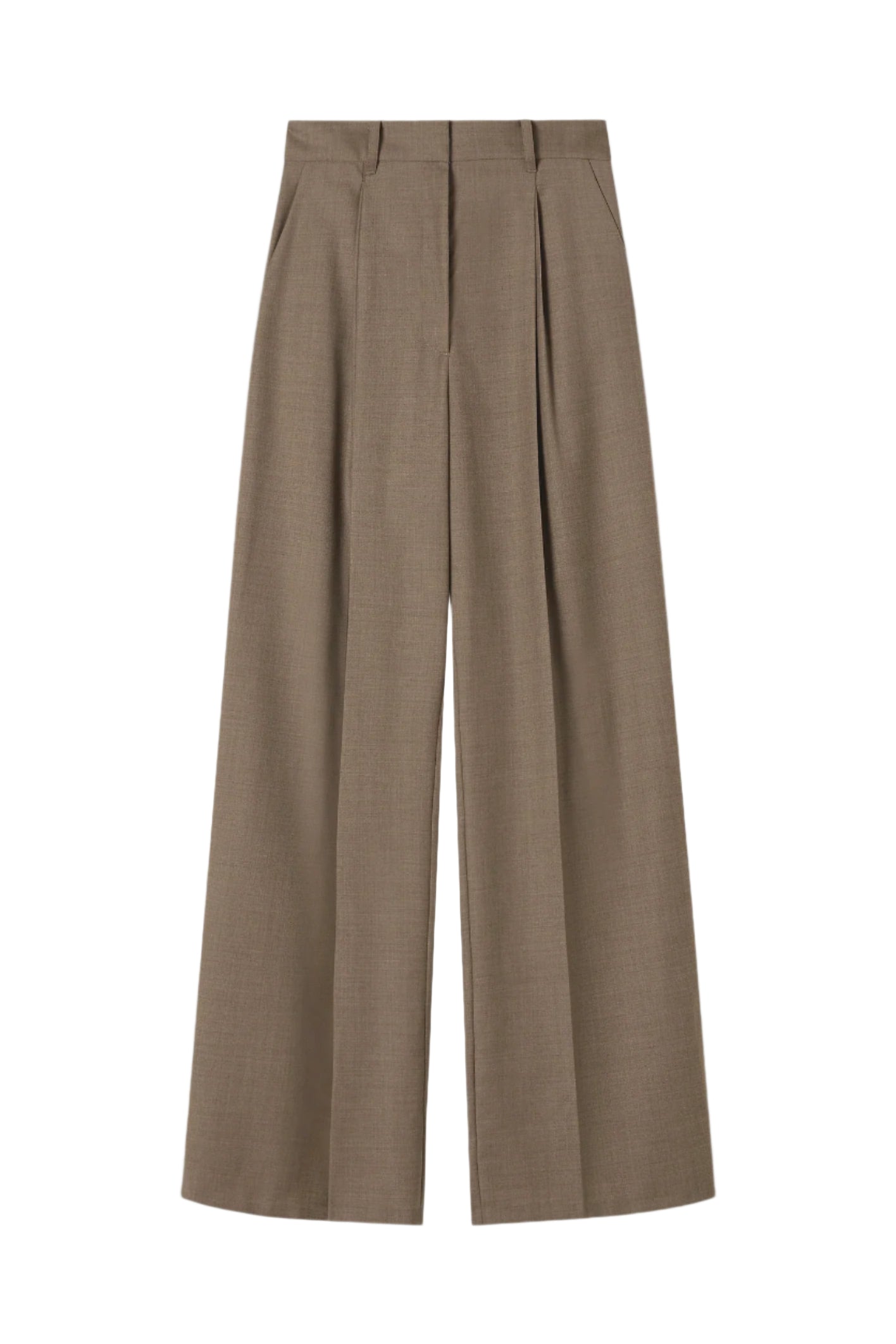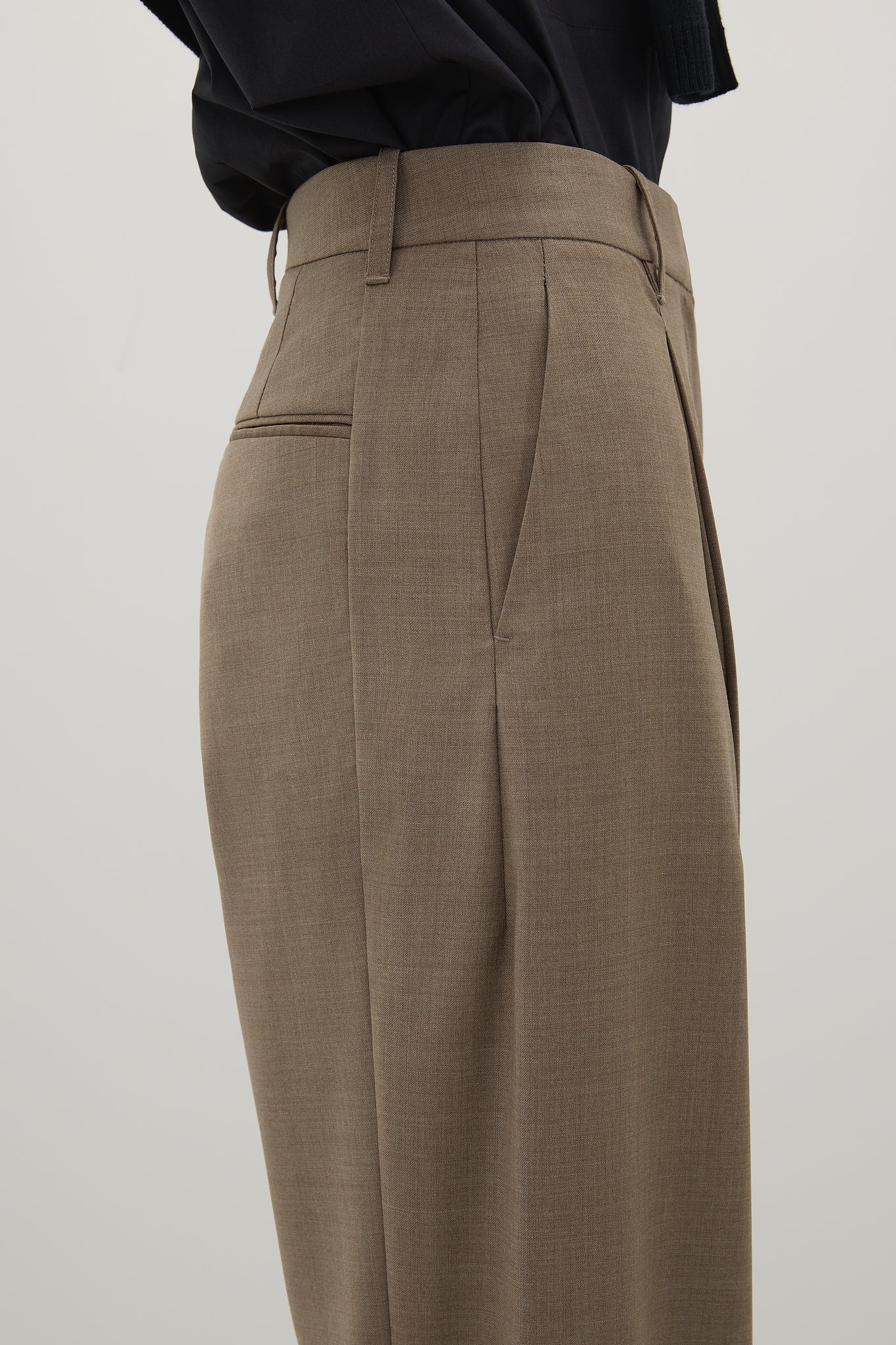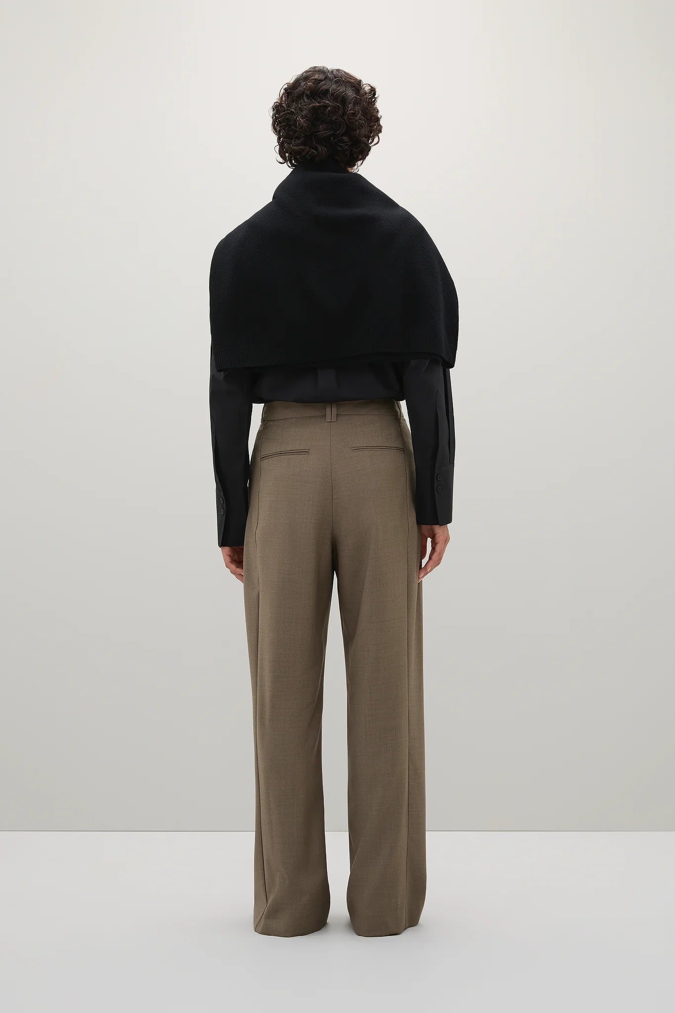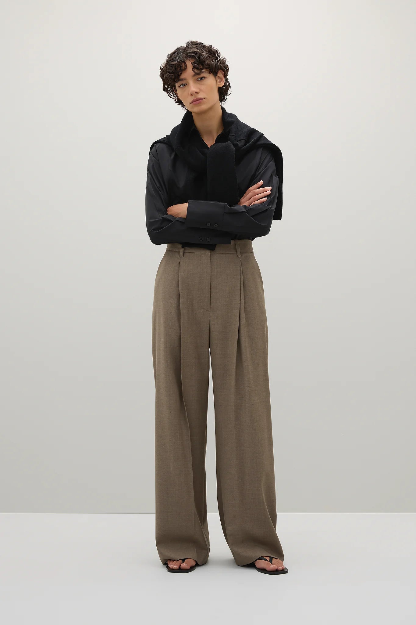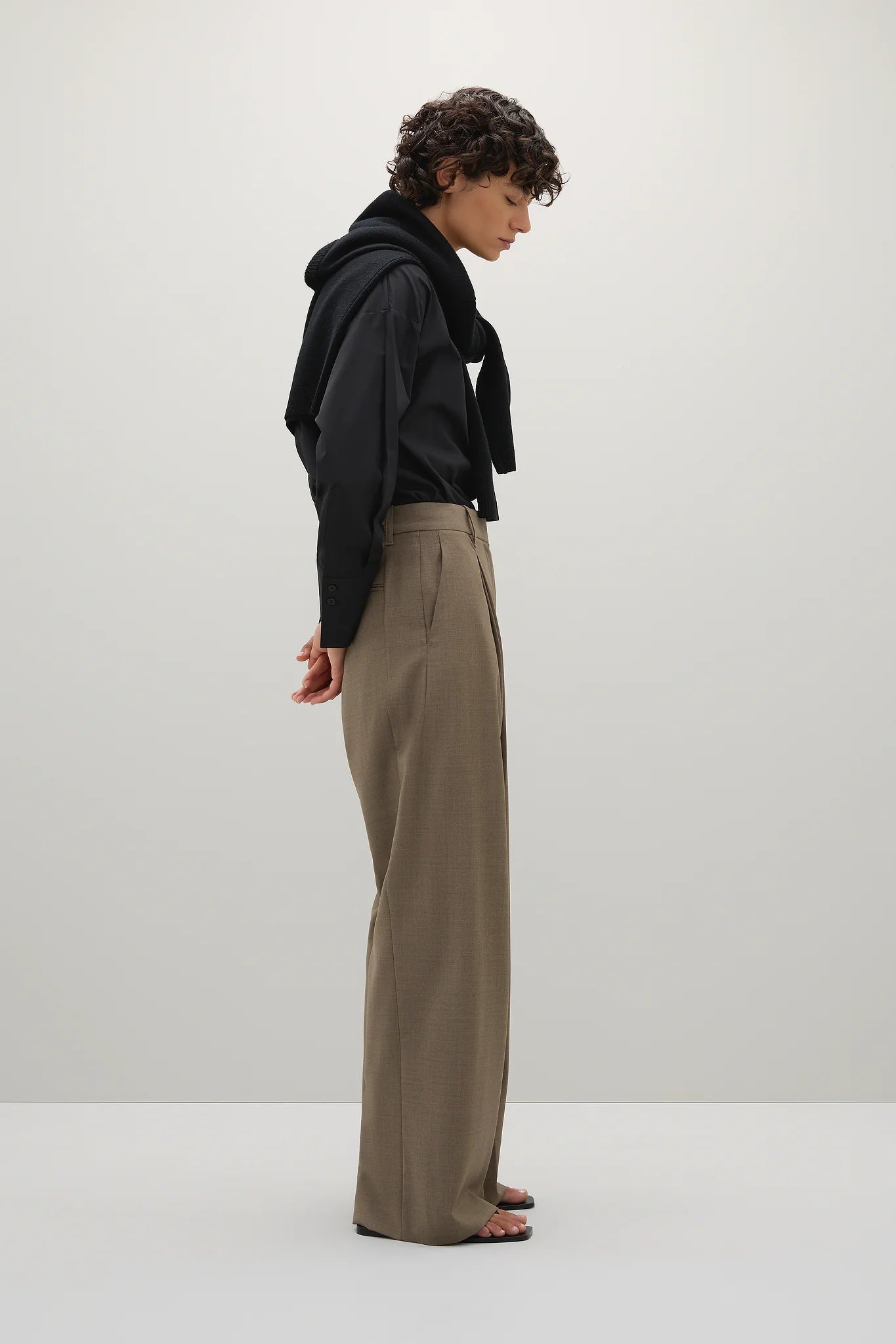 A wide leg silhouette crafted from a lightweight tropical wool, with double pleats falling from the waistband. The side seams are moved towards the back, elegantly cutting off the jet pocket.