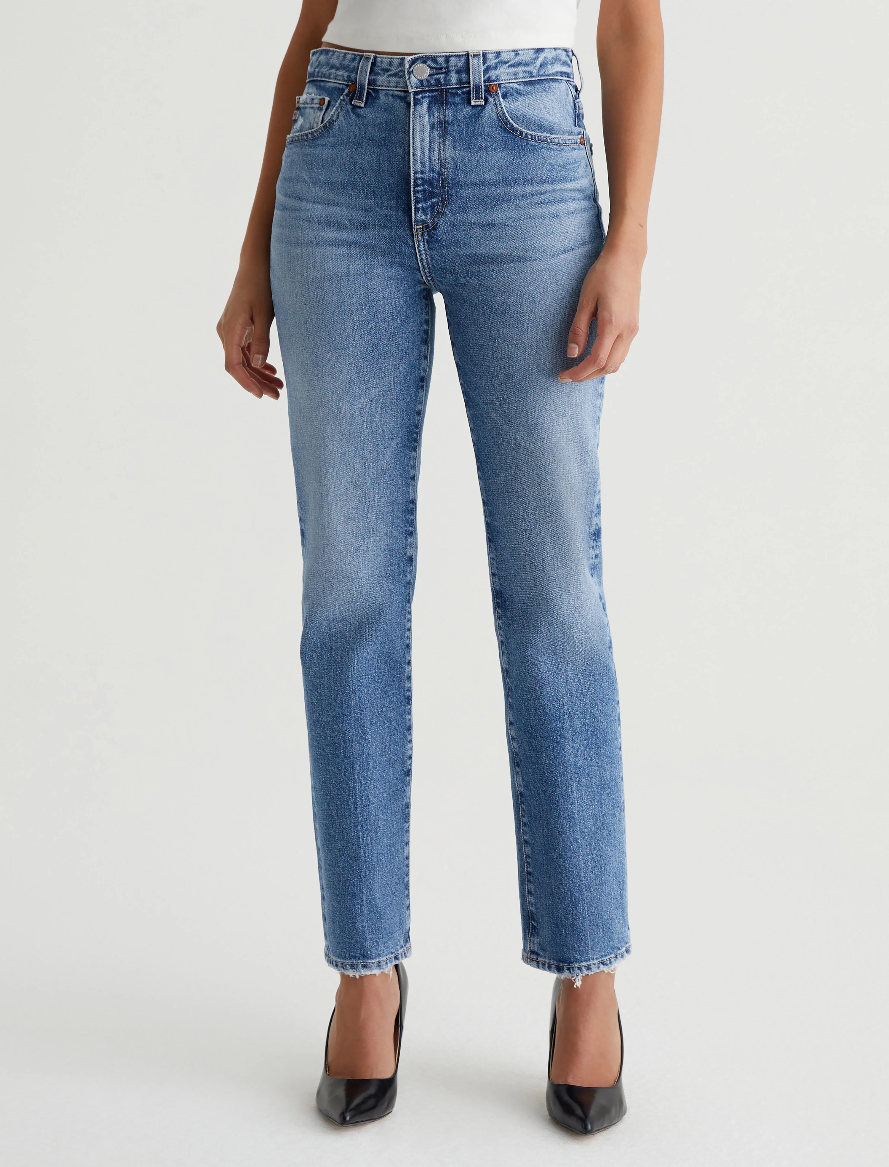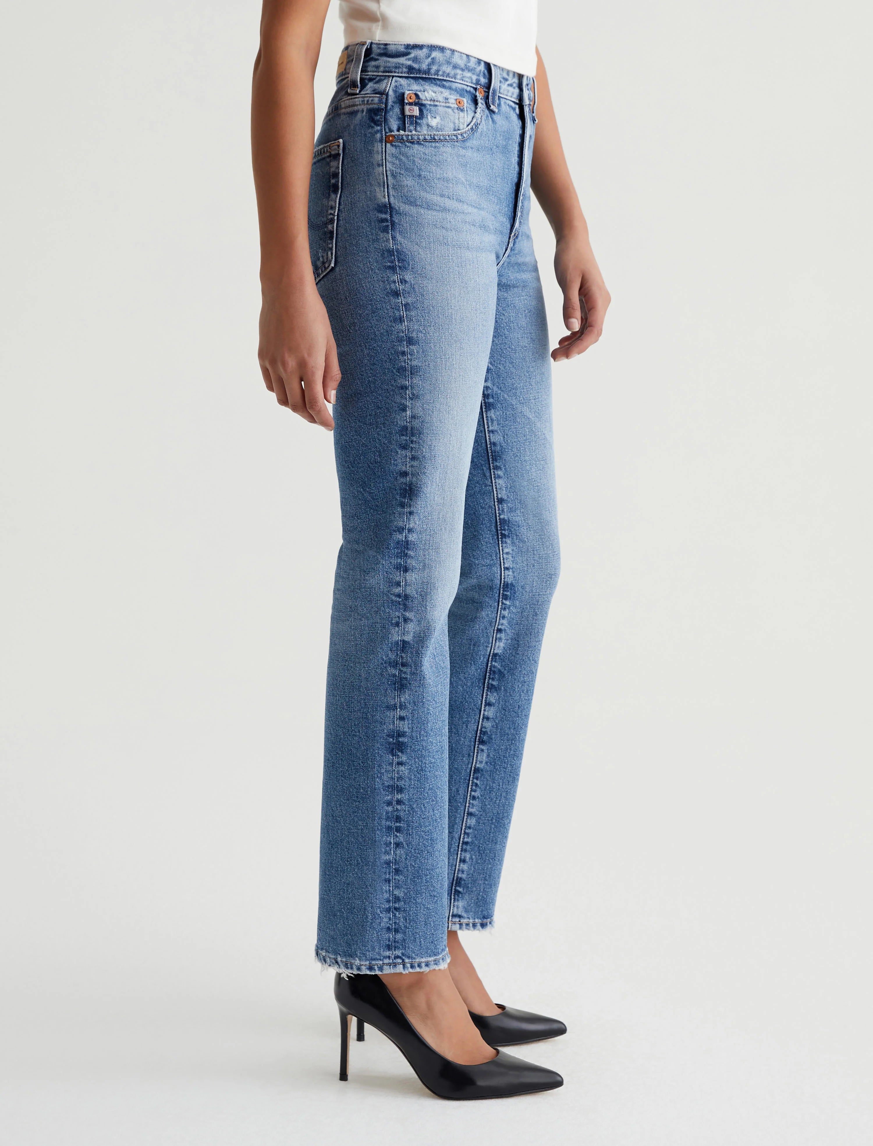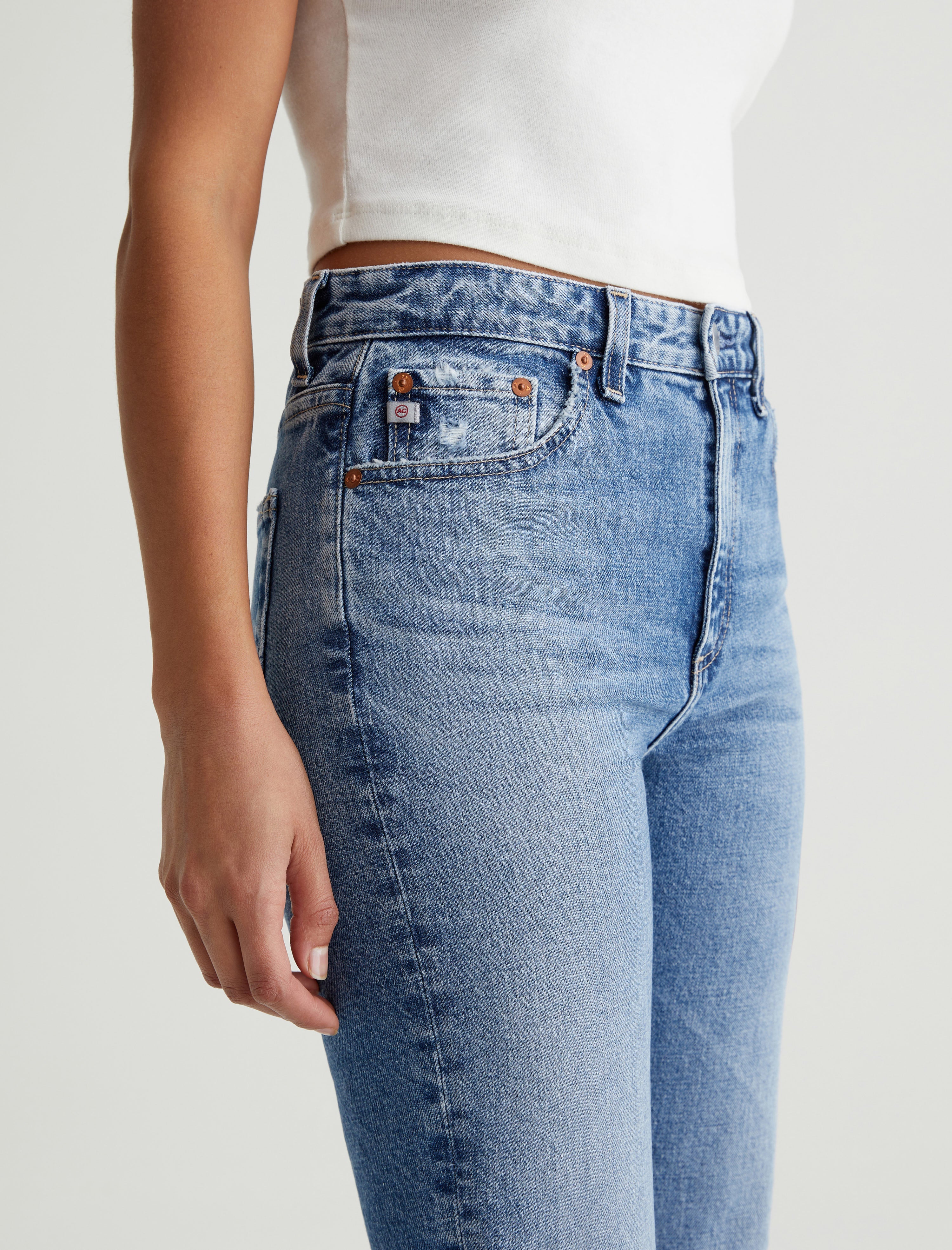 Saige is a women's high-rise straight jean in a faded light blue wash with subtle distressing and a touch of fraying at the hems. These straight-leg jeans are cut from 11 oz. 360° Denim with vintage bi-stretch for a comfortable fit. Saige is complete with a zip fly, angled yoke, and slightly forward side seams.