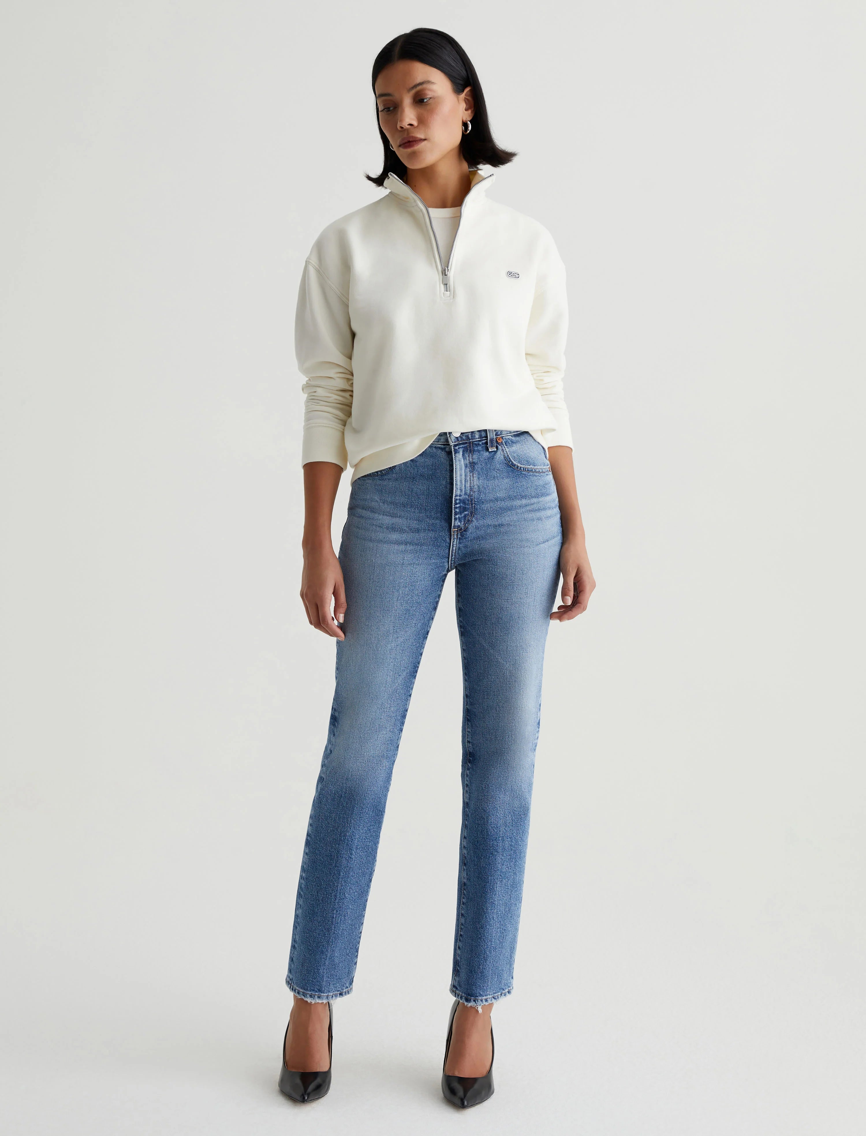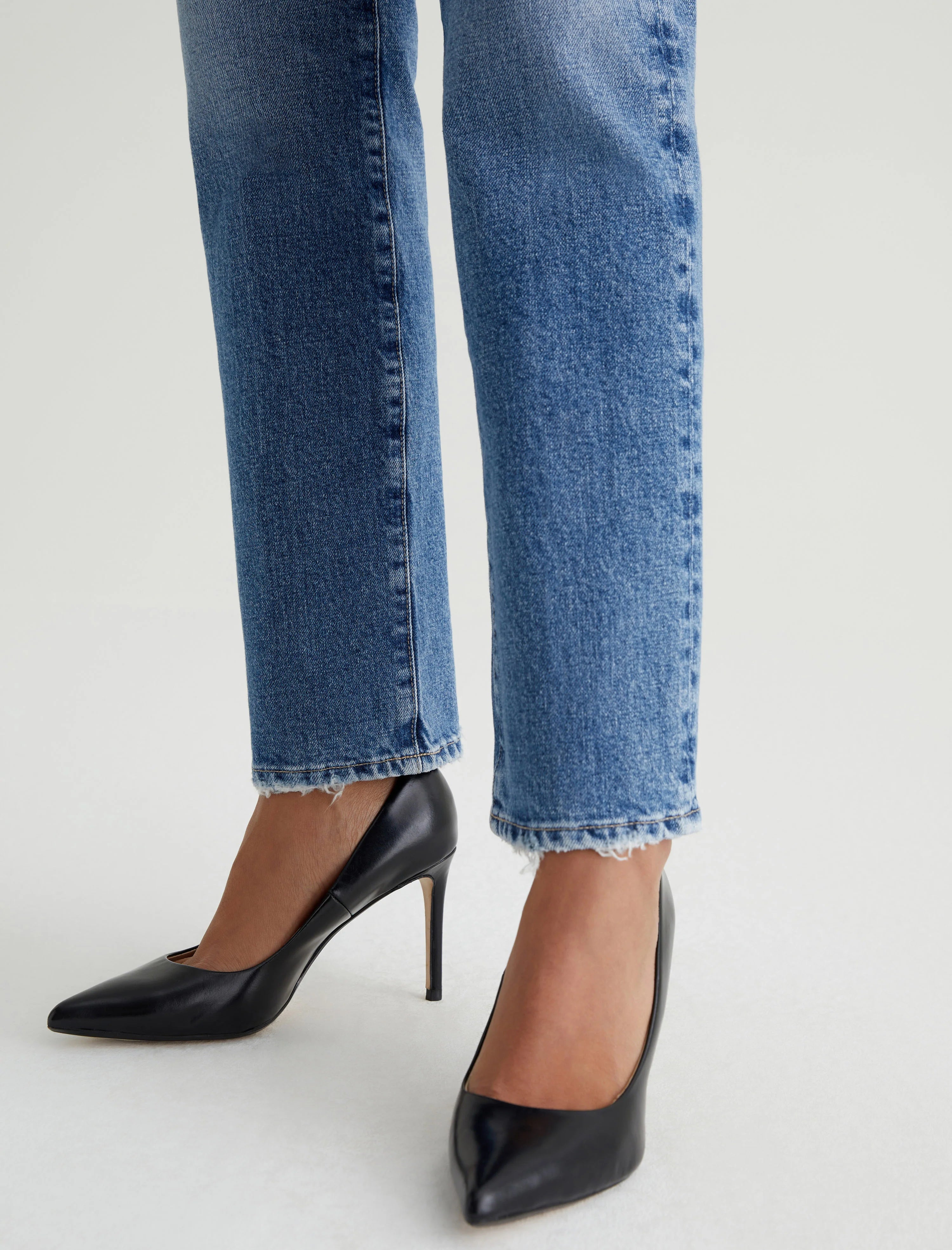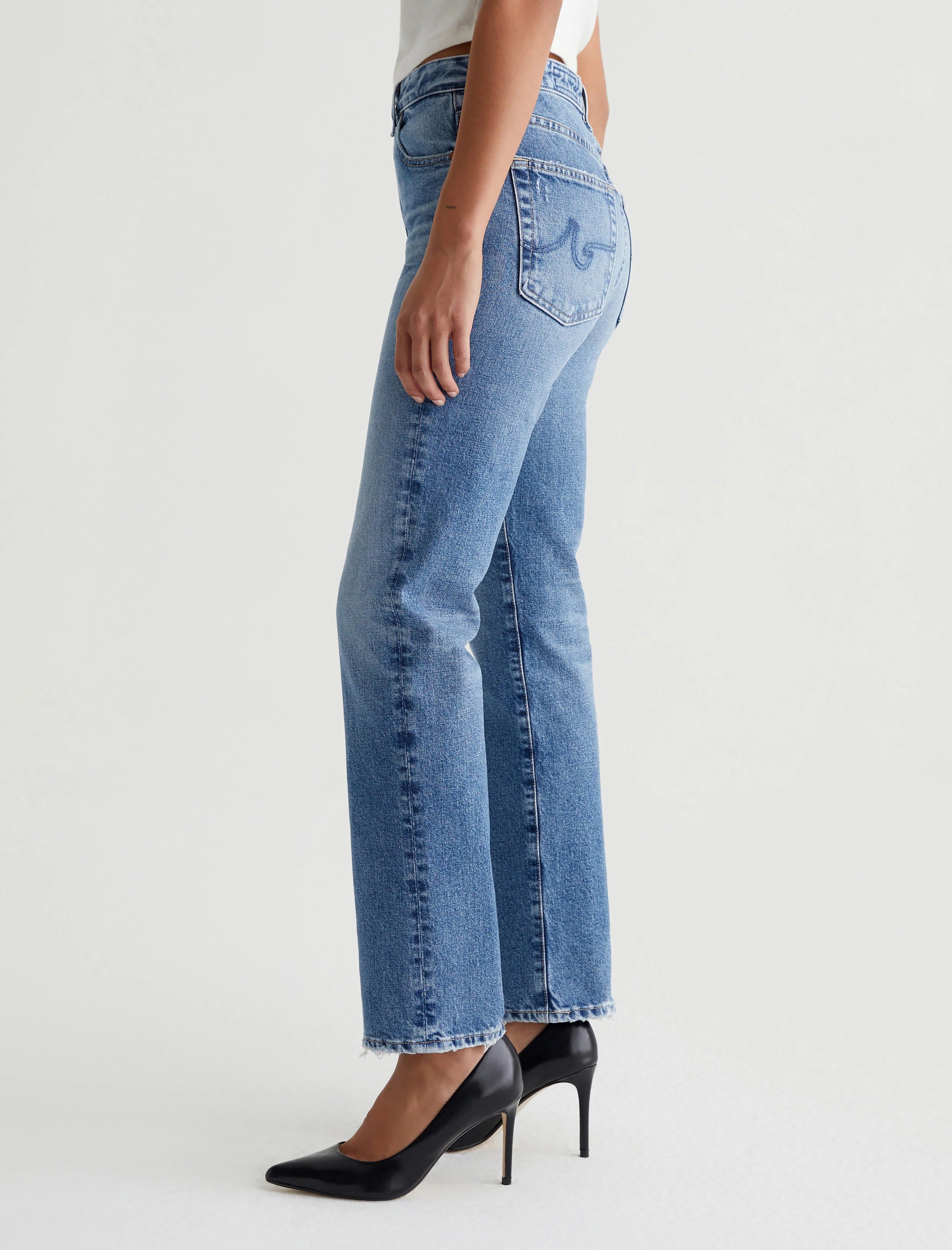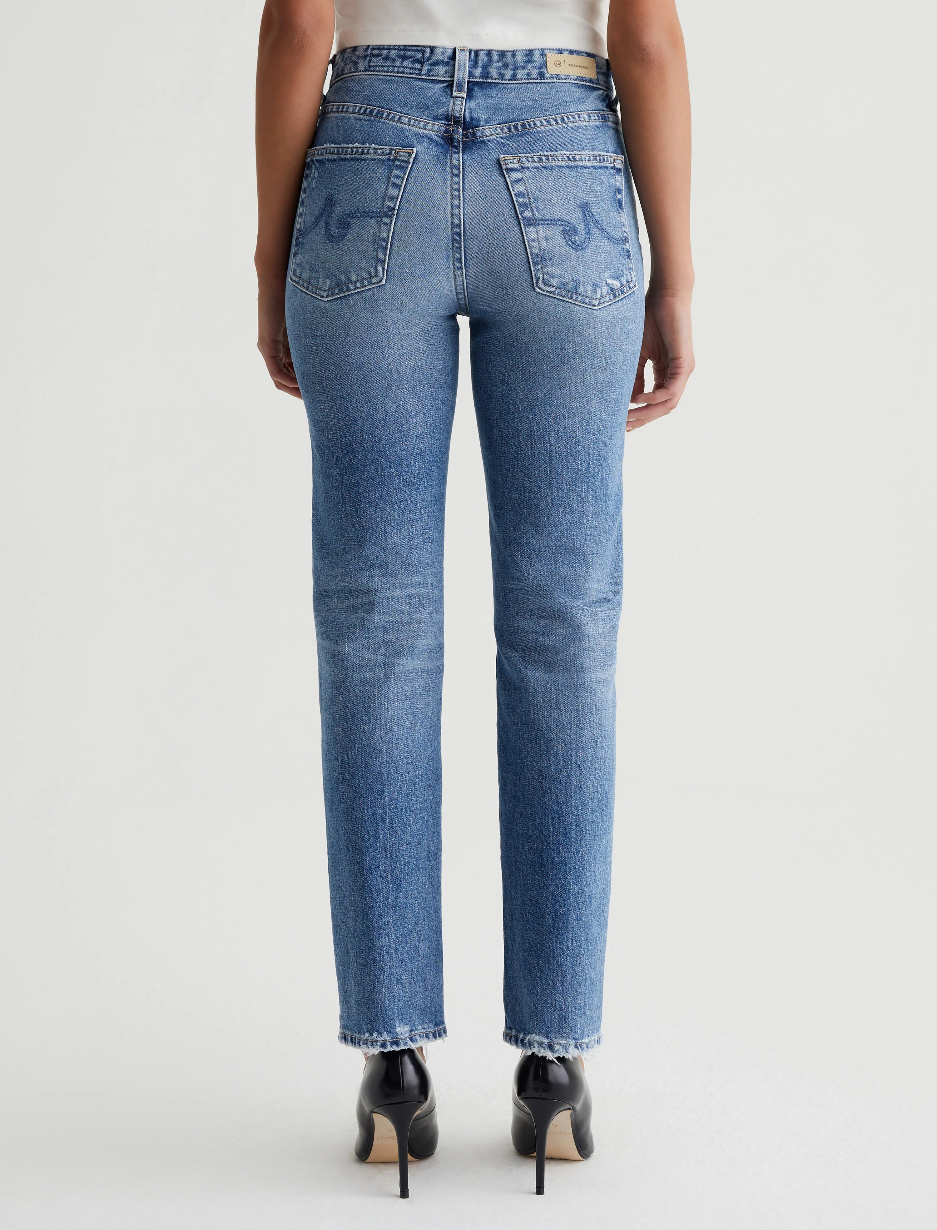 Saige is a women's high-rise straight jean in a faded light blue wash with subtle distressing and a touch of fraying at the hems. These straight-leg jeans are cut from 11 oz. 360° Denim with vintage bi-stretch for a comfortable fit. Saige is complete with a zip fly, angled yoke, and slightly forward side seams.