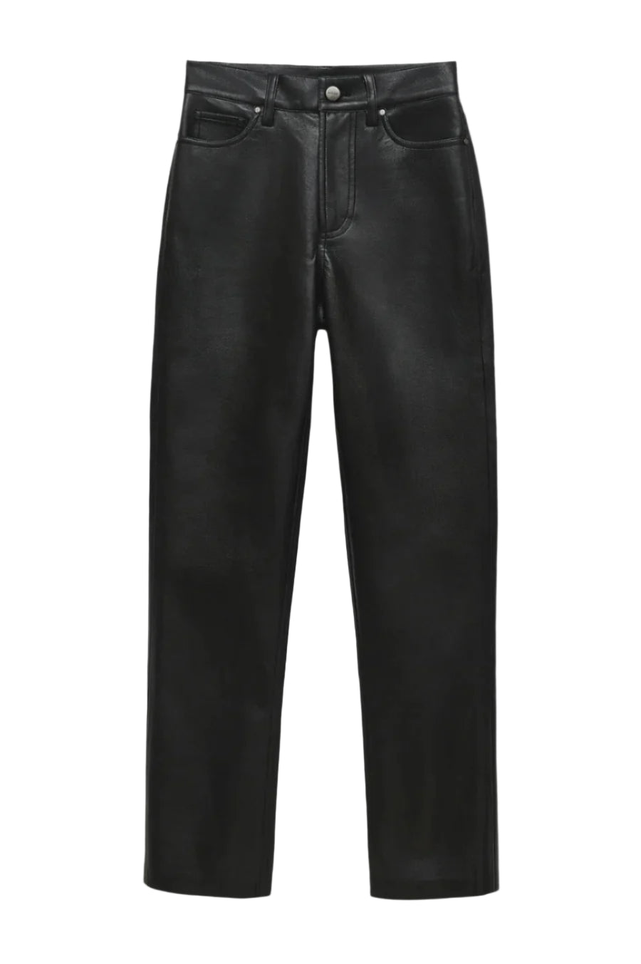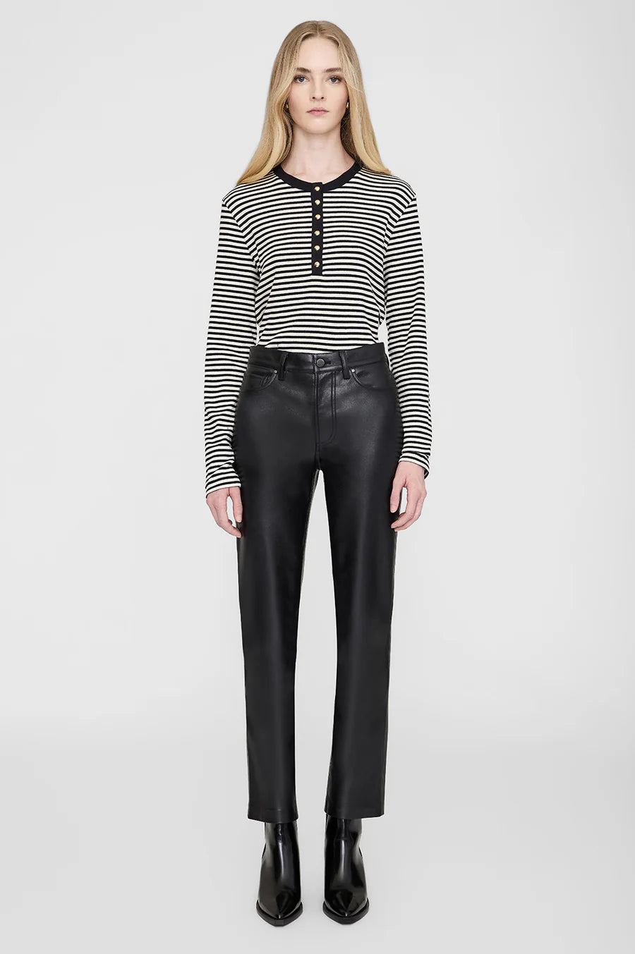 Anine Bing Bruno Pant in Black Recycled Leather. The Bruno Pant is constructed from soft yet structured regenerated leather with a slight sheen and without stretch. Its traditional denim-inspired silhouette features a 5-pocket design, zip-front closure, and a slim-straight leg with a clean, ankle-length hem.