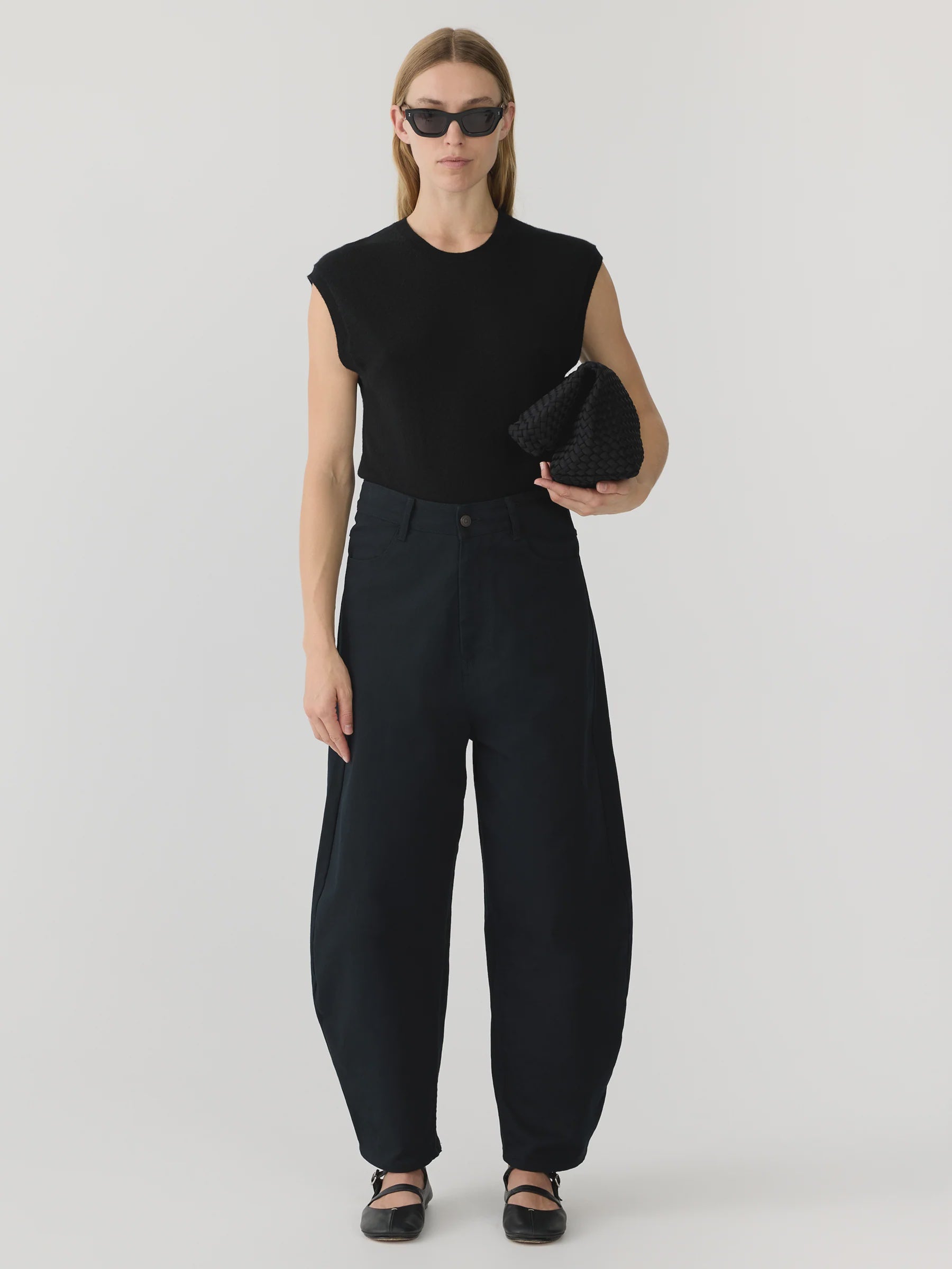 Bassike Cotton Twill Barrel Leg Pant in Black. Crafted in premium cotton twill, the cotton twill barrel leg pant is designed for an voluminous, tapered fit. A contemporary take on the traditionally slouchy pant, this high rise style features a curved silhouette throughout the leg. Complete with a classic jean style front fastening, side entry pockets and rear patch pockets.