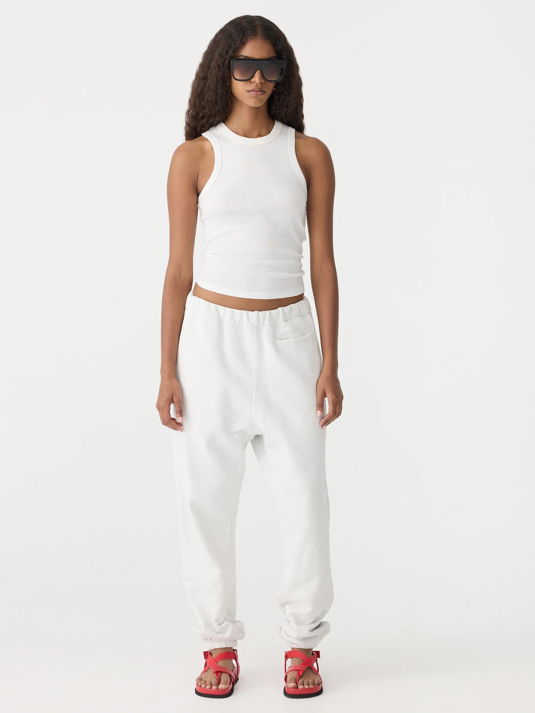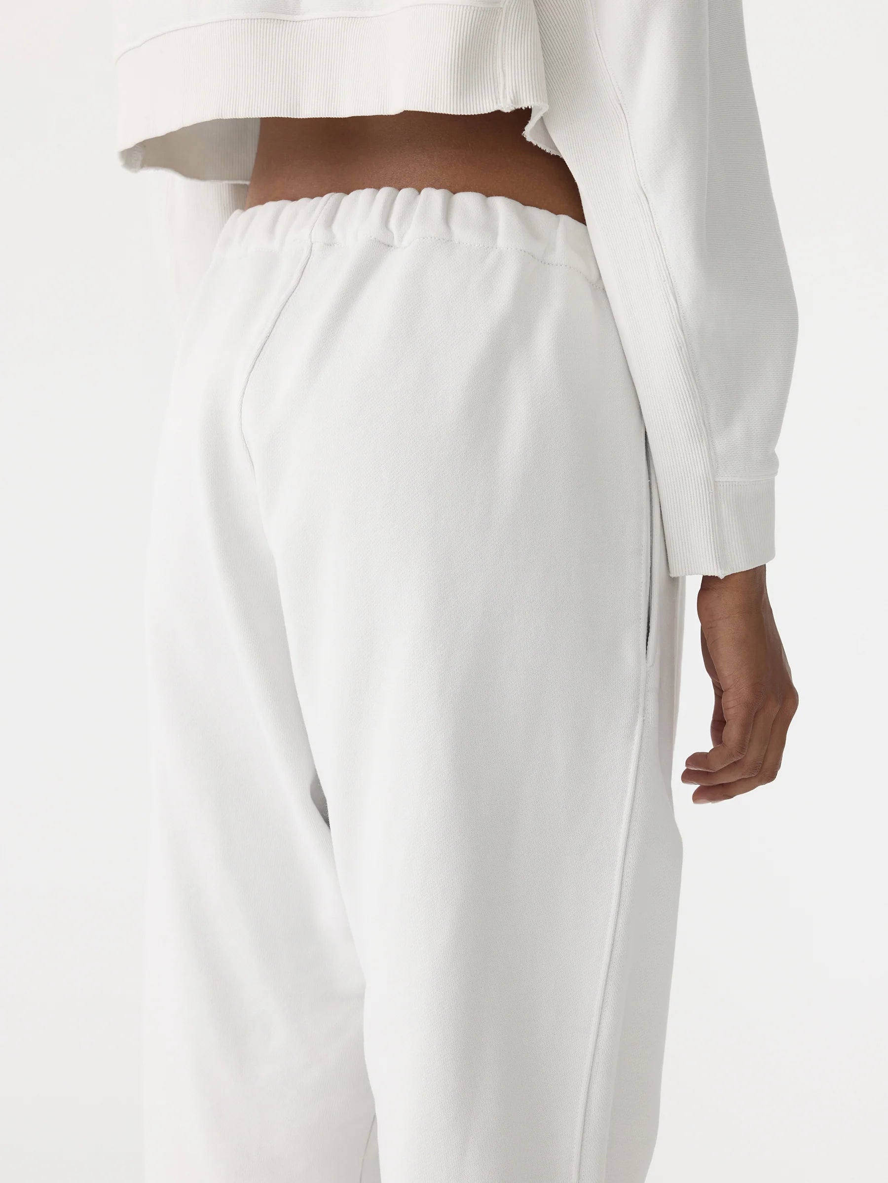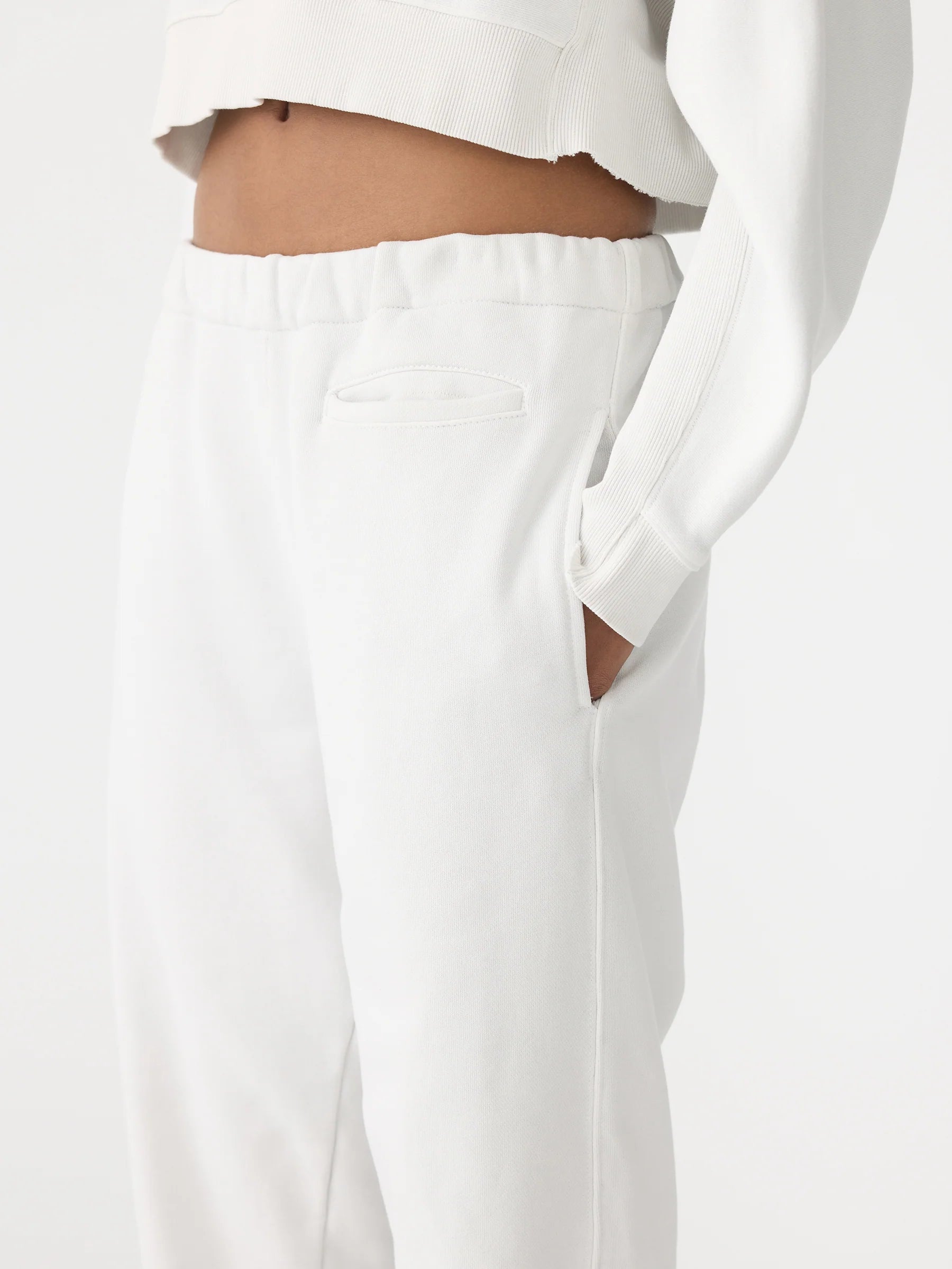 Bassike Fleece Trackpant in Antique White. Crafted from heavyweight cotton fleece, the Fleece Trackpant is designed for a regular fit. A classic trackpant silhouette featuring an elasticated waistband and ribbed hem cuffs. Finished with side entry pockets and a front coin pocket.