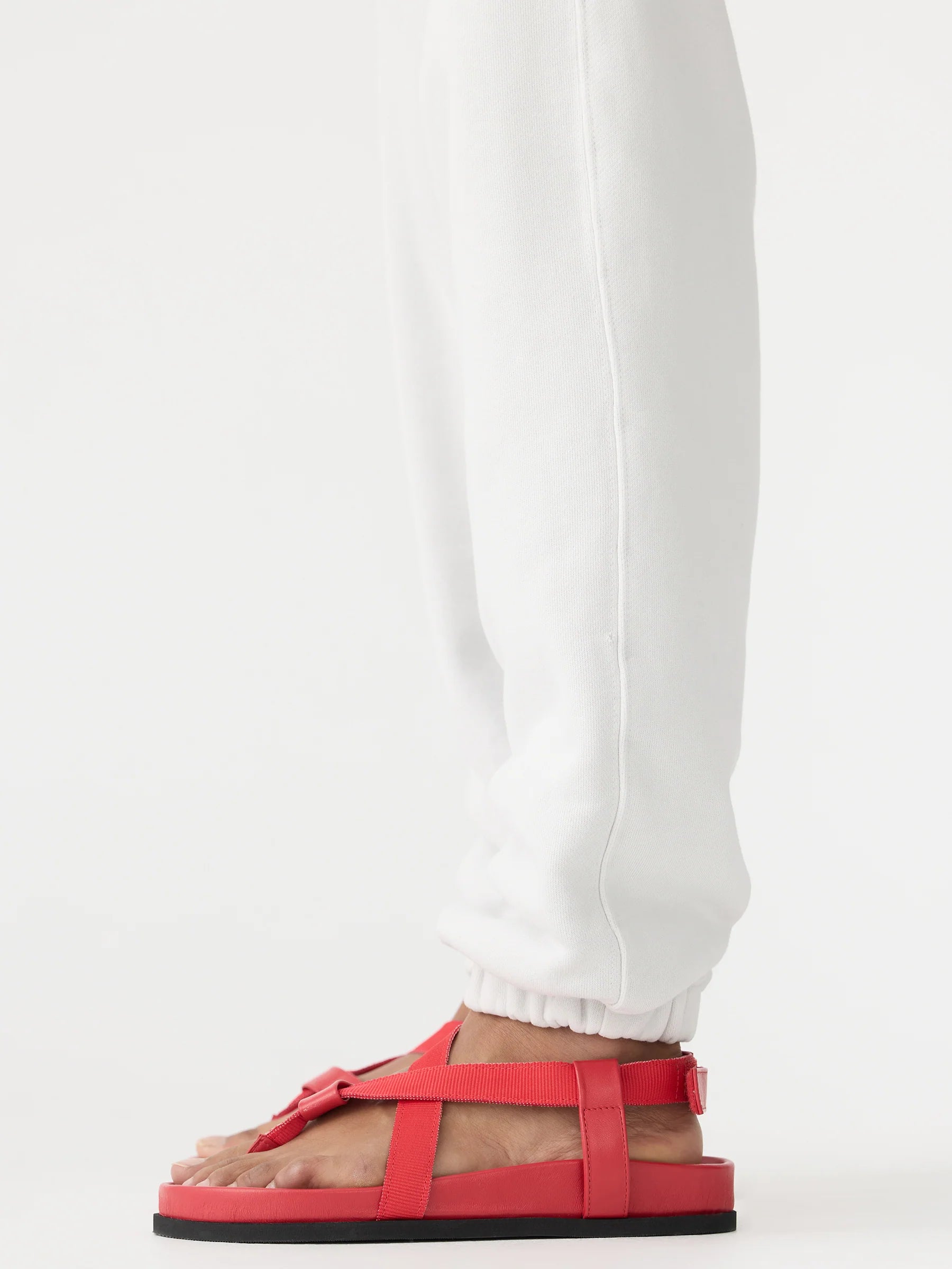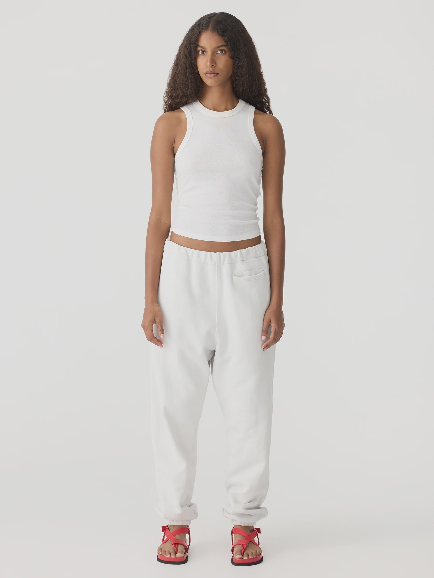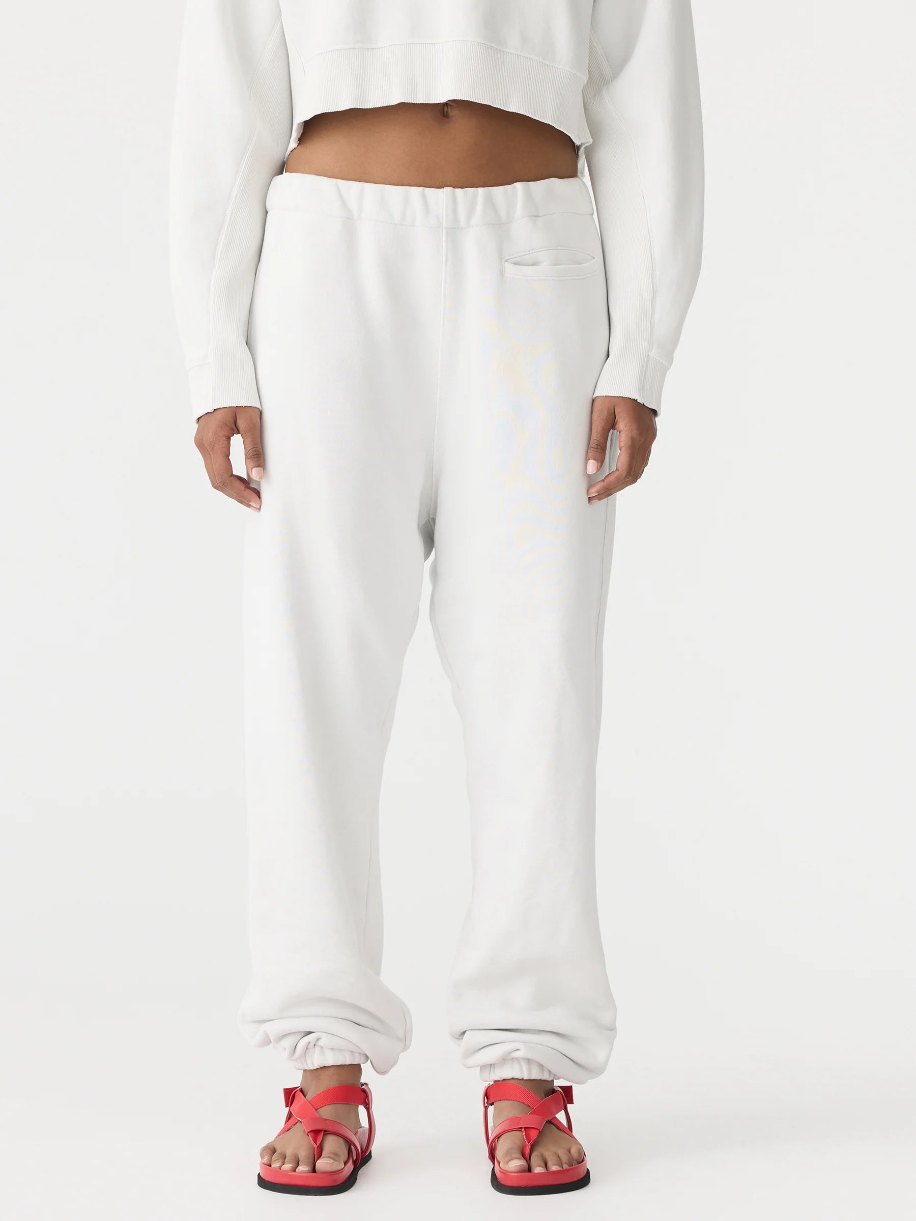 Bassike Fleece Trackpant in Antique White. Crafted from heavyweight cotton fleece, the Fleece Trackpant is designed for a regular fit. A classic trackpant silhouette featuring an elasticated waistband and ribbed hem cuffs. Finished with side entry pockets and a front coin pocket.