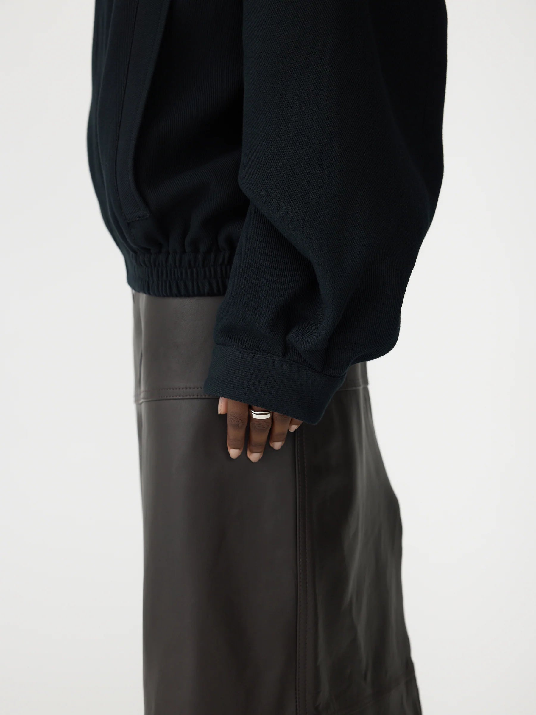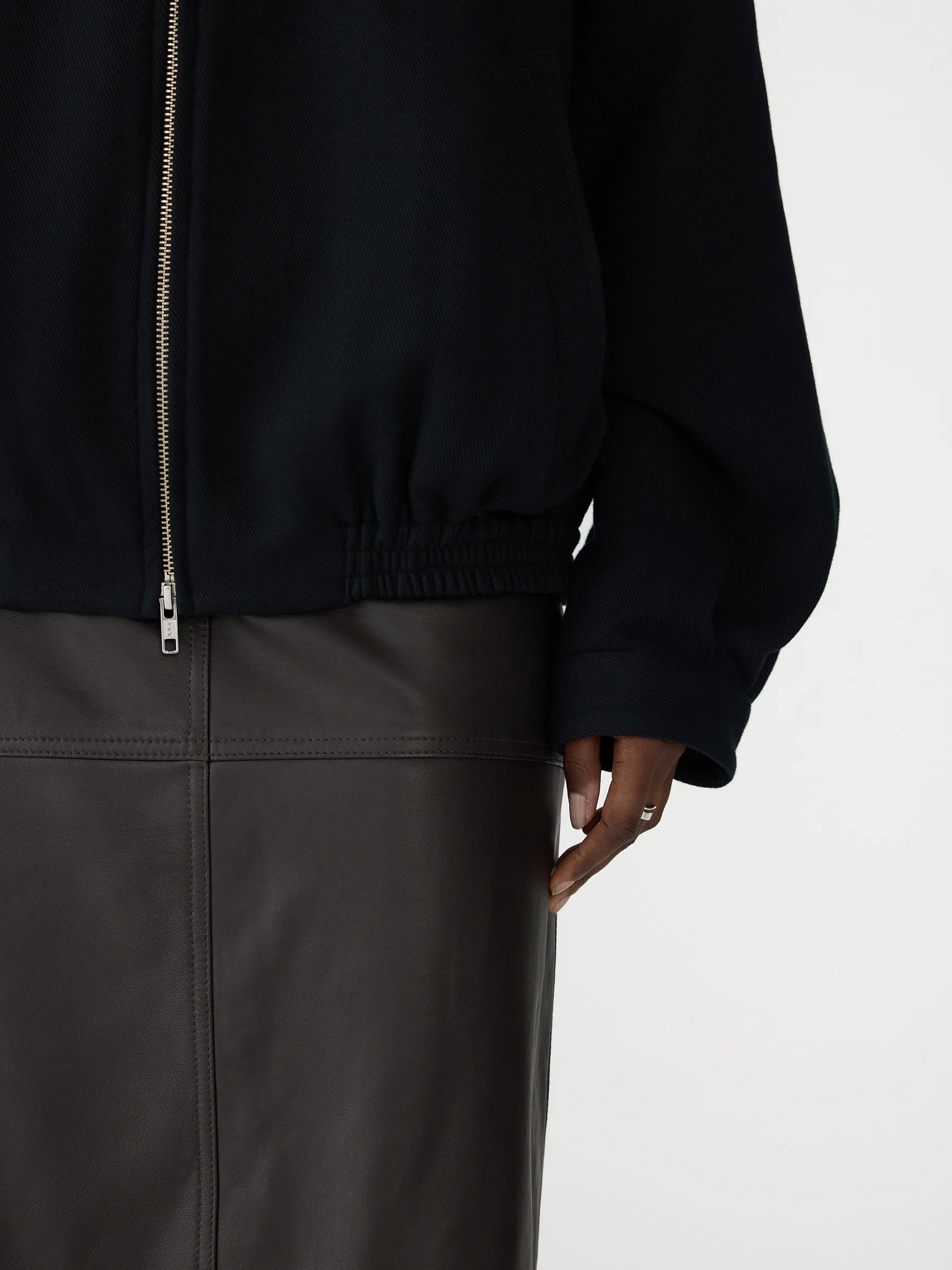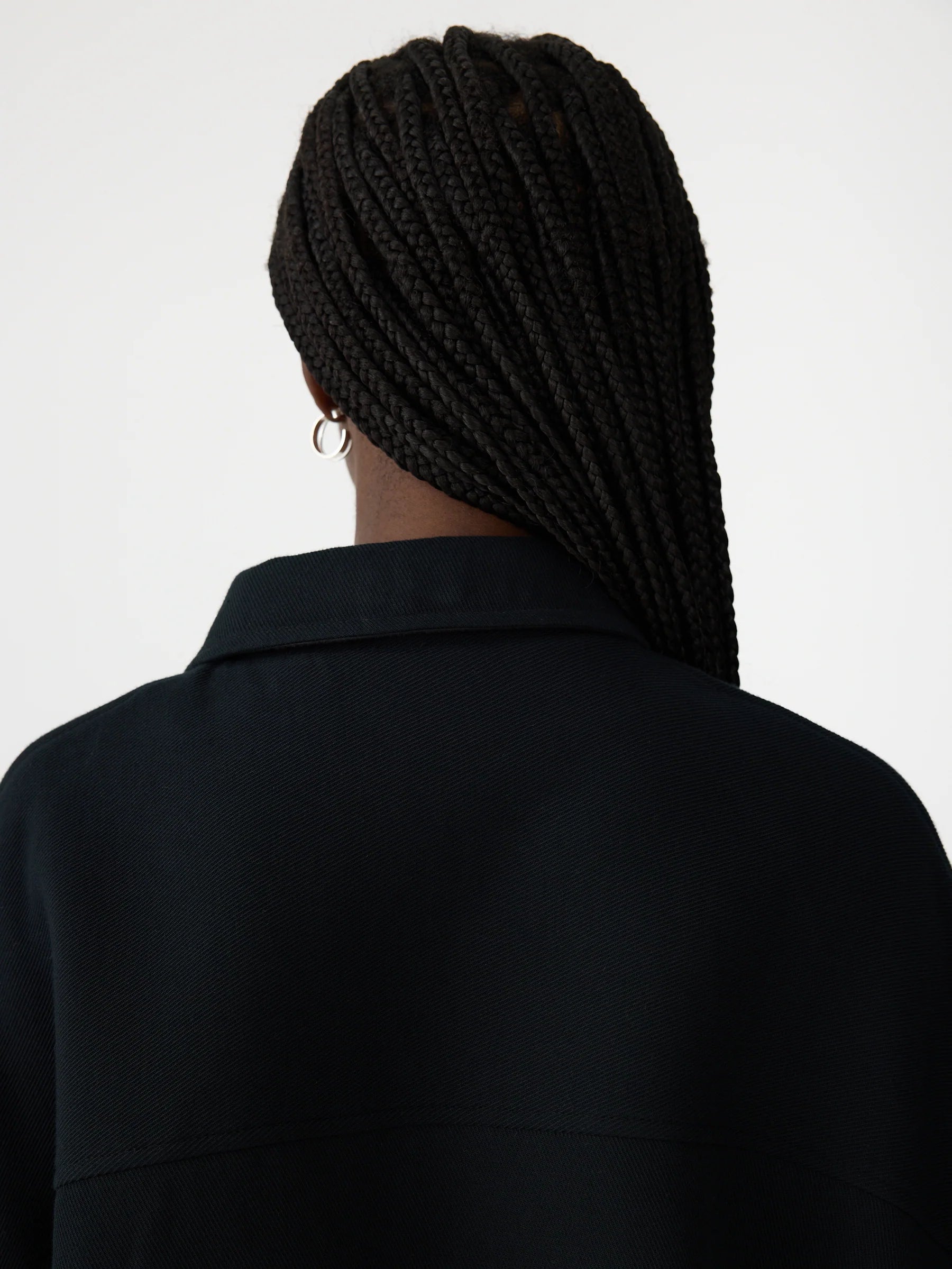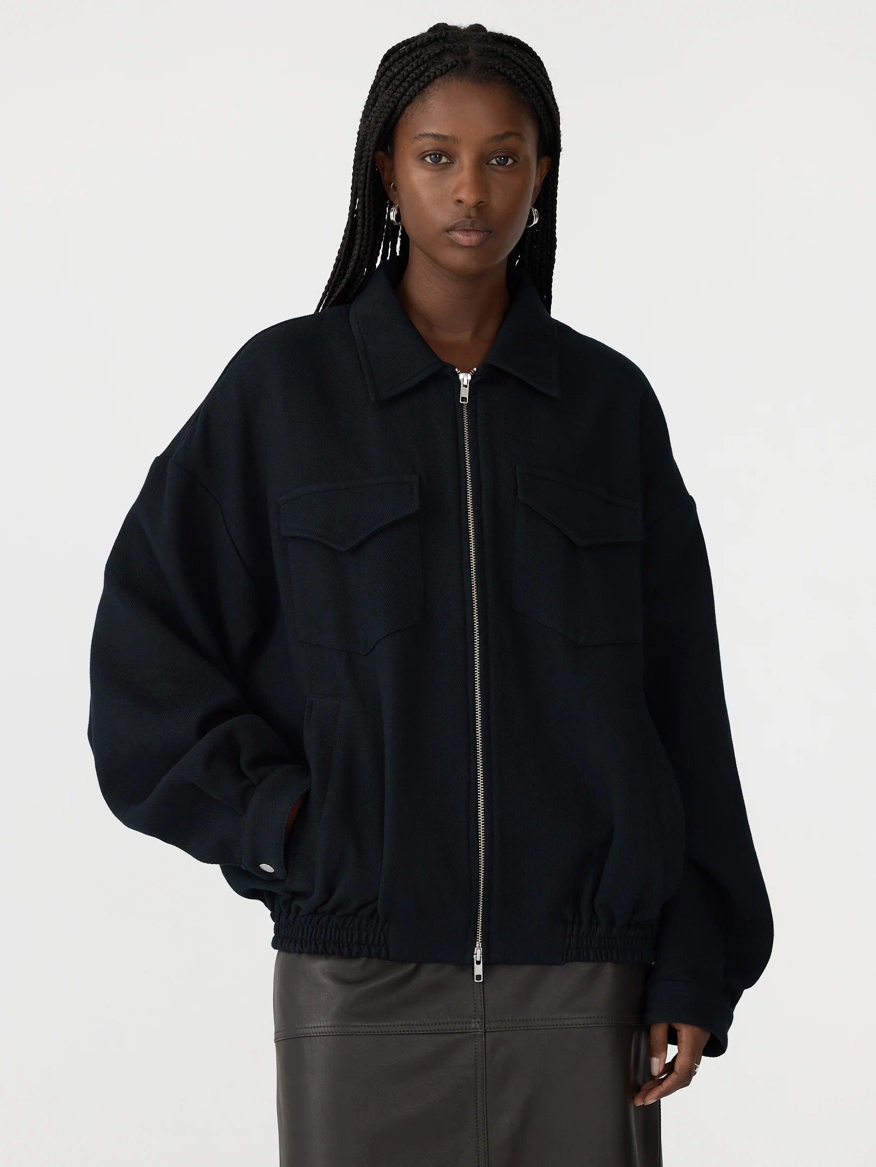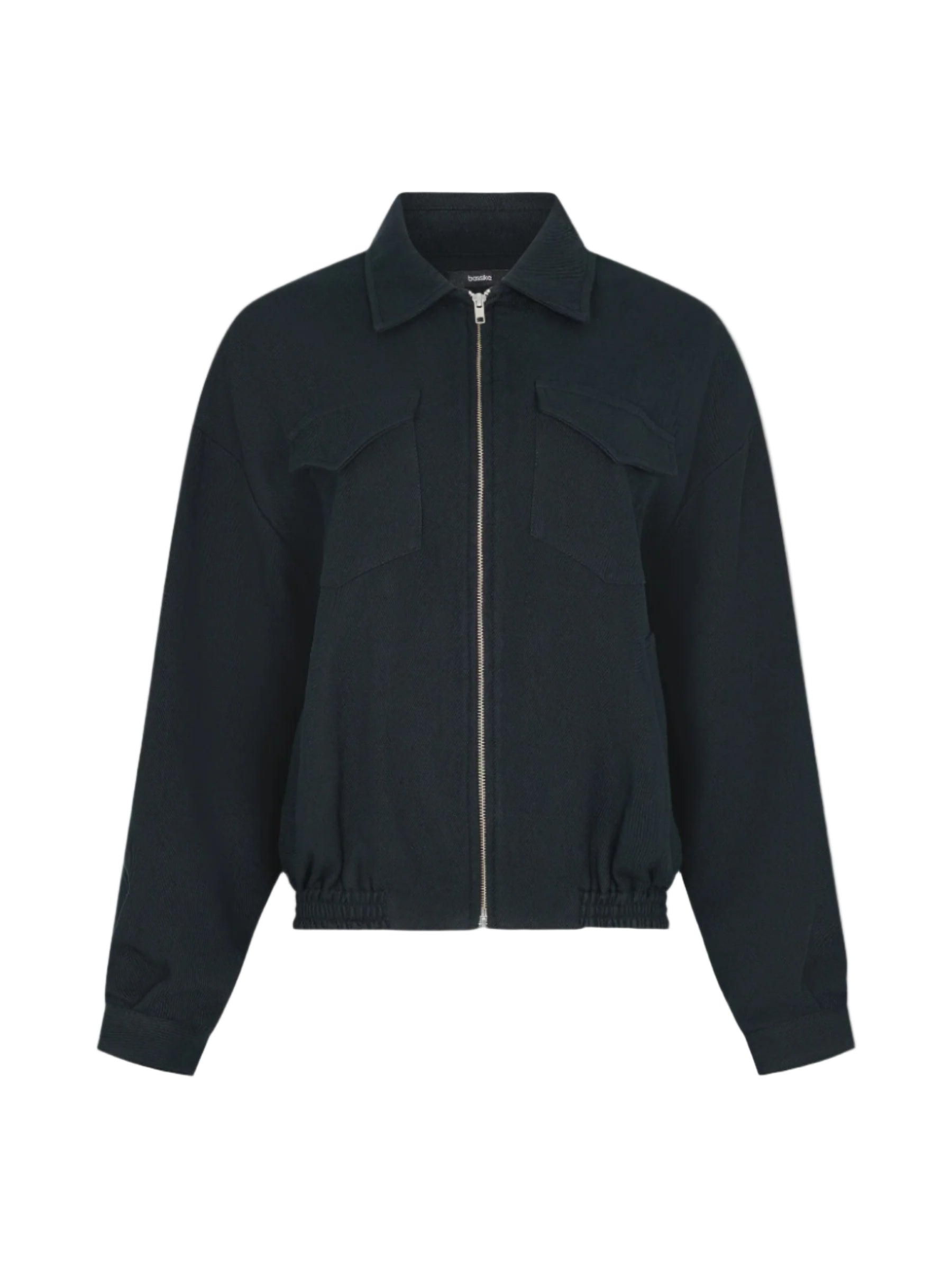 Bassike Raised Twill Western Jacket in Black. Crafted for high-repeat wear, the Raised Twill Western Jacket is designed for an oversized, slouchy fit. Made from a raised twill weave in 100% cotton, its double-woven jersey technique creates a soft handfeel with a structured drape. This fully lined style features western-inspired front patch pockets with flaps and concealed snaps, welt pockets at the sides, and an elasticated hem band. Finished with a centre-front open-ended zipper and subtle sleeve tucks at the cuff seam.