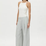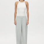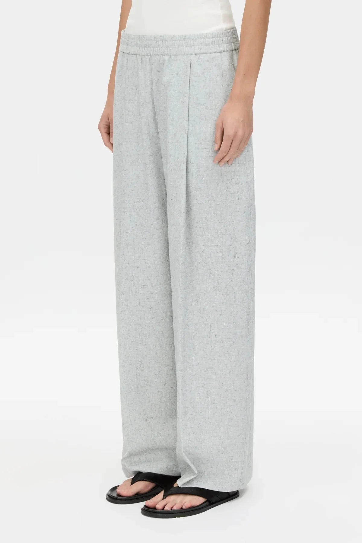 CAMILLA AND MARC Alta soft suiting mid-rise pant in blue marle. Encased elasticated waistband, deep tucks at front, side seam pockets, blind hem.
