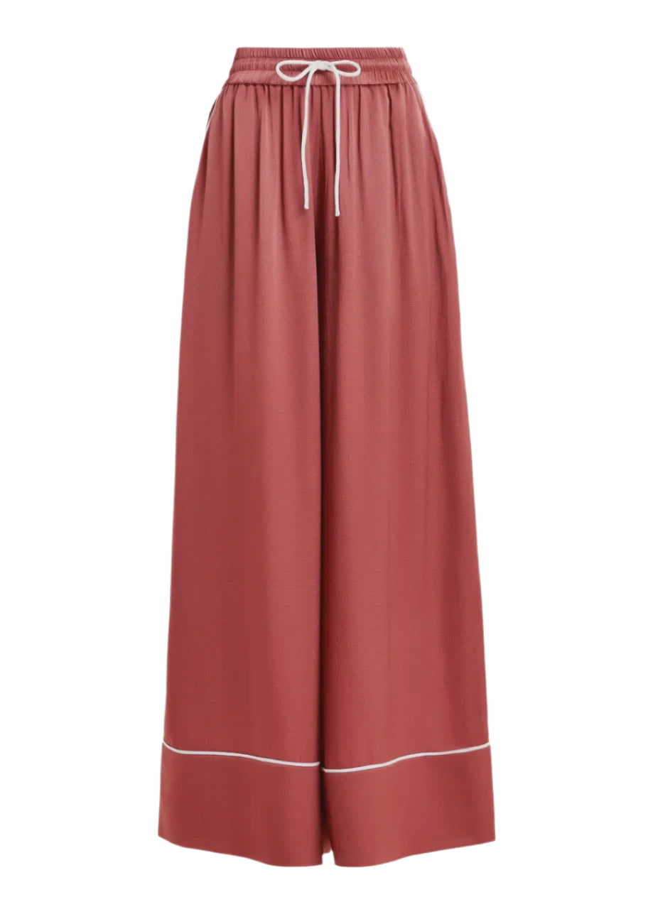 Essentiel Antwerp Hontgomery Pant in Burnt Coral. Pants are made from a lightweight viscose fabric that features a subtly textured finish. They sit comfortably high at the waist and easily adjust for the perfect fit thanks to the drawstring fastening. The fluid, relaxed silhouette is complemented by contrasting white stitching along the hem and waistband, adding a refined, sporty touch.