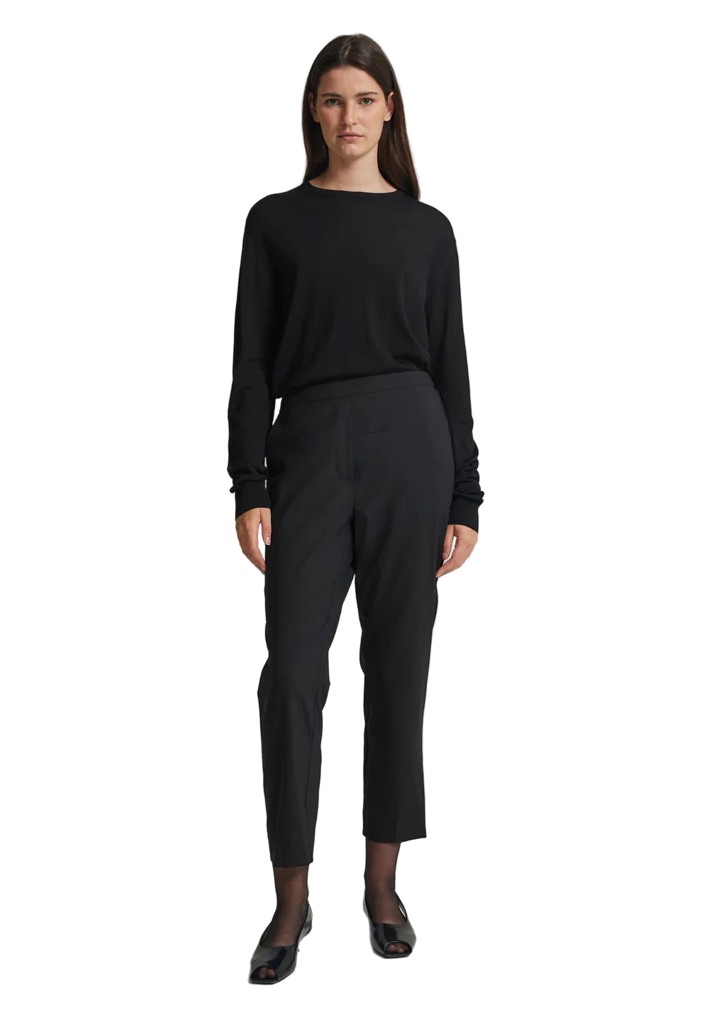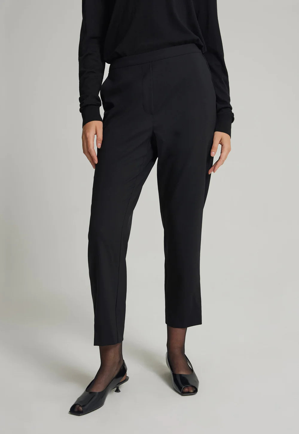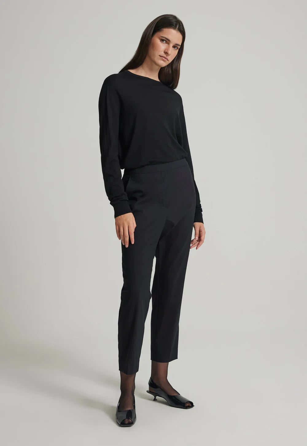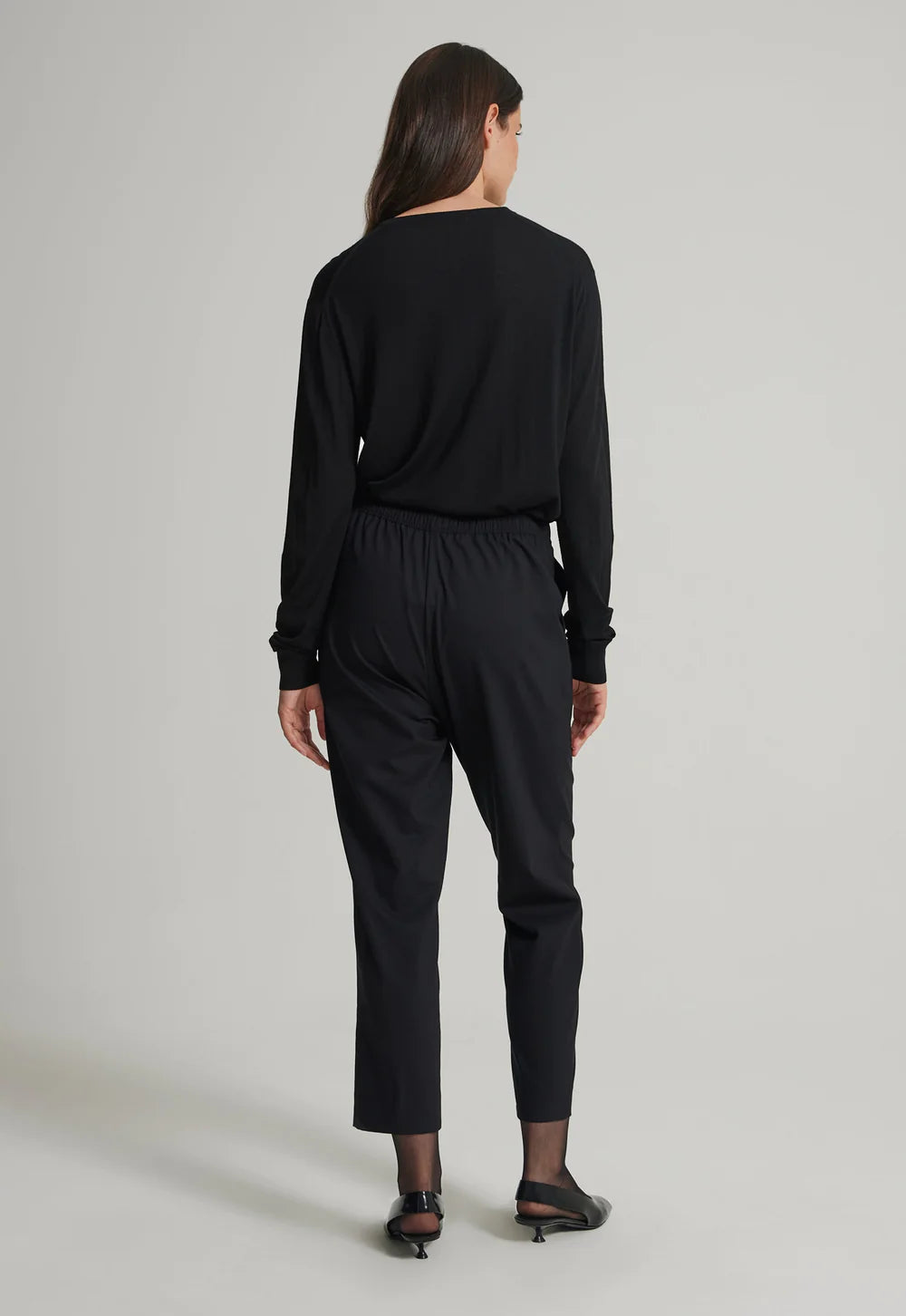 The perfect slim line pant. This trouser is crafted from Italian wool that is light enough in weight to wear all year round. Elasticated for comfort, this slim line style can be worn sitting on the waist or at the hip for a more relaxed look. Fashioned with discrete side pockets and minimal detailing, this piece can be dressed up with an over-scaled silk top or adopt a more casual approach and wear with tee’s and your favourite sweater.