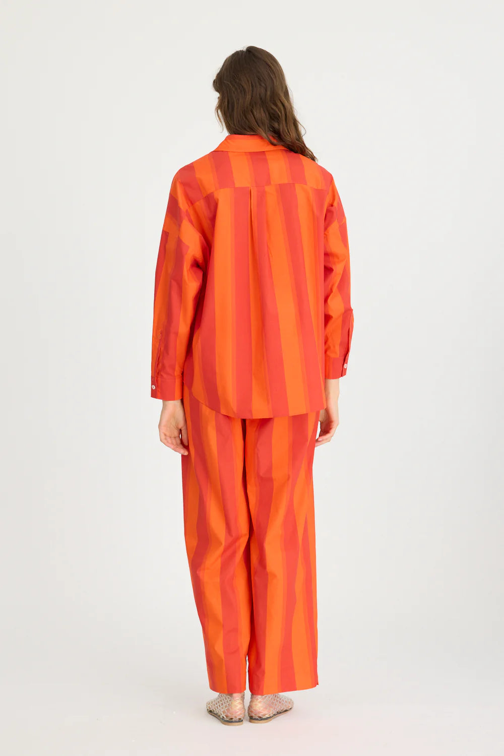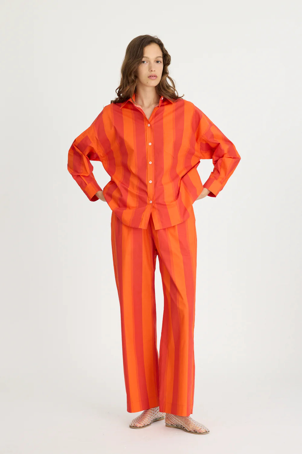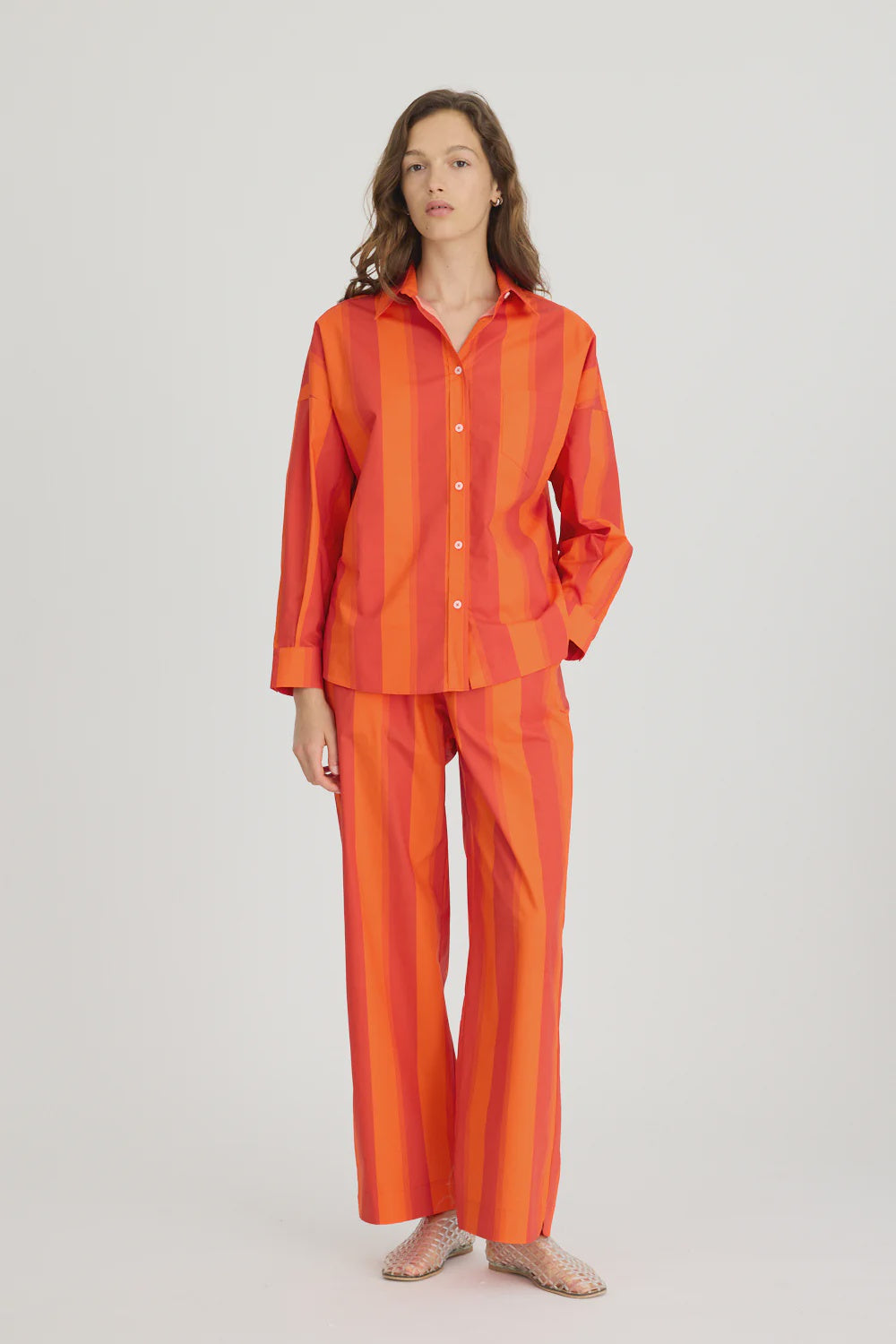LMND Bahia Pants in Spicy Orange Stripe. Crafted from 100% cotton and yarn-dyed for depth and durability, the Bahia Pants bring a bold, LMND twist to everyday dressing. Lightweight and breathable, they’re made for warm days in the city or holidays by the sea.