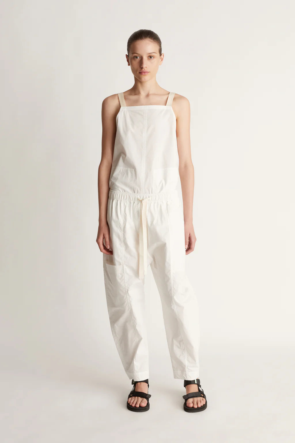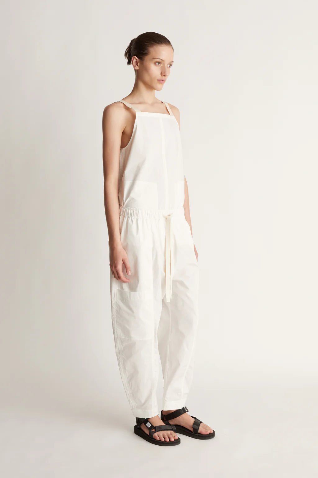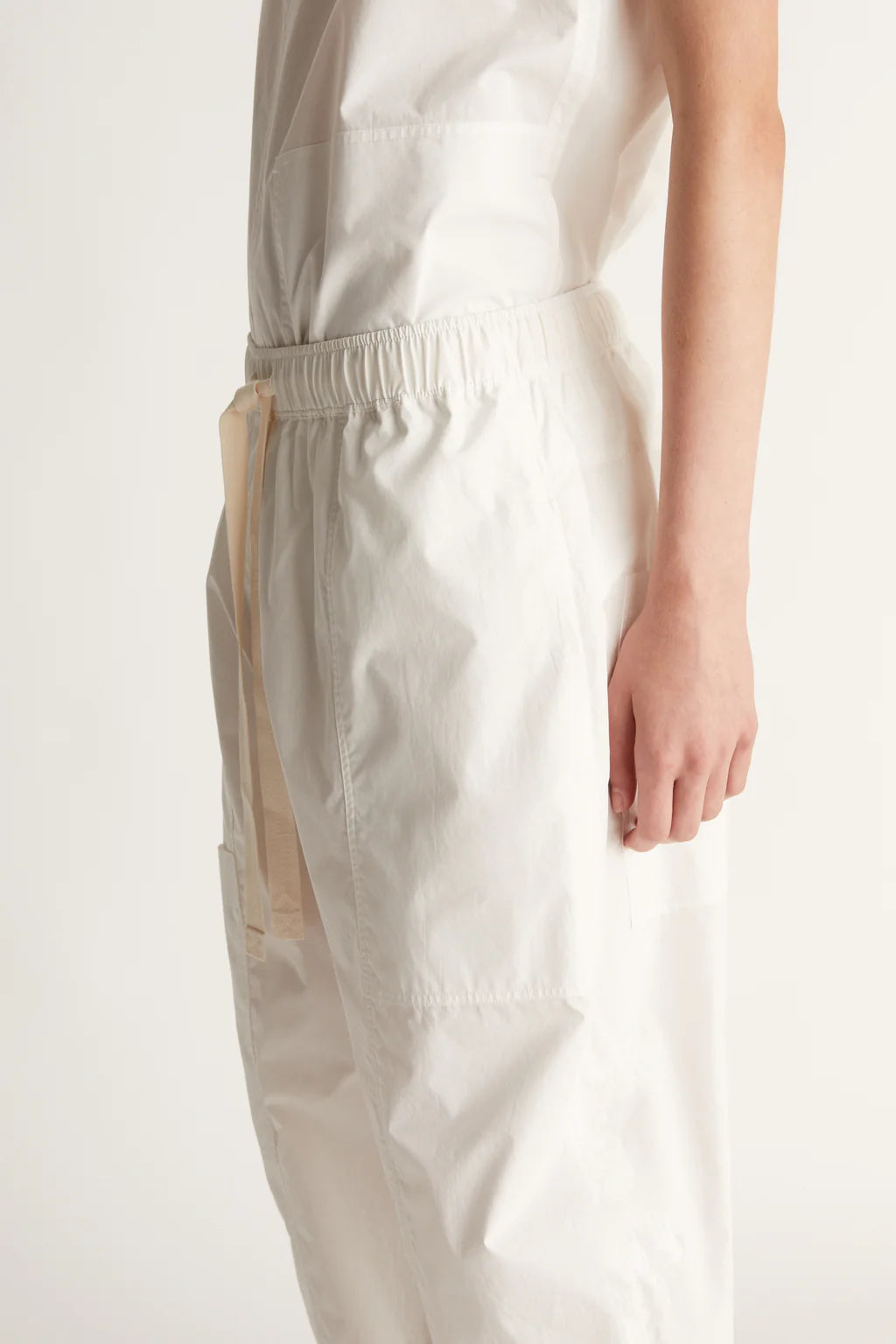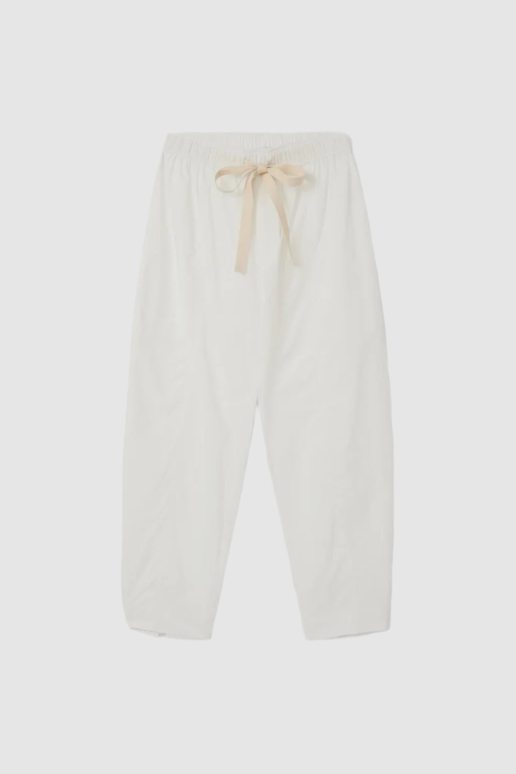 Lee Mathews Poplin Pant in Natural. The LM Poplin Pant in Natural from the Workroom collection is made from organic cotton poplin. This everyday pant features an elastic waistband, herringbone drawcord, side pockets and, a rounded leg. Style these pants with shirting for a chic relaxed look.