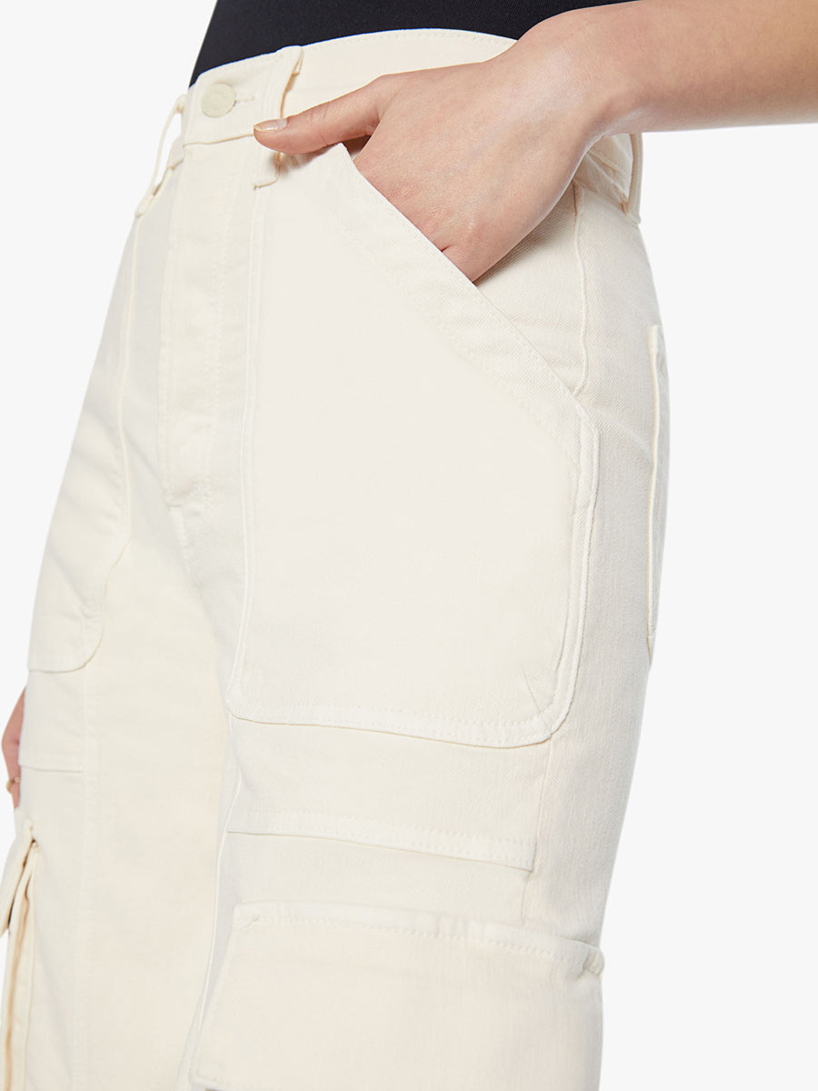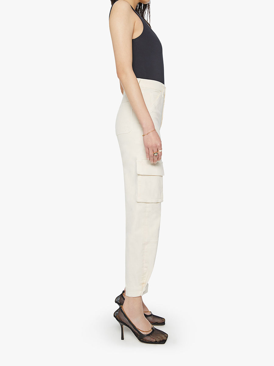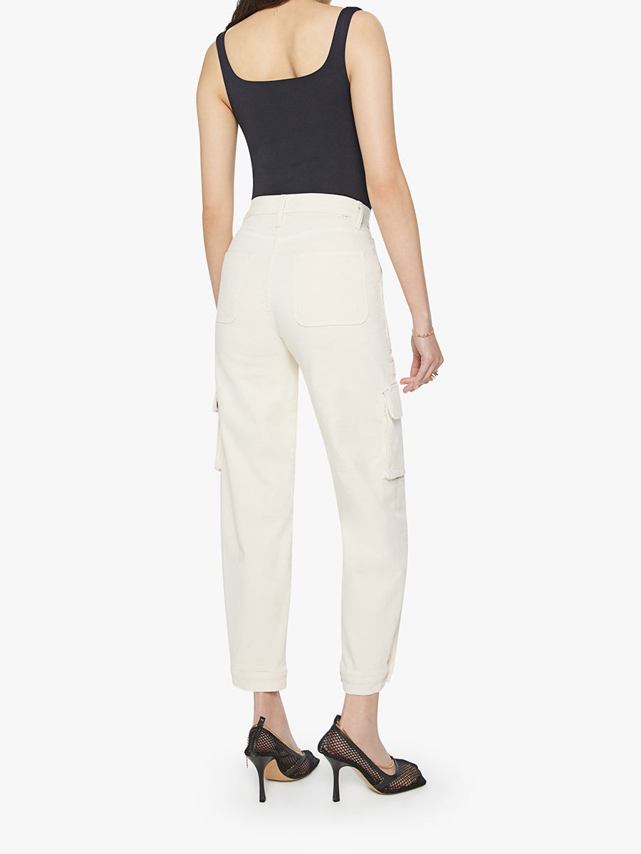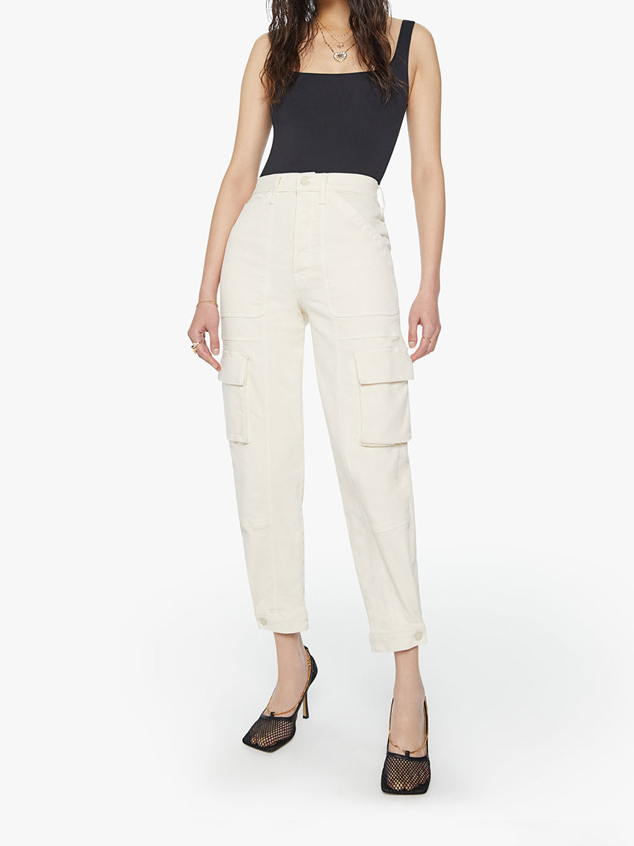 Sip happens. A super high waisted cargo pant with a barrel leg, patch pockets and a long inseam with snaps at the hem. Made from stretch cotton, Eggnog is a creamy, off-white color. Pairs well with rum and holiday parties.