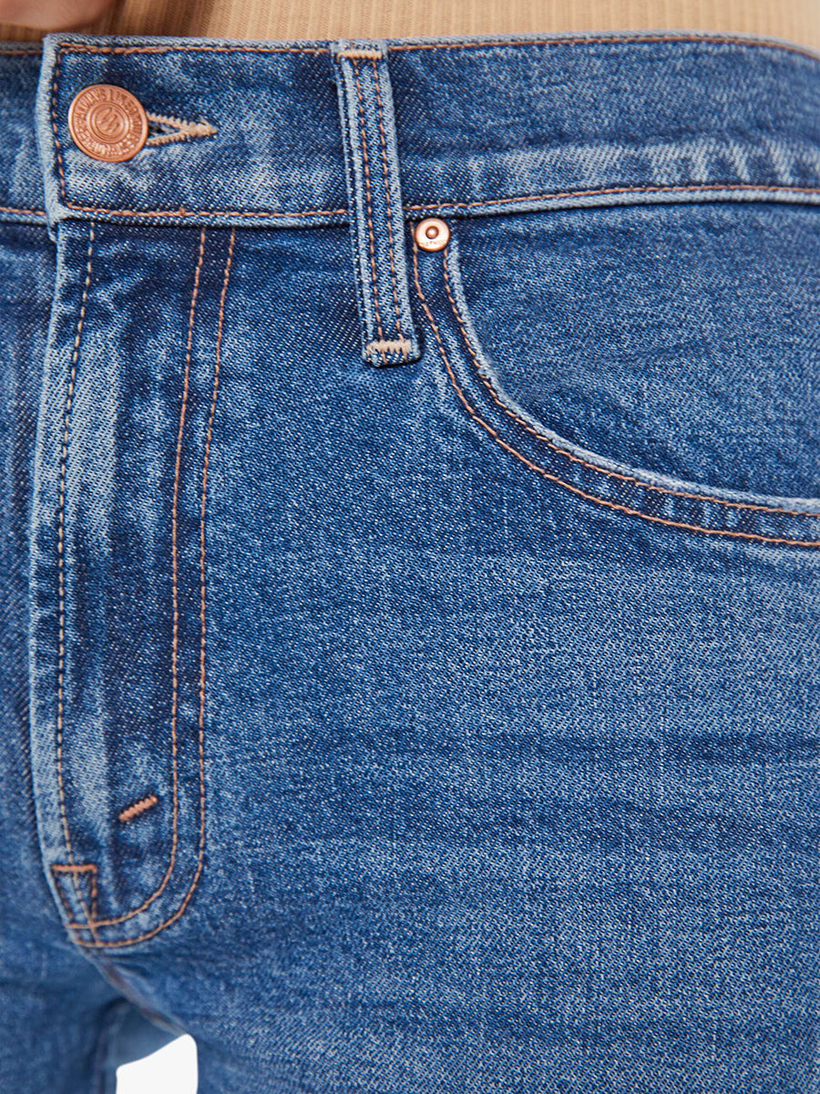 Isn't that charming. A mid-rise straight leg with an ankle-length inseam and a frayed hem. Cut from denim with a touch of stretch, Local Charm is a mid-blue wash with whiskering and fading at the knees.