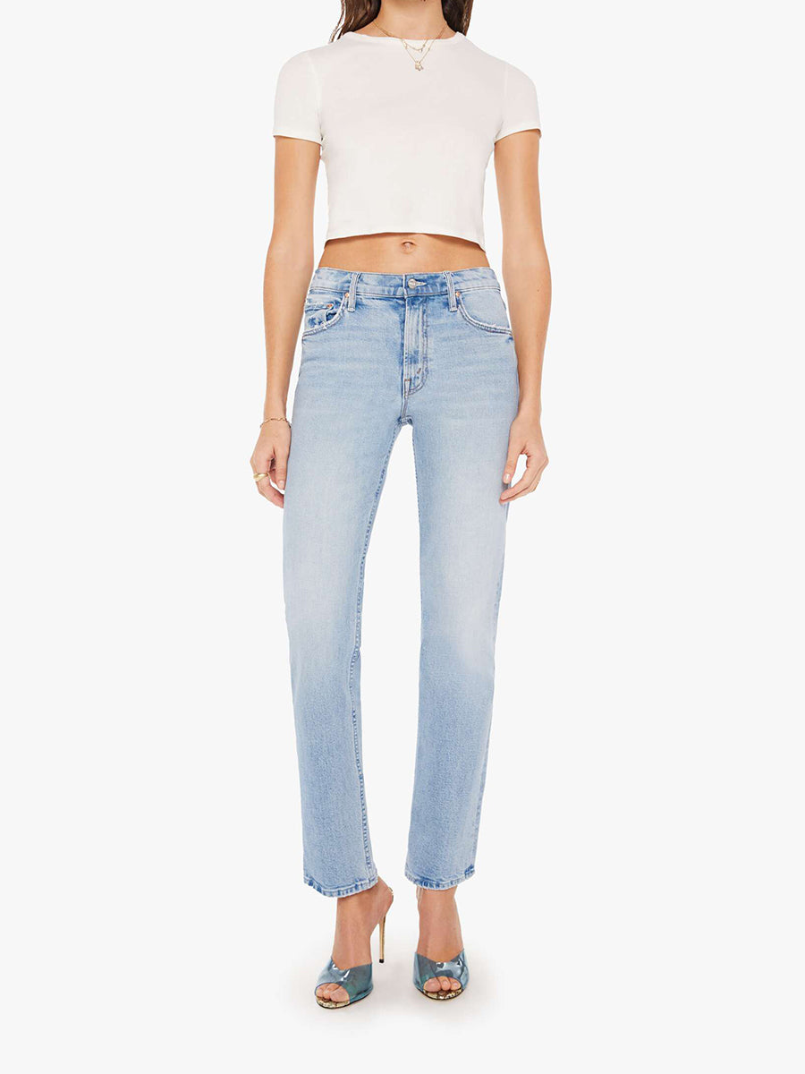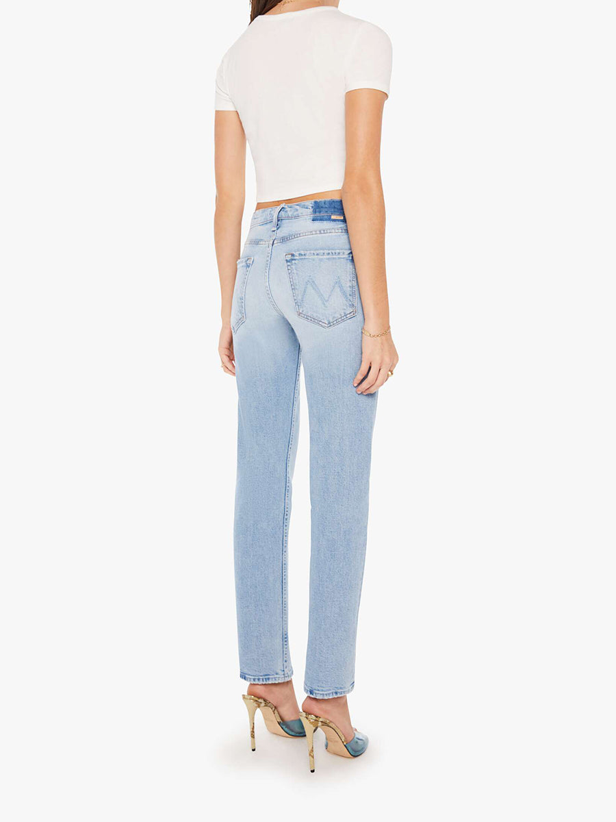 High-rise jeans with a narrow straight leg and a 31-inch inseam with a clean hem. Cut from semi-rigid SUPERIOR denim, Don't Be A Square is a light-blue wash with subtle fading, whiskering and distressed details throughout.