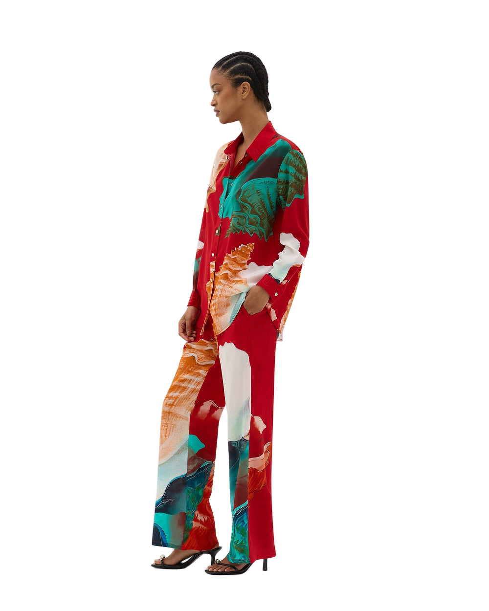 Muma World Murex Silk Pant in Red. The Murex Silk bias-cut pants feature a bold expression of the Murex Shell & accompanying shells of the Mediterranean. With a loose, flowing silhouette that drapes beautifully to the ankles, they offer both comfort and sophistication. Together with the complementing shirt, they create a cohesive, eye-catching look. This co-ordinated set whether paired together or contrasted with other stories, is perfect for making an elevated statement with ease.