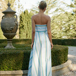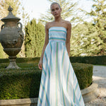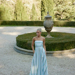 Aston Studio Hazel Dress in Baby Powder Stripe. Reimagined in our exclusive Baby/Powder Stripe, the Hazel Dress exudes timeless elegance. With its strapless neckline and voluminous circle skirt, this classic silhouette effortlessly moves from one occasion to the next, offering a refined balance of sophistication and versatility.
