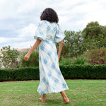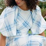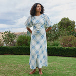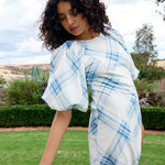 Aston Studio Lucinda Dress in Cerulean Plaid. This charming dress blends vintage elegance with modern ease. Featuring a flowing midi silhouette, it showcases a soft blue plaid pattern on a crisp white background. The voluminous puff sleeves add a touch of drama, while delicate ruching at the waist enhances the feminine shape. Light and airy, this dress is perfect for warm-weather outings, offering both comfort and effortless style.